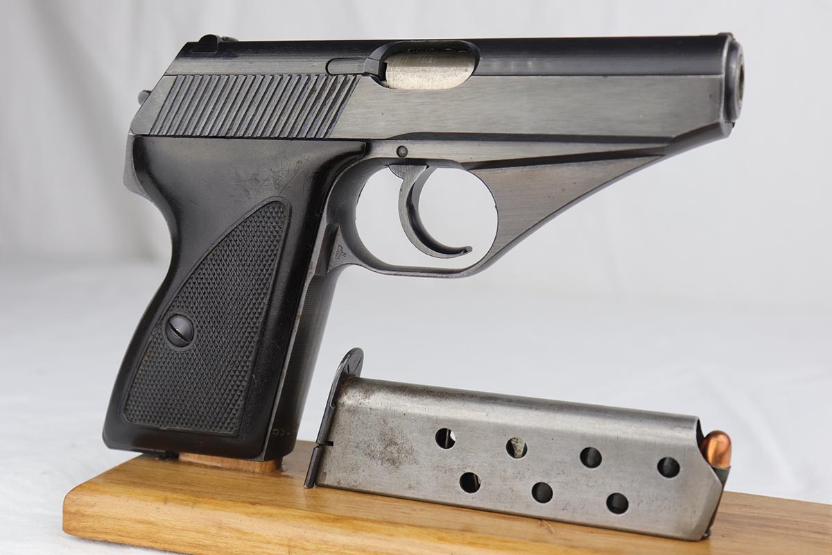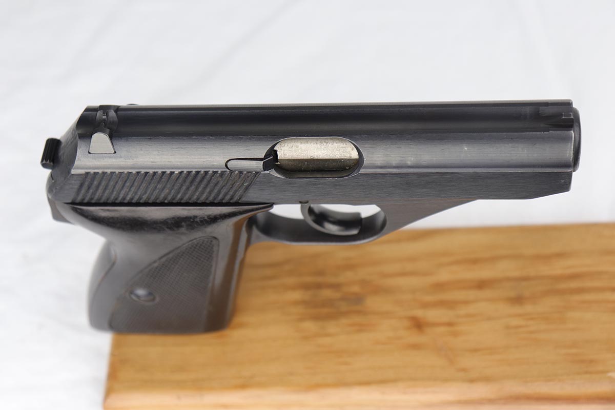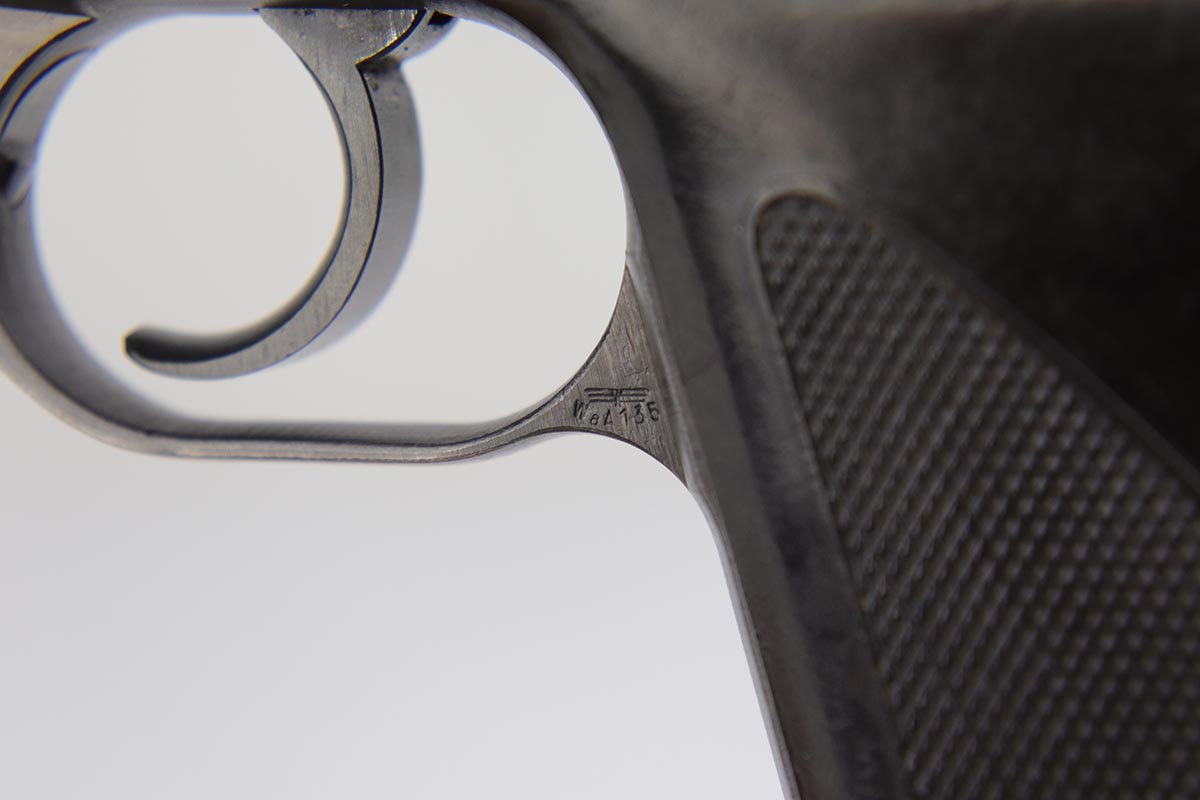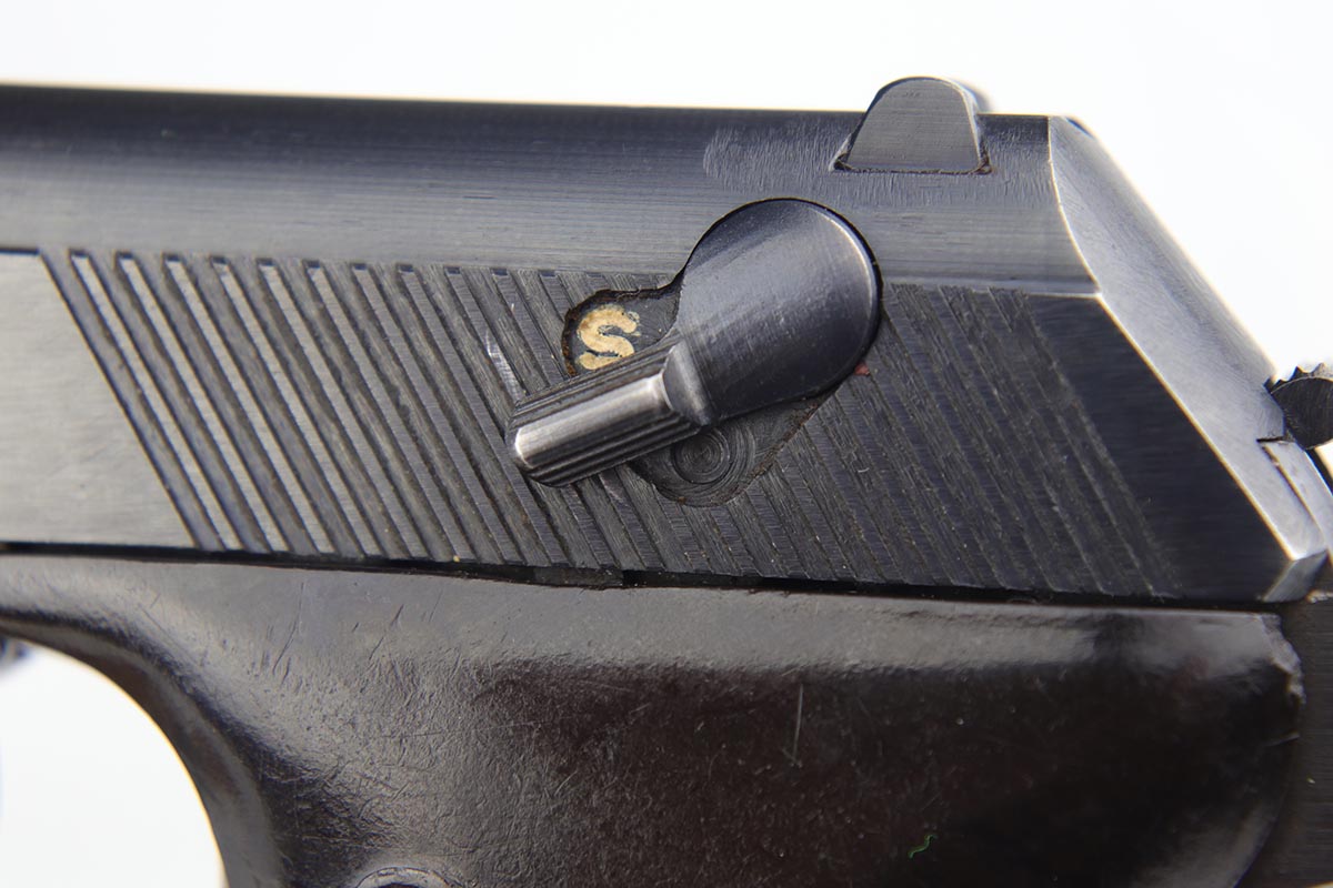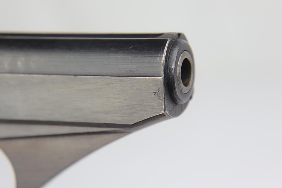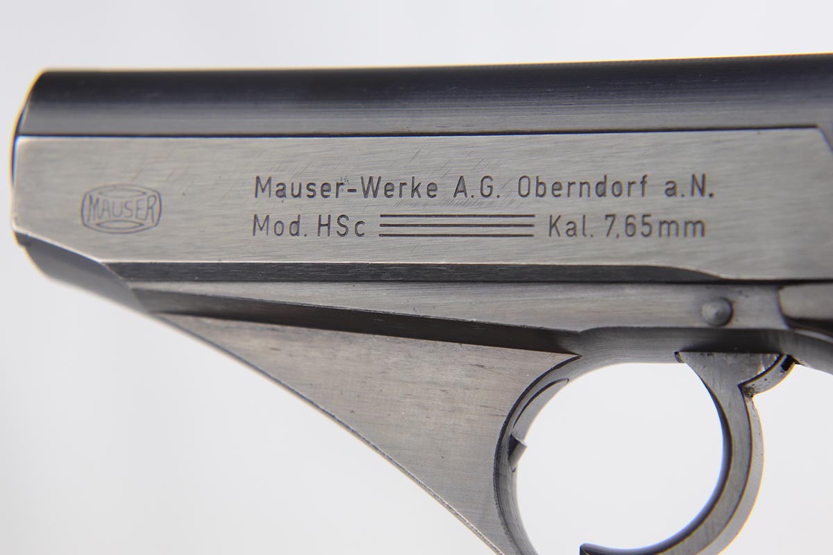 1/9/19 – This is a late WW2 production Mauser HSc pistol. The pistol has a late war dull blued finish that’s in about 96-97% condition. Almost all of the wear on this gun is on the front and back straps. The front strap has some thinning and a small area of dark patina / beginning signs of rust. The back strap has thinning as well with light brown patina throughout. Comes with late war bakelite grips. There’s very minor chewing on the base of the left panel near the front strap (front corner of the base). The bore is 9/10 with very light frosting but overall excellent. Beautiful late war example. Guaranteed original and authentic.
