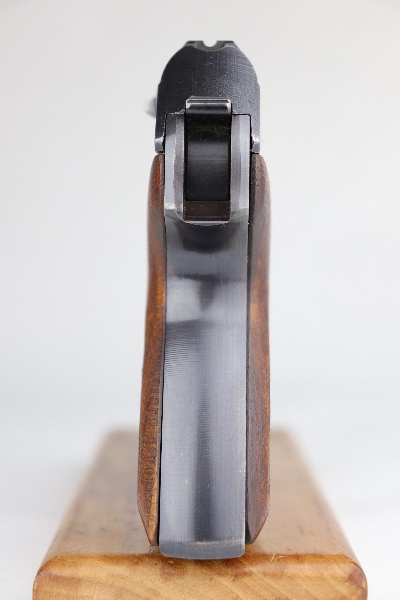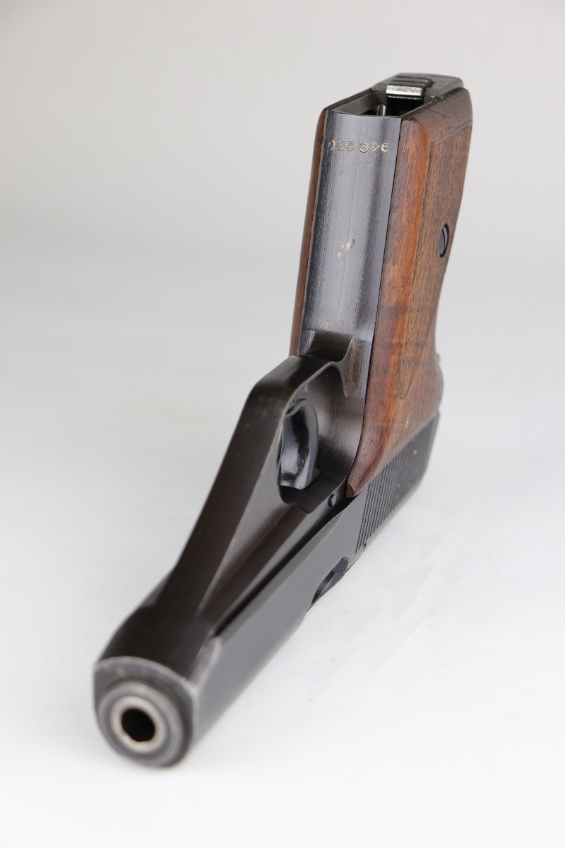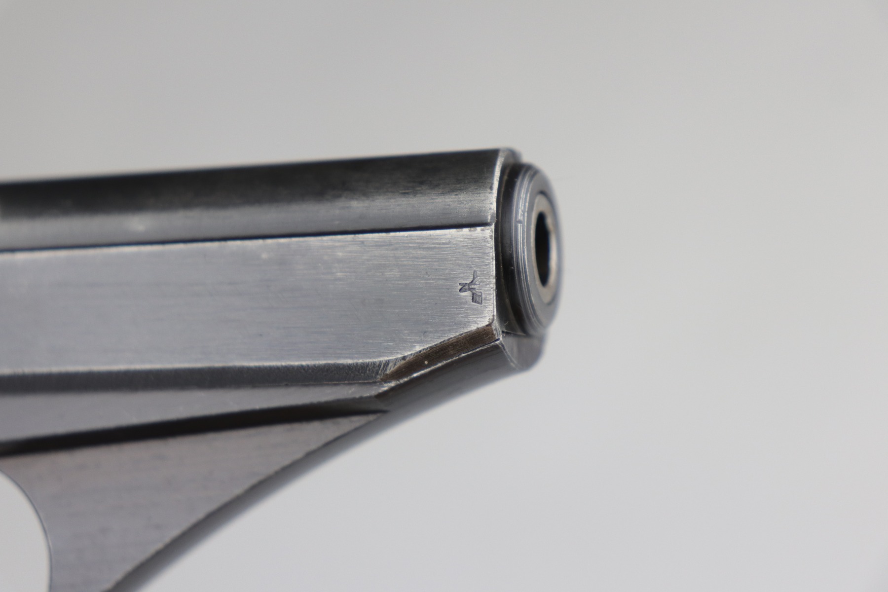 5/14/20 – This is an original, late-WW2, Nazi Mauser HSc pistol, manufactured in 1945. It properly “Eagle 135” waffenamt. Overall, this pistol is in excellent condition. It has retained around 97-98% of its original bluing. There is minor finish wear around the muzzle, a few micro scratches on the slide, and one very small spot of wear on the front strap. It has original grips in excellent condition. It comes with a proper wartime magazine in very nice condition. The bore is minty. The gun is fully functional.
