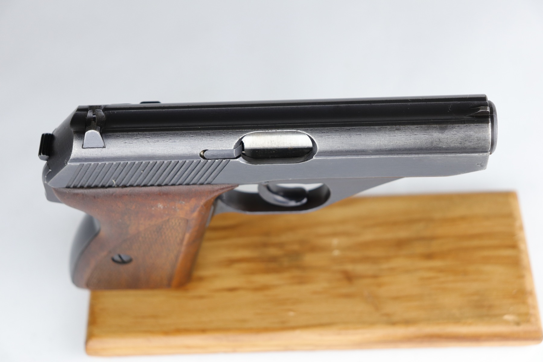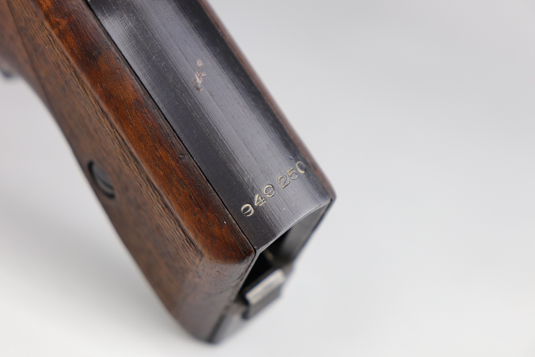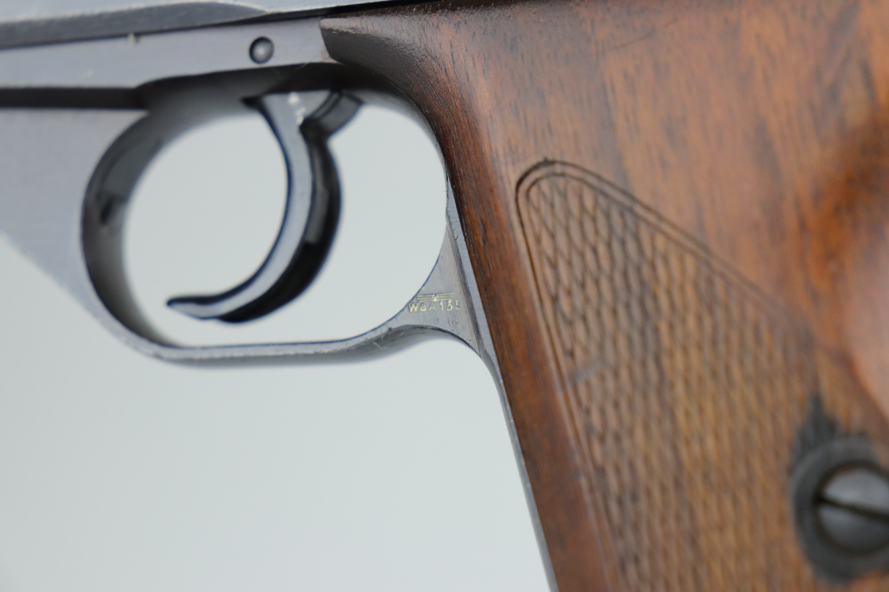 5/14/20 – This is an original, late-WW2, Nazi Mauser HSc pistol, manufactured in 1945. It properly “Eagle 135” waffenamt. Overall, this pistol is in excellent condition. It has retained around 97-98% of its original bluing. There is minor finish wear around the muzzle, a few micro scratches on the slide, and one very small spot of wear on the front strap. It has original grips in excellent condition. It comes with a proper wartime magazine in very nice condition. The bore is minty. The gun is fully functional.
