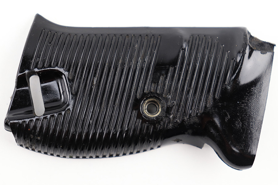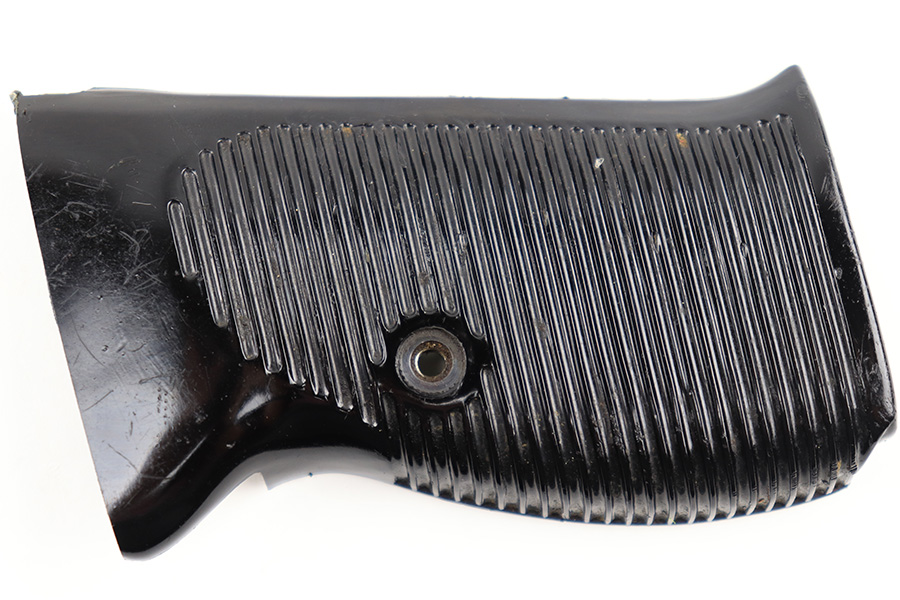 8/21/23 – This is a pair of late WW2 production lightweight black plastic P.38 grips. The grips are in great condition with some light surface wear such as scuff marks and surface scratches. No major cracks or chips. The top of each panel has evidence of light shaving, which was a practice done by the Russians upon capturing P.38’s. This helped with clearance of the safety switch and smoother slide operation. No screw included.