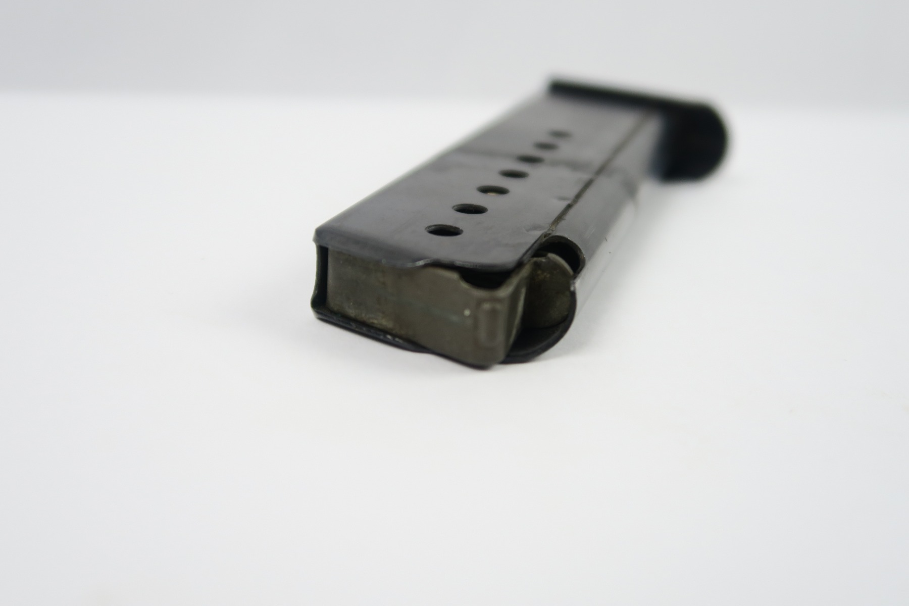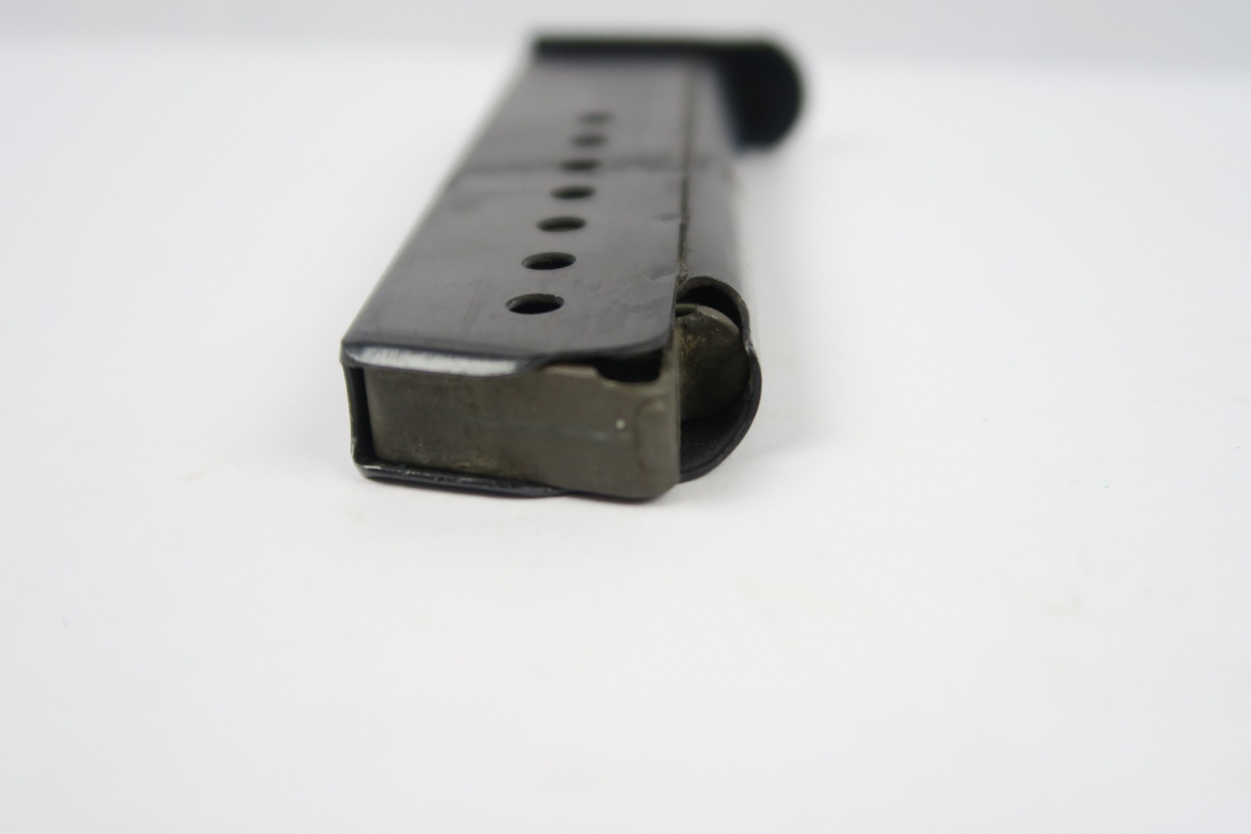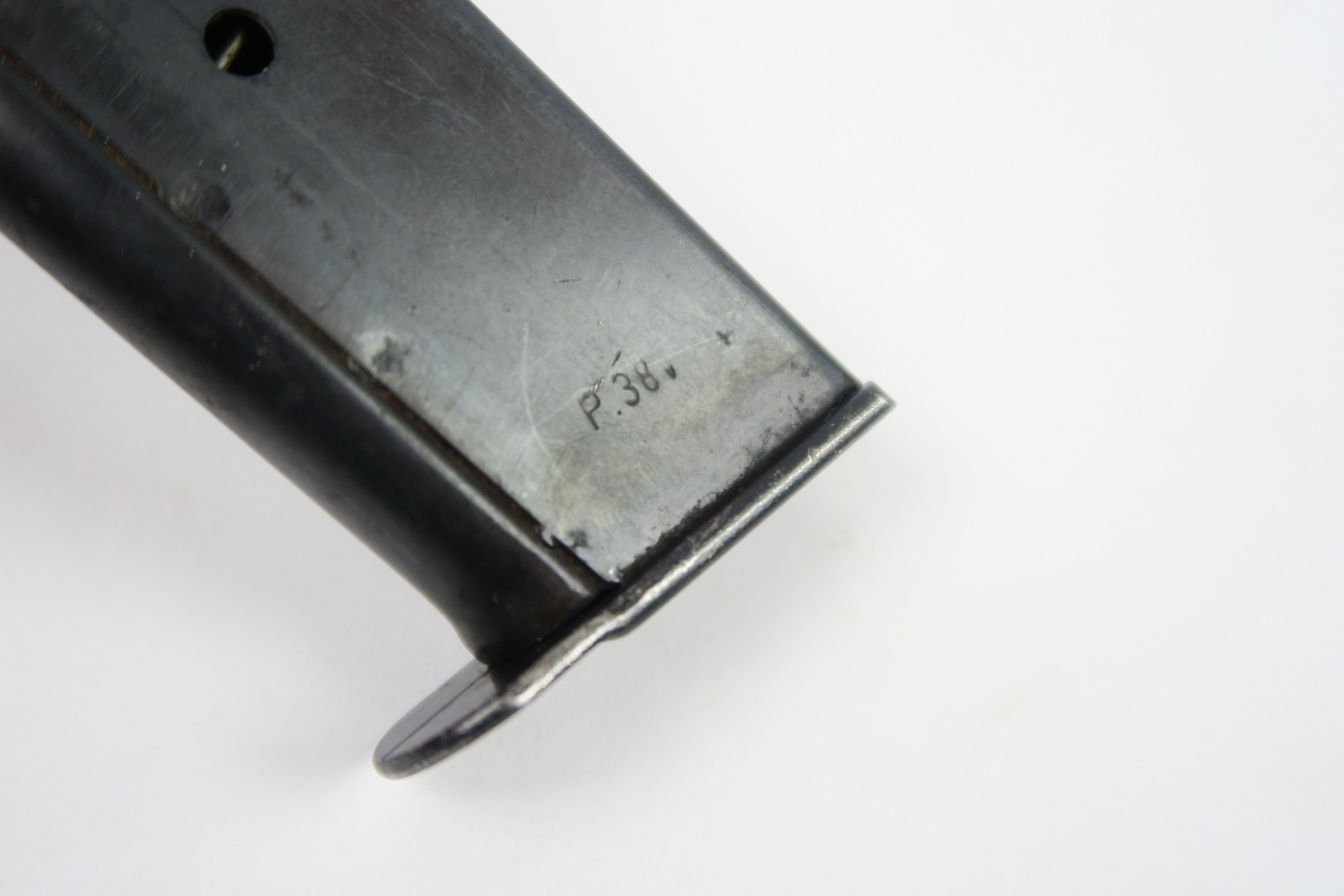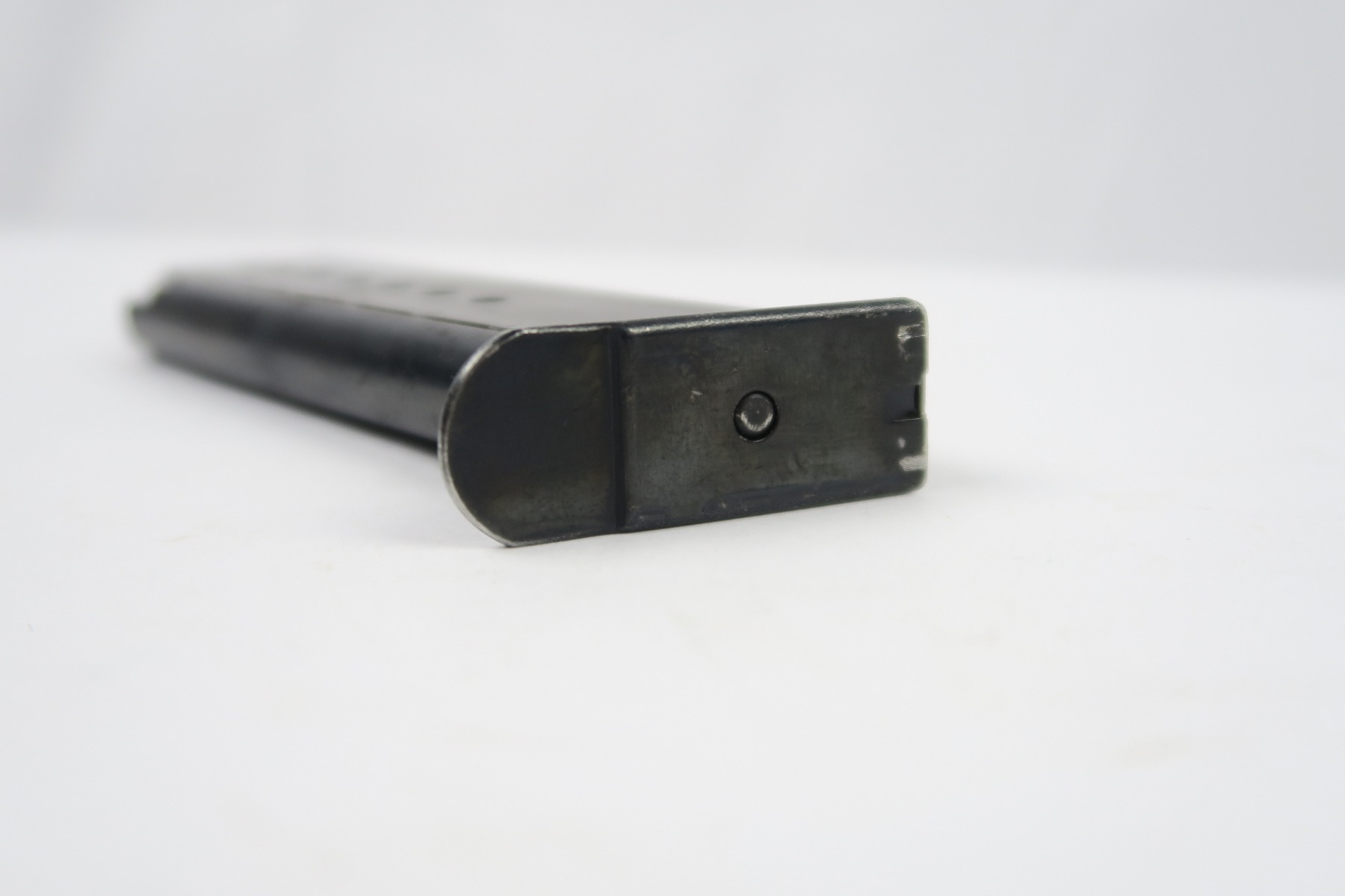 2/10/18 – This is an original WW2 production P.38 magazine. The magazine is P.38v marked on the side of the frame, but there are no other markings. This is slightly unusual, because even late WW2 magazines tend to have at least a proof stamp on the spine. The magazine is most likely end-of-war due to the phosphate follower and lack of proofs. The magazine has no rust or pitting but there is some light patina on the frame. The bluing is a semi-two tone as well which is unique. Guaranteed original and fully functional.