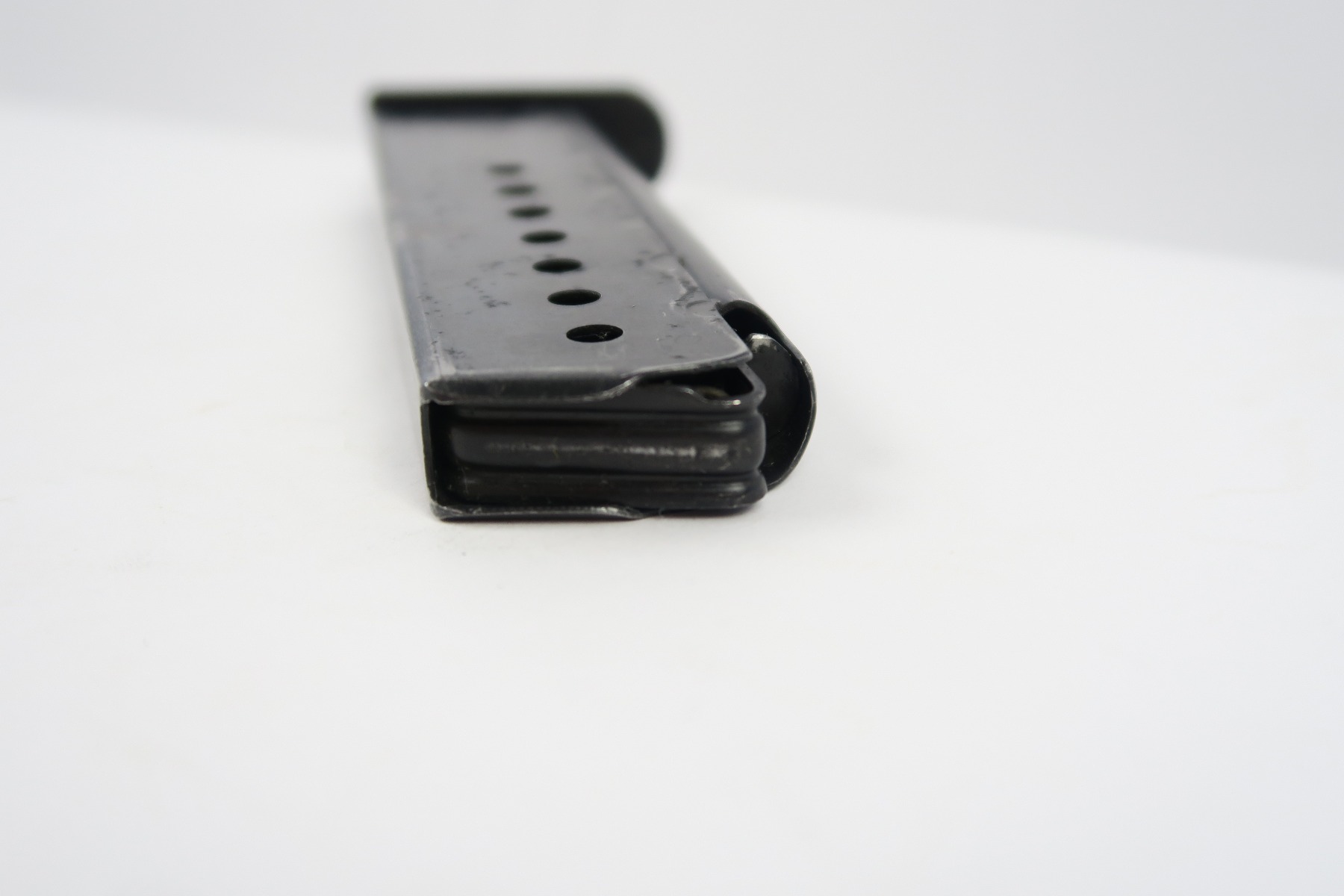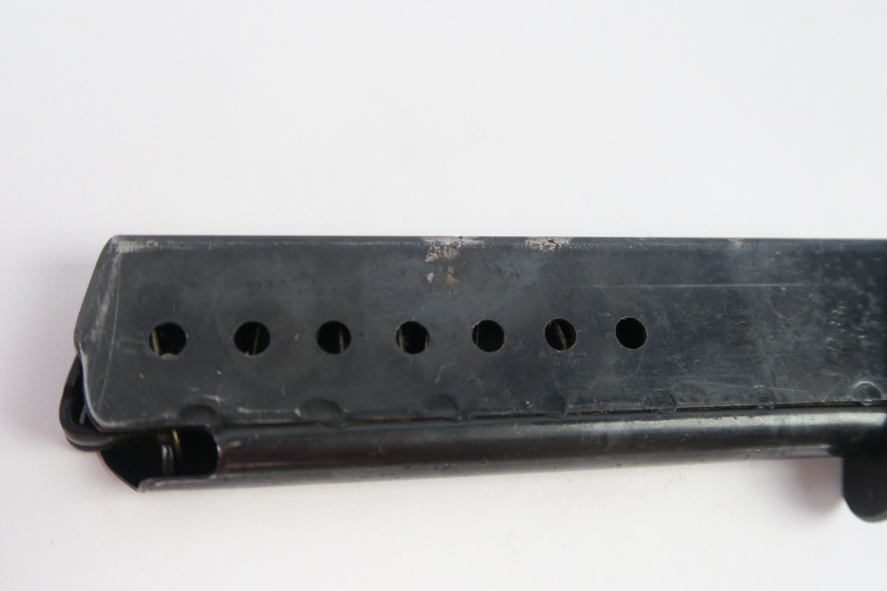 2/15/18 – This is an original P.38 magazine made at the end of WW2. The magazine is stamped “P.38v” with a “U” underneath for unhardened metal. The magazine also has a ribbed follower, which is a late production feature as well. The magazine has some light spotting wear on the frame but no major issues. The spring is strong and fully functional.
