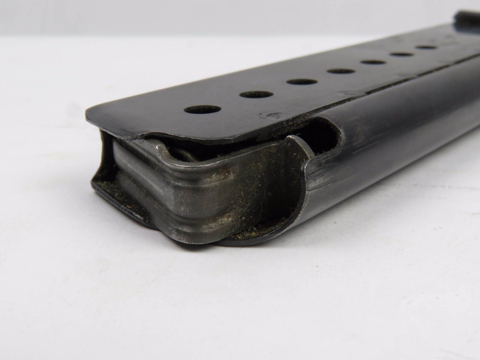11/20/17 – This is an original end-of-war production P.38 magazine. The magazine has a ribbed follower, a feature unique to last-ditch production. There is no military acceptance proof either. The magazine frame is stamped P.38v. The magazine has light pinpricking near the P.38v stamp – but no other notable flaws. Guaranteed original.