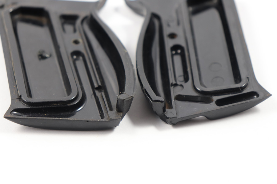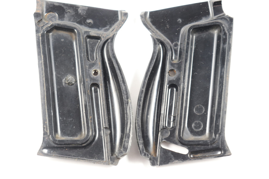 12/4/18 – This is an excellent pair of original, late WW2 production Polyamid P.38 grips. The grips are made from lightweight plastic-like material used by Mauser at the end of WWII as supplies ran low. These are also known as “Perlon” grips. 8th variation with a distinct injection mark where the hot Polyamid was injected and cut off. Perfect for byf44 and svw45 pistols (dual tones as well). The grips have no cracks or deep cuts, but the exteriors do have a few light surface scratches. Overall excellent condition and guaranteed original.