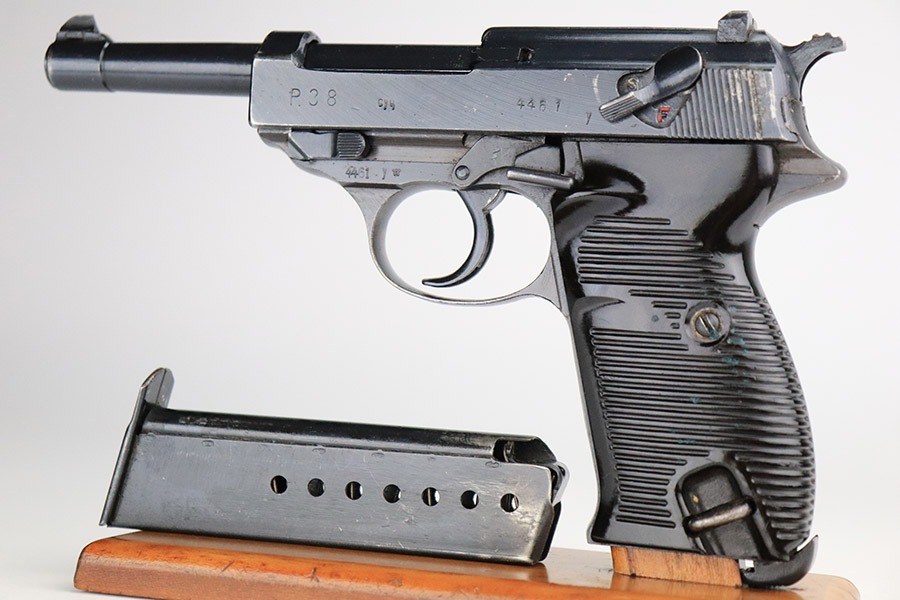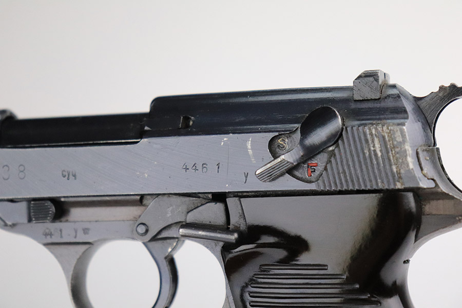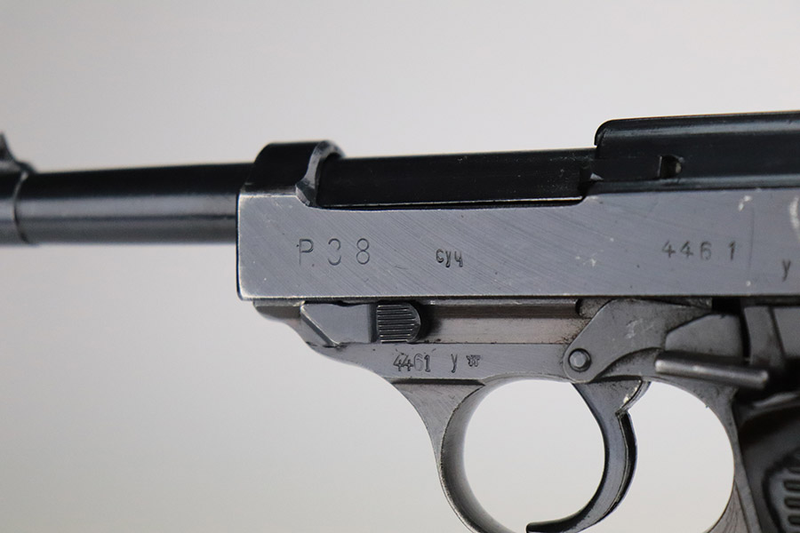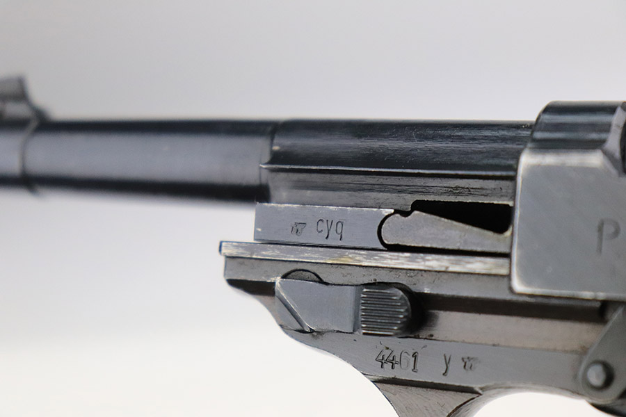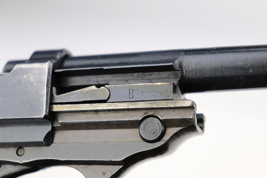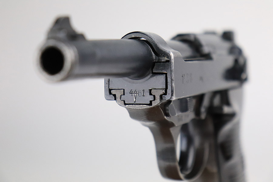 11/8/22 – This is an excellent example of a Spreewerk P.38 issued to the Nazi military in January of 1945. It is all matching and has the proper “Eagle 88” military acceptance proofs throughout. This one also has a late-war cog-style hammer. It has retained about 96% of its original finish. There is minor wear around the muzzle and on the front edges of the slide. Some spotty discoloration at the back of the slide on both sides. Minor thinning on the front strap. Comes with excellent blackish-brown bakelite grips and a period-correct jvd magazine. Mint bore. De-cocker is functional.