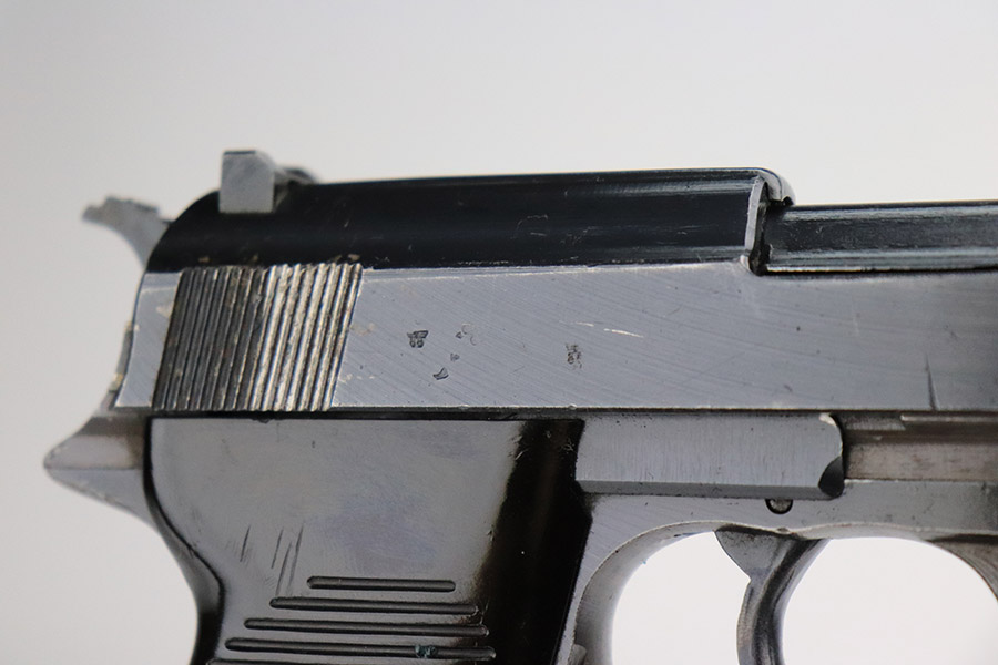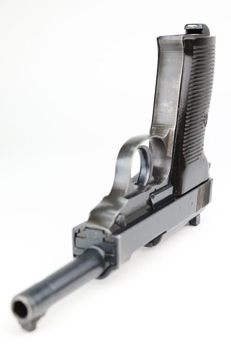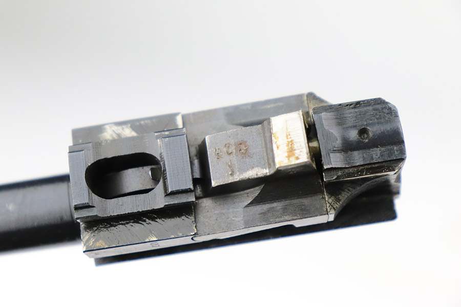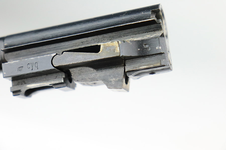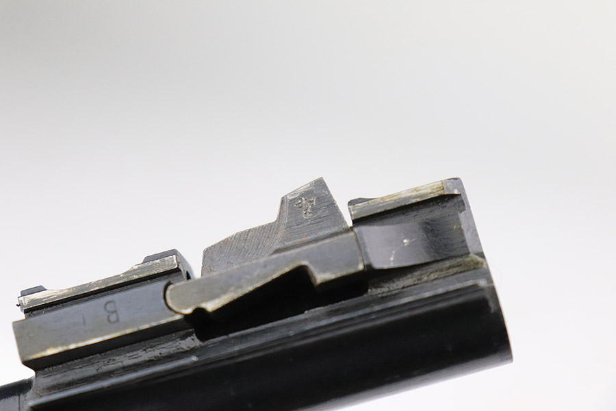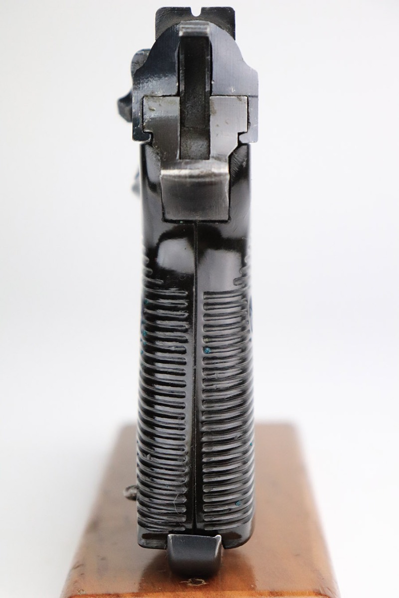 11/8/22 – This is an excellent example of a Spreewerk P.38 issued to the Nazi military in January of 1945. It is all matching and has the proper “Eagle 88” military acceptance proofs throughout. This one also has a late-war cog-style hammer. It has retained about 96% of its original finish. There is minor wear around the muzzle and on the front edges of the slide. Some spotty discoloration at the back of the slide on both sides. Minor thinning on the front strap. Comes with excellent blackish-brown bakelite grips and a period-correct jvd magazine. Mint bore. De-cocker is functional.