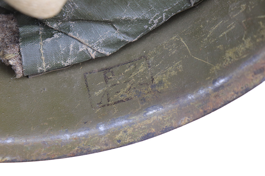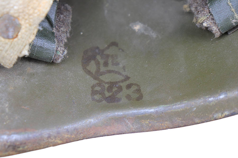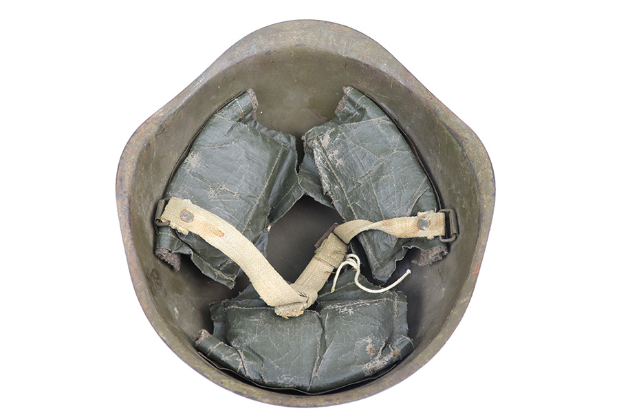 3/9/22 – This is a late WW2 production Soviet SSH 40 helmet. The helmet is in great overall condition despite some typical surface discoloration and aging wear. The shell has no dents or major issues, and the front exterior shows a red Russian star logo. The interior shell has a few ink stamps as shown. The original chin strap and liner pads are still present, but show signs of use and aging.