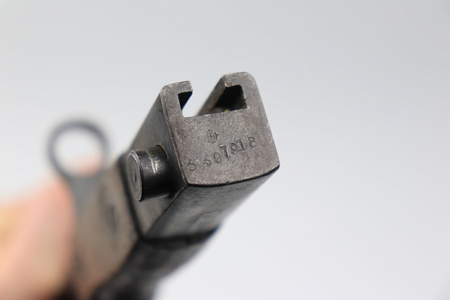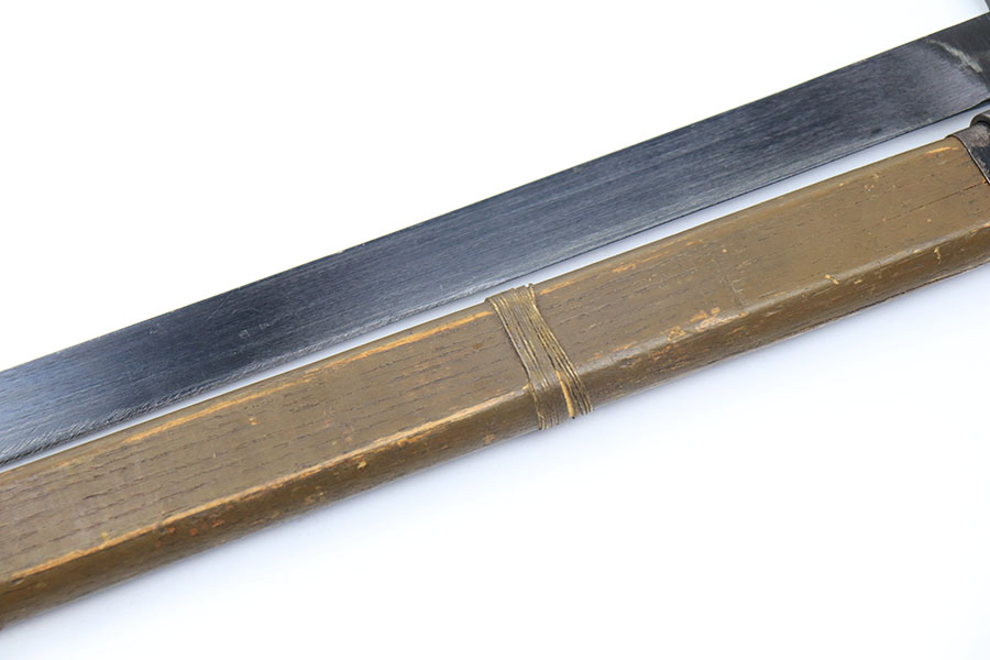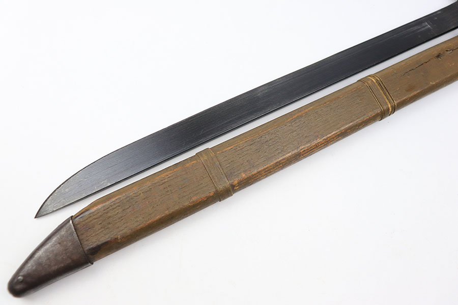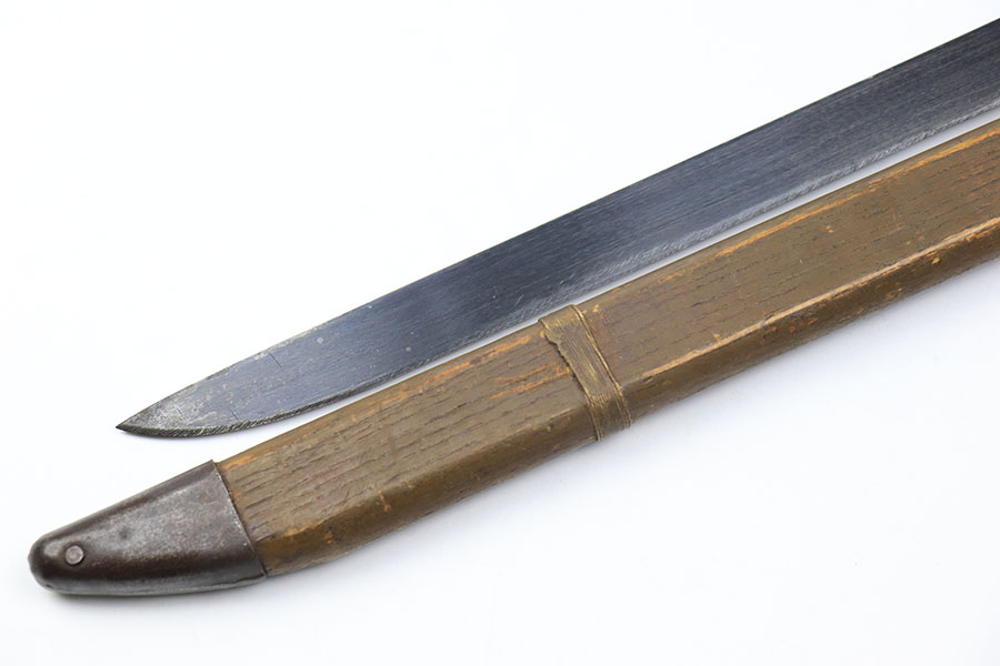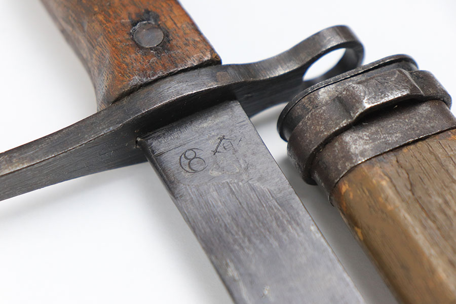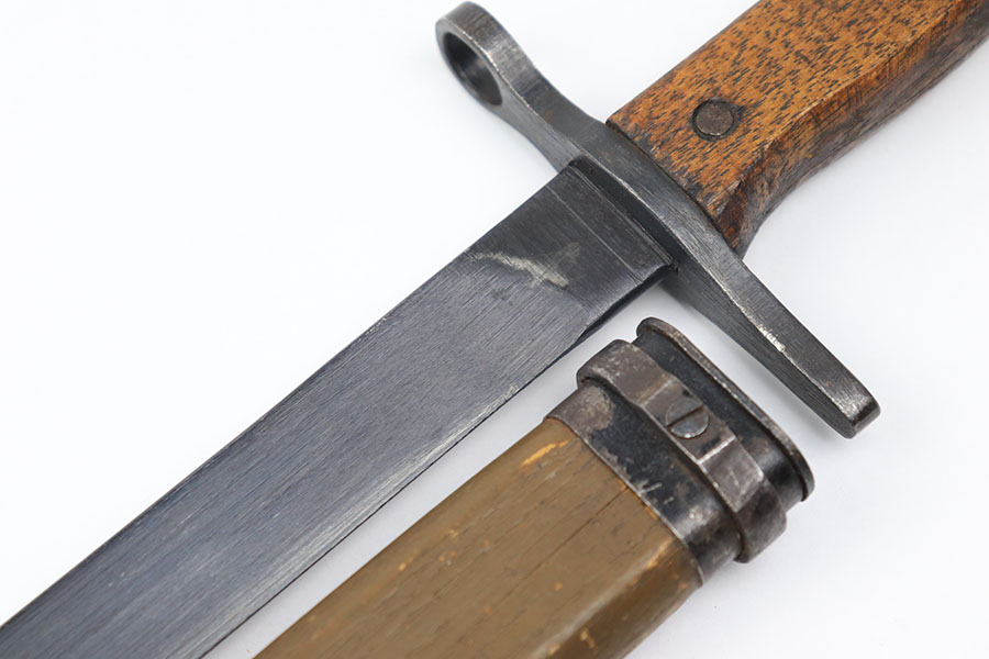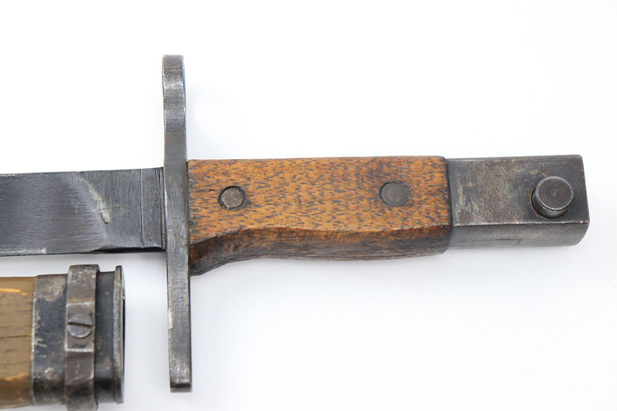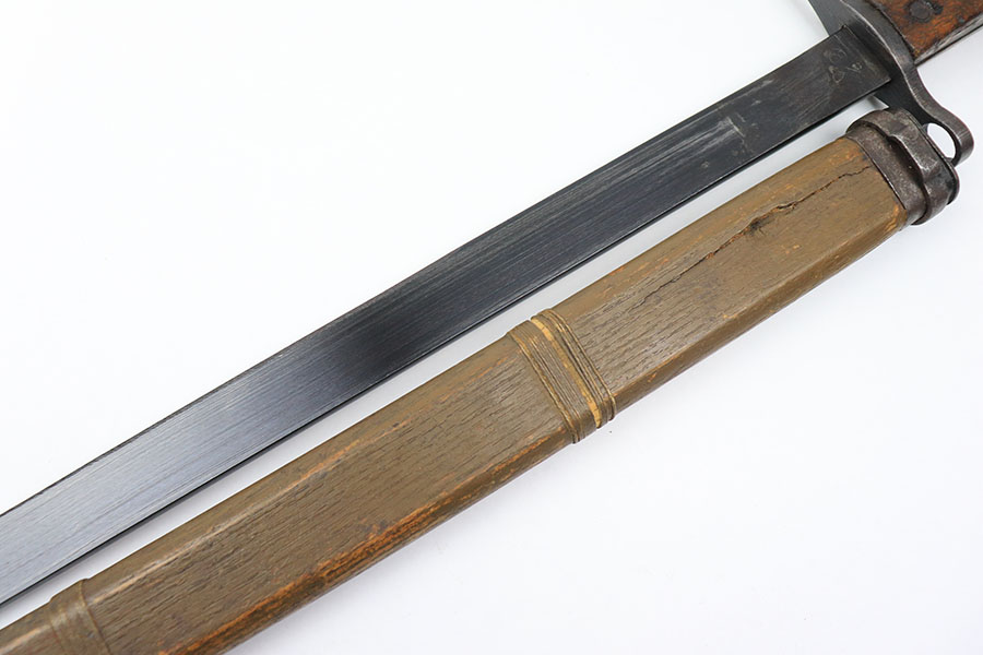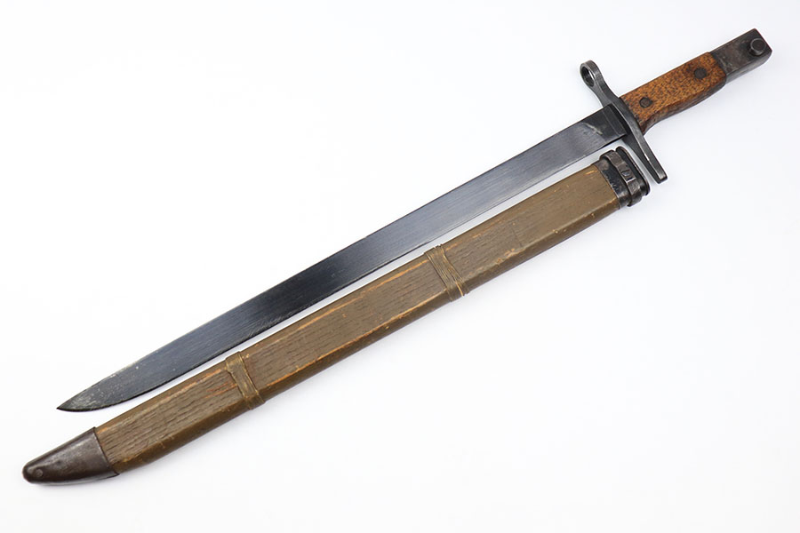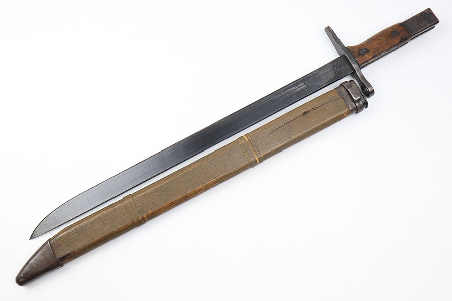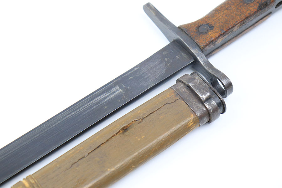 11/22/21 – This is an original Late WW2 example of a Japanese Type 30 bayonet. The bayonet comes with a fairly scarce bamboo wood scabbard. The scabbard has some mild surface wear throughout and patina on the metal toe, but the biggest issue is a crack and indent on one side that extends to the top of the scabbard. The blade is excellent with dark bluing throughout and no rust or pitting. Stamped at the base of the blade. The wood handle has no cracks or chips and typical patina on the pommel.