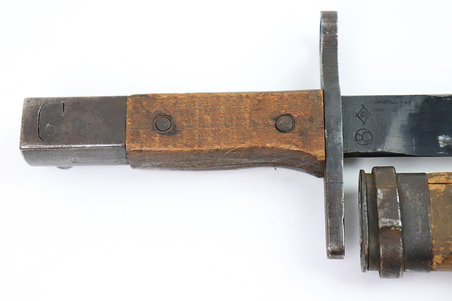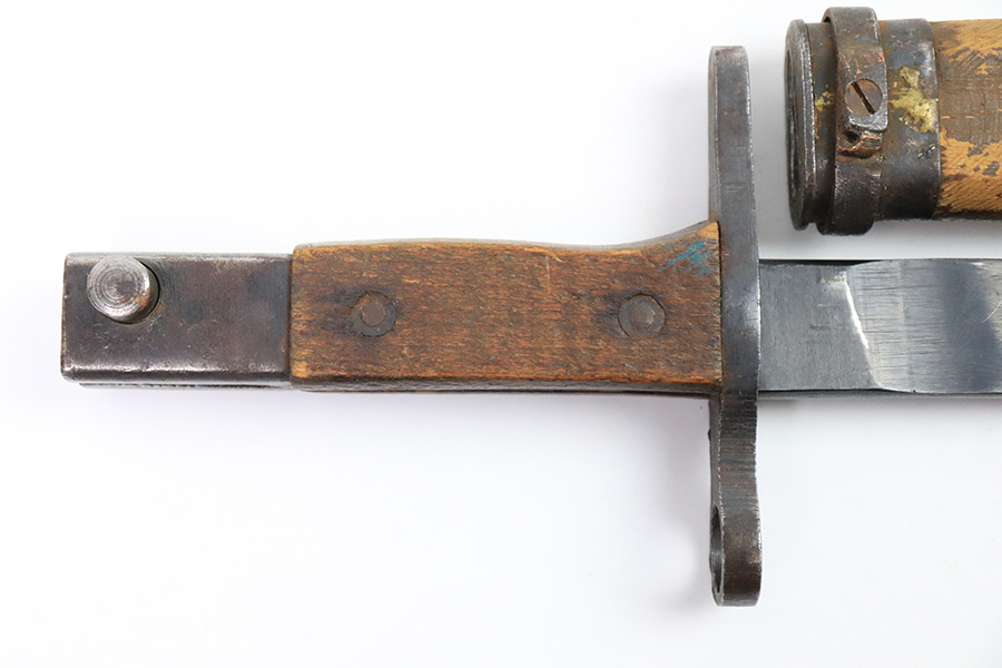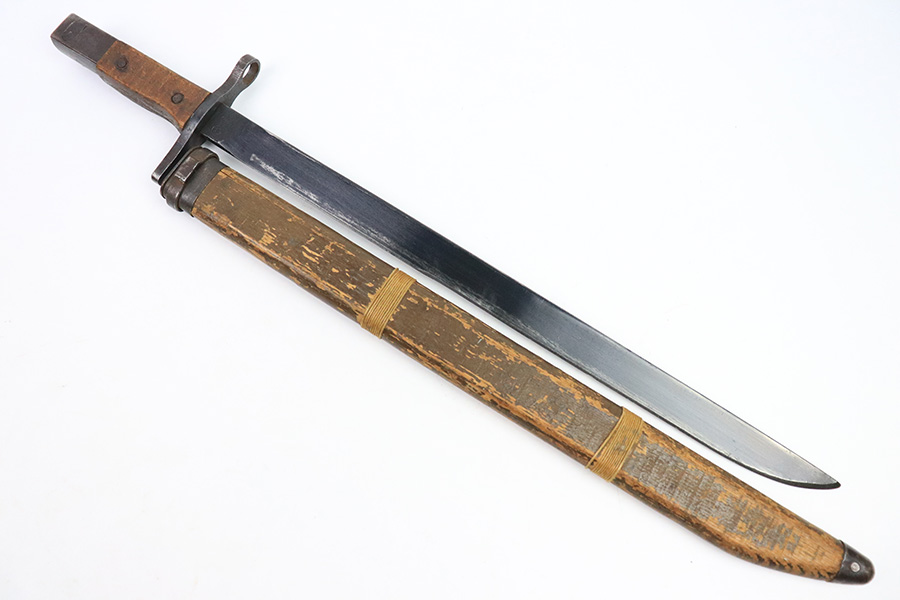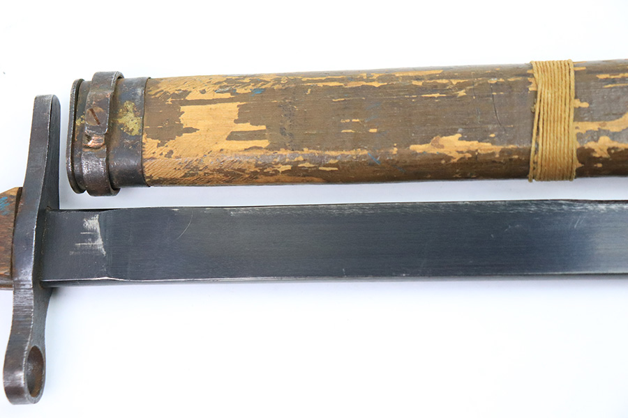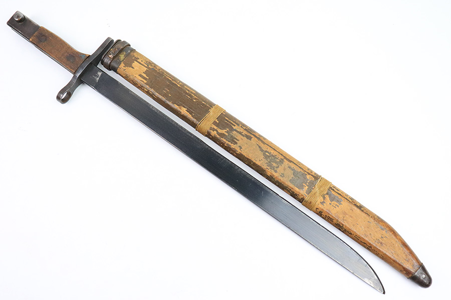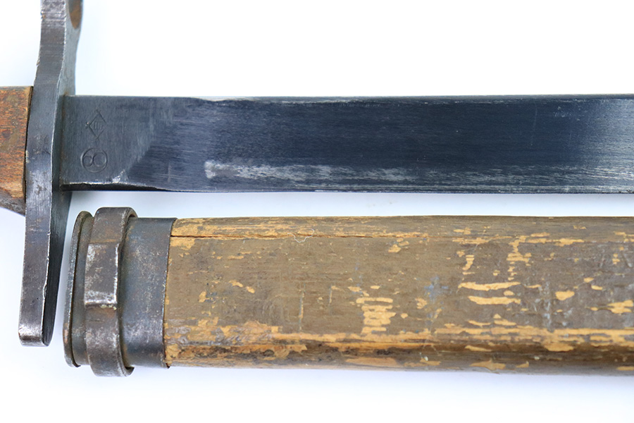 12/7/22 – This is an original late WW2 variation Type 30 Japanese rifle bayonet. The bayonet has late war features such as a bamboo wood scabbard, straight cross guard, flat pommel, and a slab-side blued blade. The blade has excellent bluing throughout and is sharpened from the tip down about halfway along the edge. There’s some mild scabbard wear and a few imperfections along the edge but no major issues. Maker stamped by Toyoda Automatic Loom works under Nagoya supervision. Mild patina on the pommel and hand guard. Nice wood grips. The scabbard has two cracks stemming down from the mouth, but this is typical and not excessive wear. A very nice example overall.