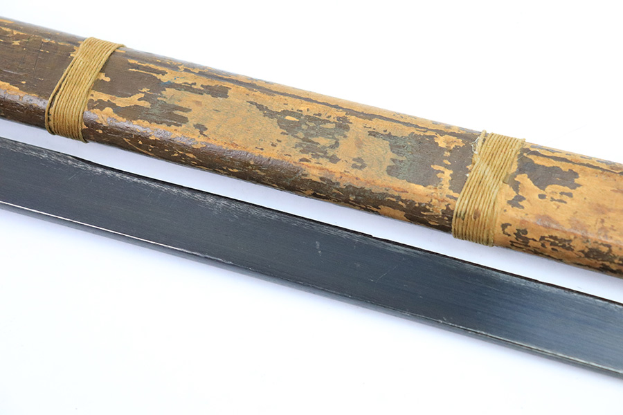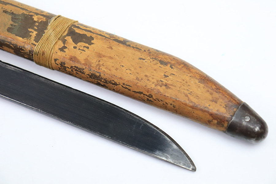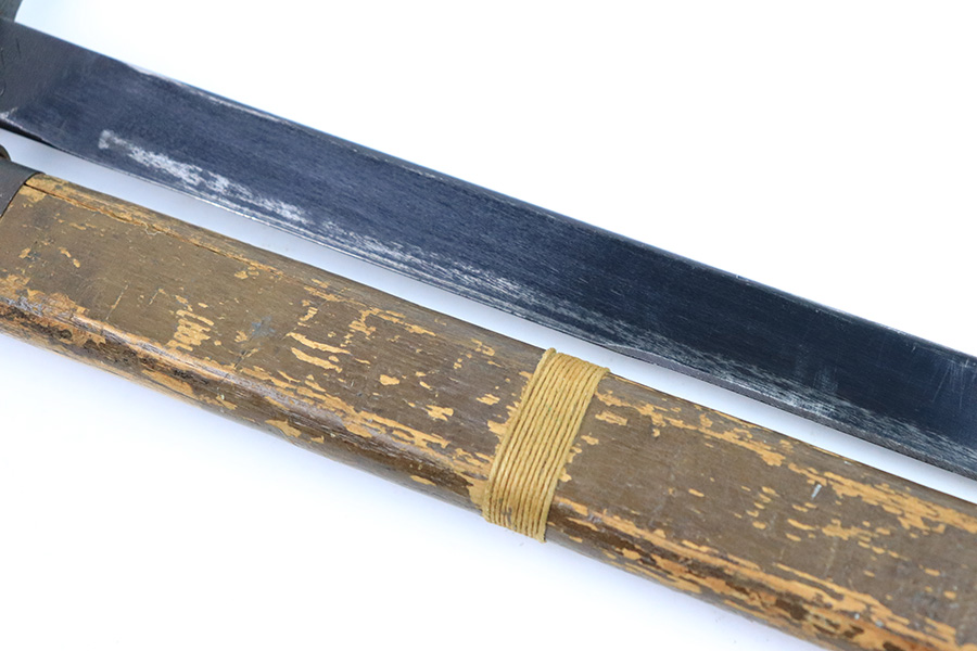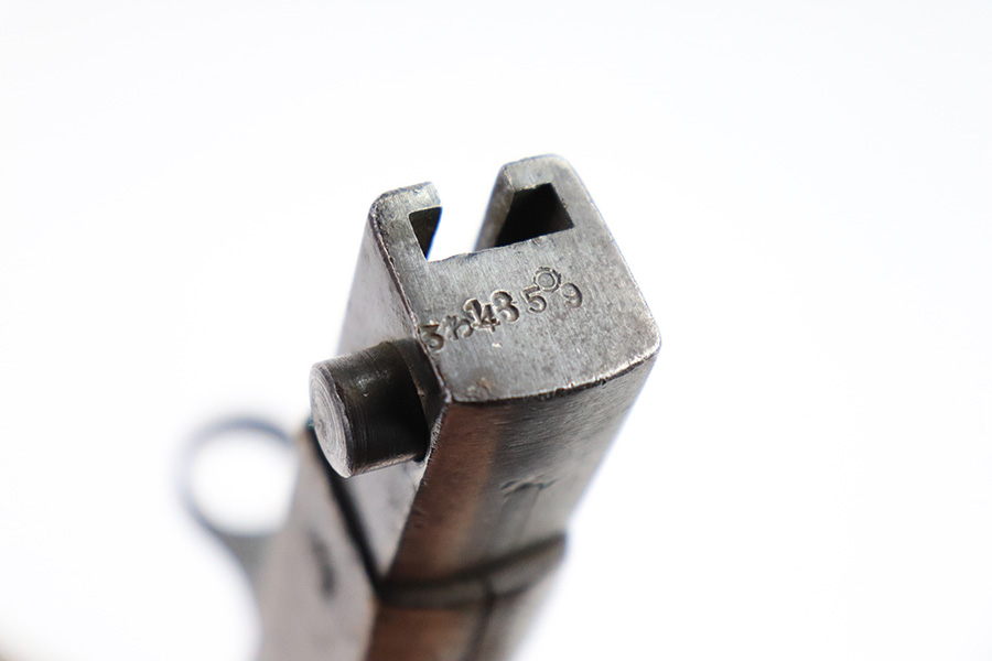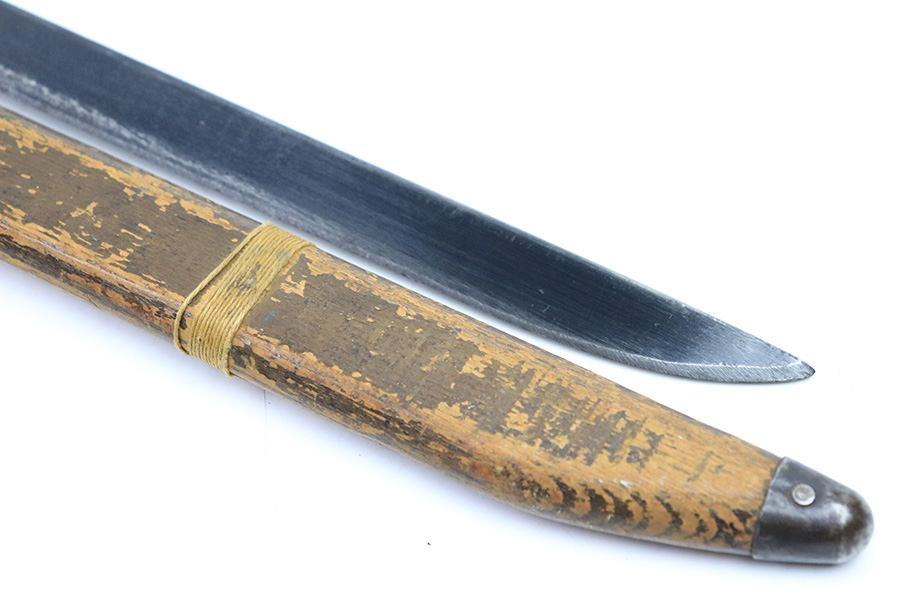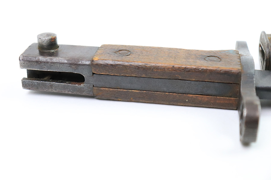 12/7/22 – This is an original late WW2 variation Type 30 Japanese rifle bayonet. The bayonet has late war features such as a bamboo wood scabbard, straight cross guard, flat pommel, and a slab-side blued blade. The blade has excellent bluing throughout and is sharpened from the tip down about halfway along the edge. There’s some mild scabbard wear and a few imperfections along the edge but no major issues. Maker stamped by Toyoda Automatic Loom works under Nagoya supervision. Mild patina on the pommel and hand guard. Nice wood grips. The scabbard has two cracks stemming down from the mouth, but this is typical and not excessive wear. A very nice example overall.