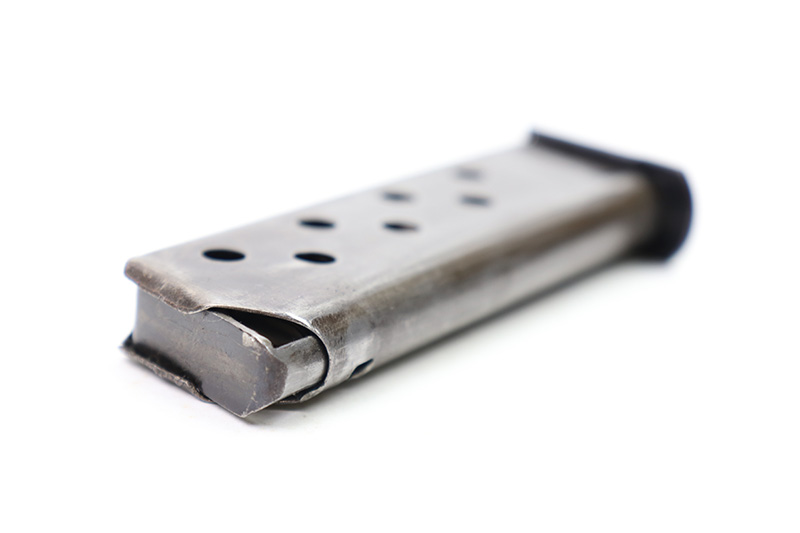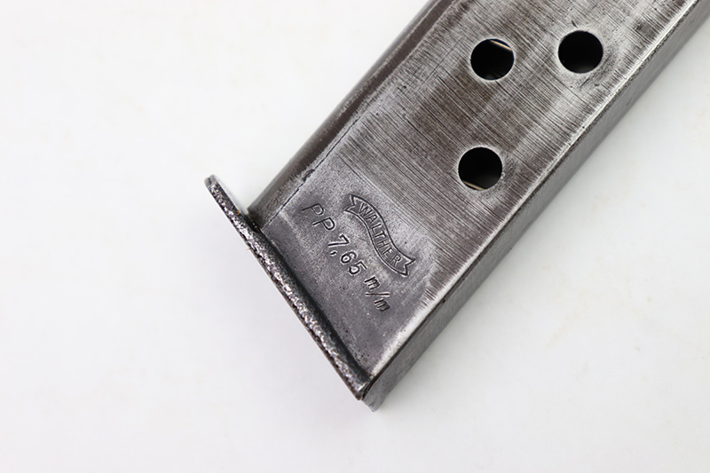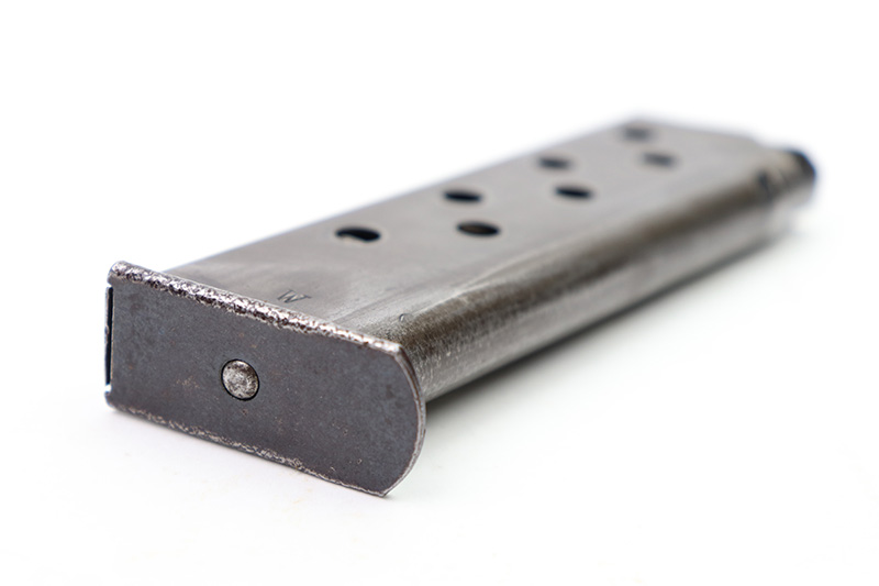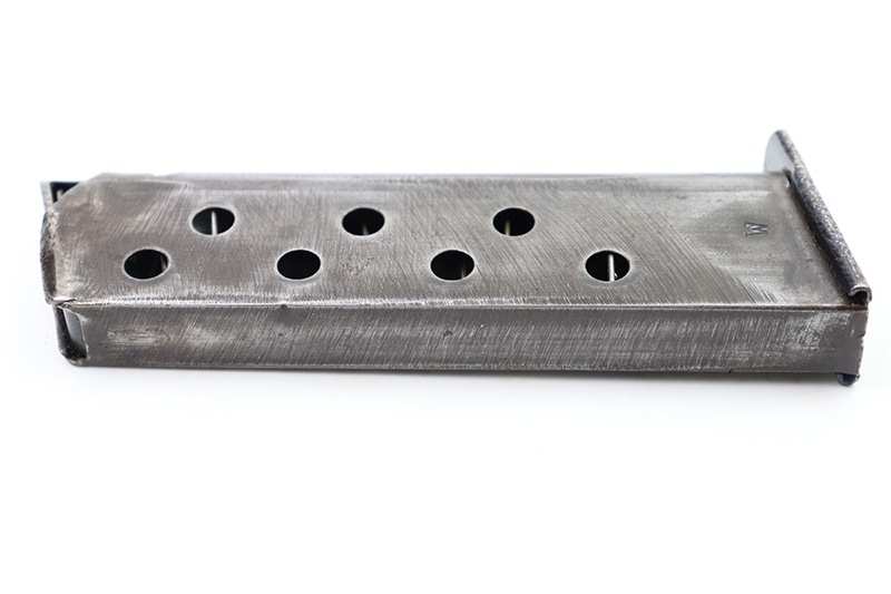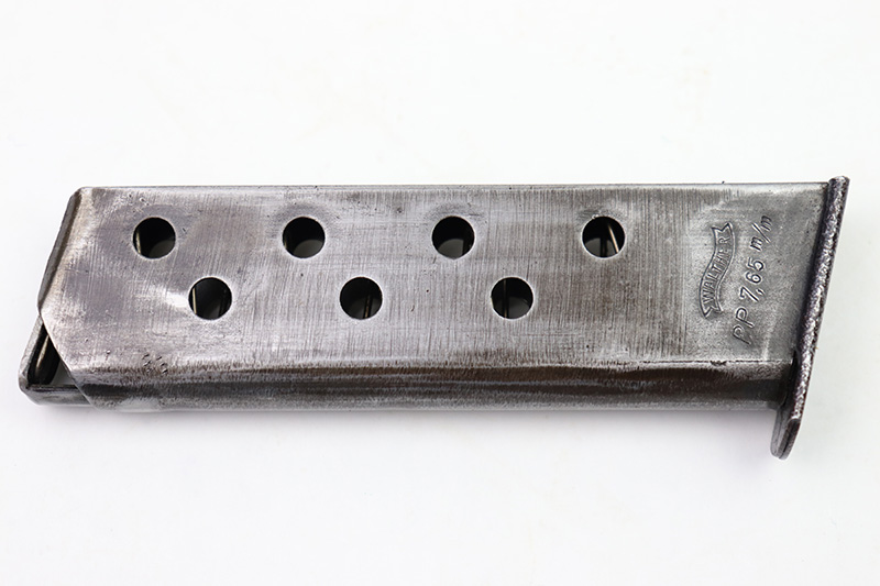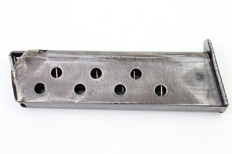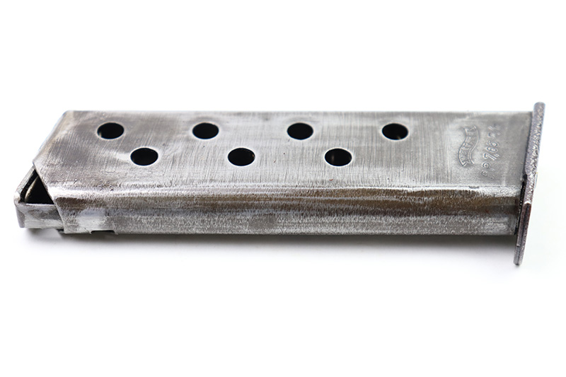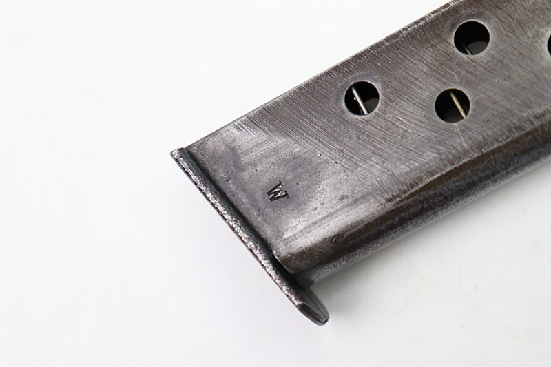 8/24/22 – This is a fairly scarce variation, late WW2 production PP magazine. The magazine is stamped on the tube with a “W” on one side. There is no rust or pitting, but the finish is mostly worn off or thinning throughout the magazine. Strong, fully functional spring.