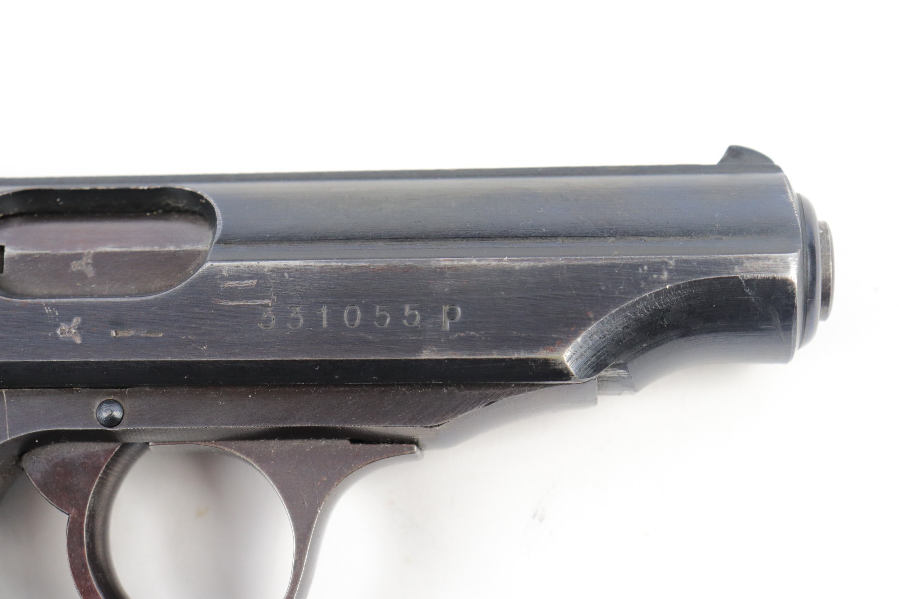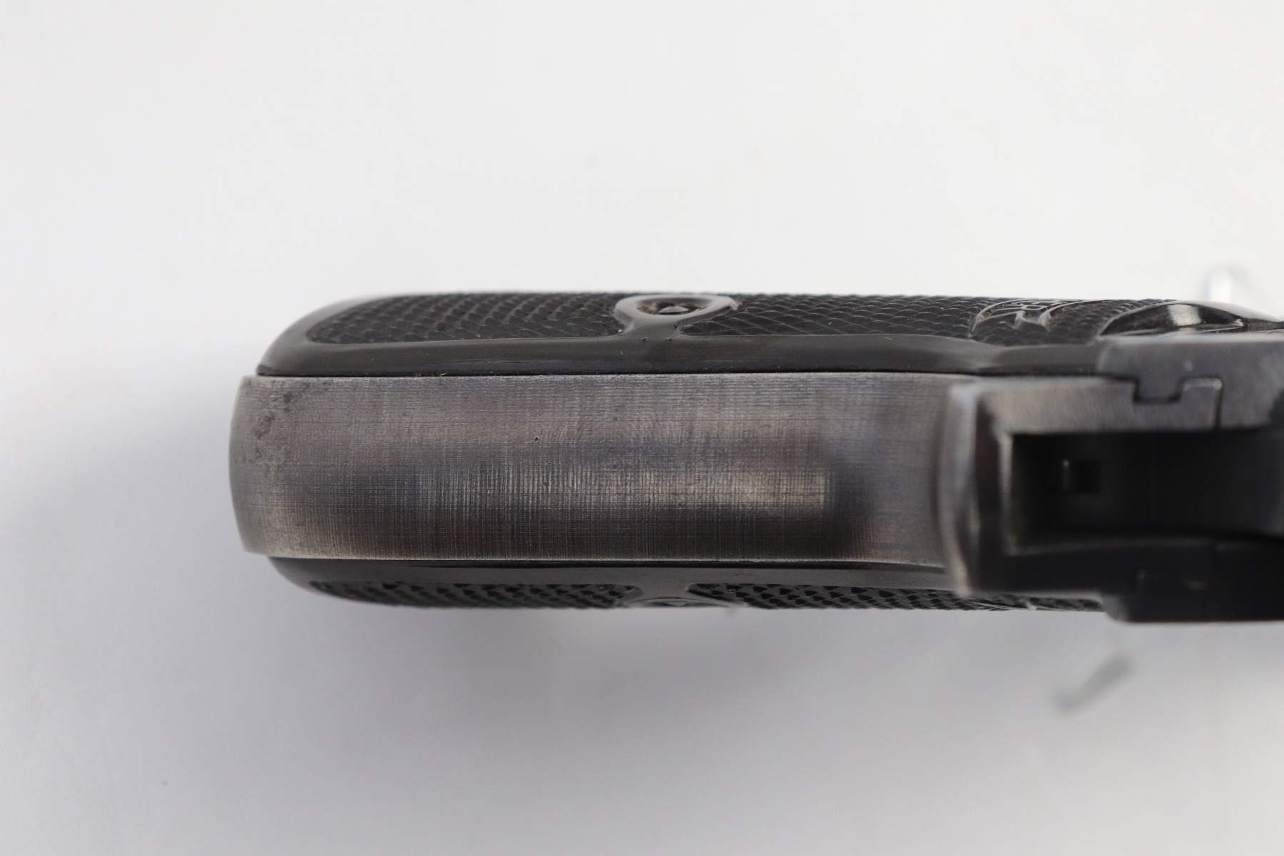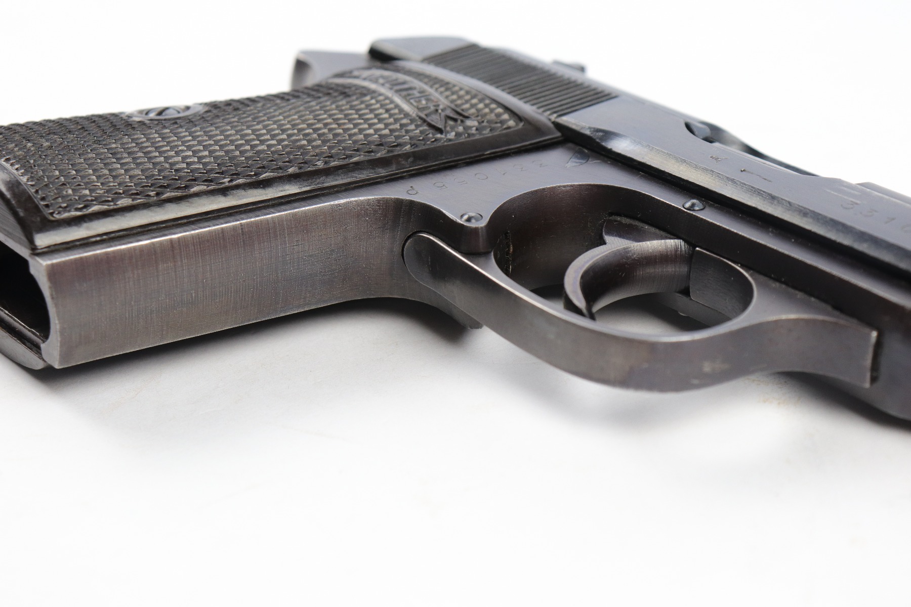 4/5/18 – This is an original late war production Walther PP. The pistol is in excellent condition considering late war production was rushed and sometimes sloppy. The pistol has a nice finish overall with only some minor edge wear on the slide, and a few streaks of wear on the right sdie of the slide. The front and back straps are in good condition overall with some minor thinning on the finish, but it could have easily left the factory this way. The pistol slide matches the frame, and overall the pistol is mechanically sound. The bore is clean with strong rifling as well, only minor patina in some of the grooves. Guaranteed original and authentic.