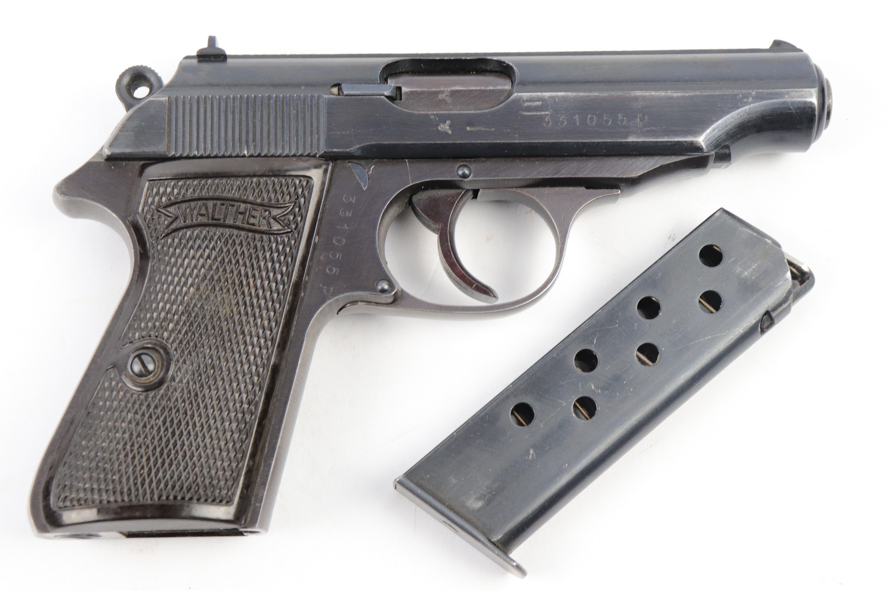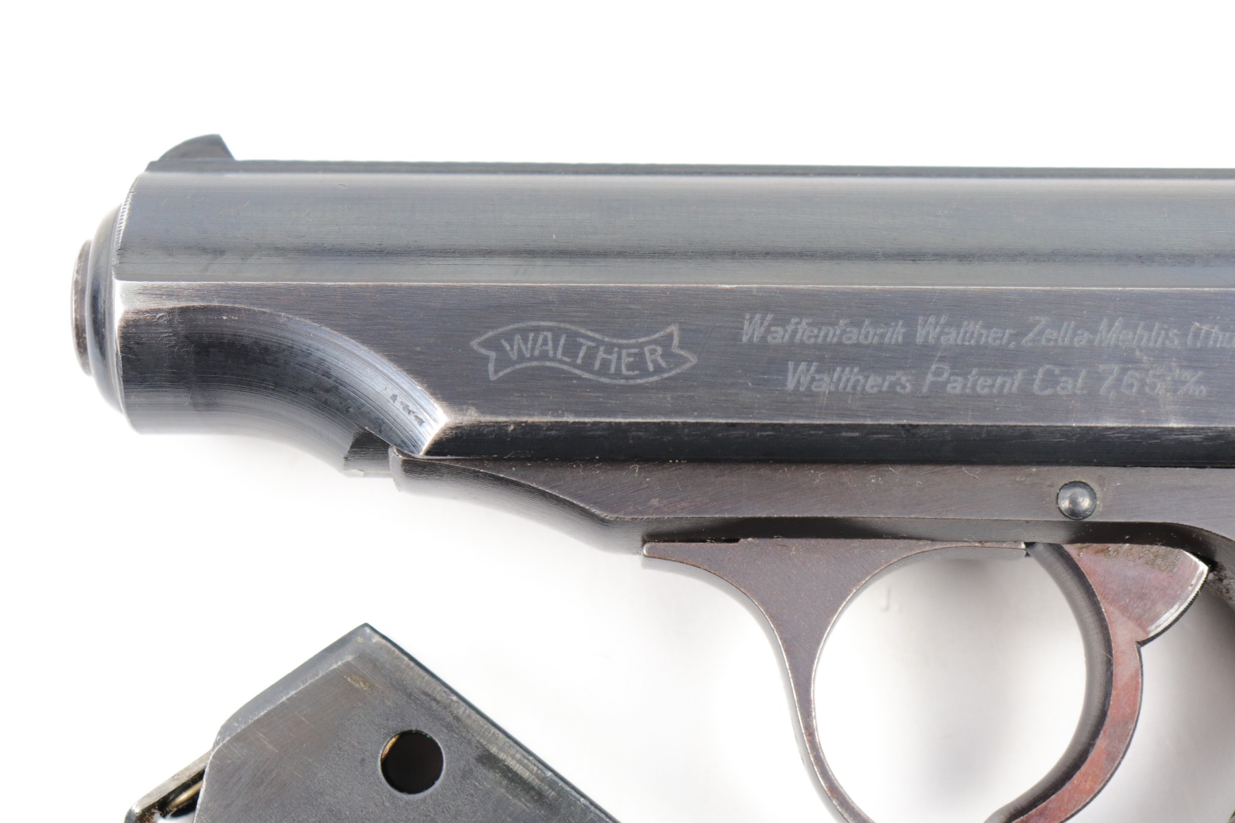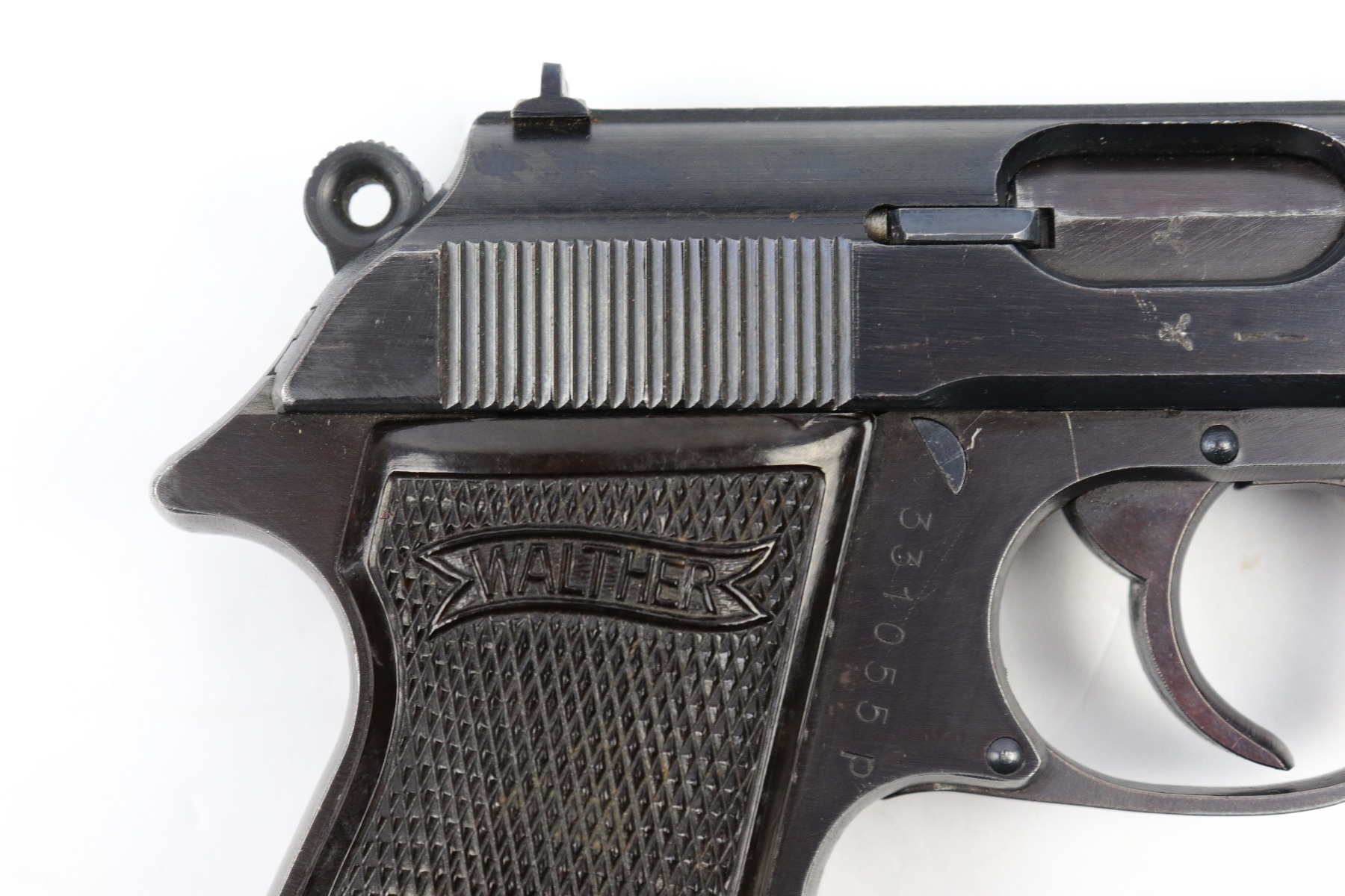 4/5/18 – This is an original late war production Walther PP. The pistol is in excellent condition considering late war production was rushed and sometimes sloppy. The pistol has a nice finish overall with only some minor edge wear on the slide, and a few streaks of wear on the right sdie of the slide. The front and back straps are in good condition overall with some minor thinning on the finish, but it could have easily left the factory this way. The pistol slide matches the frame, and overall the pistol is mechanically sound. The bore is clean with strong rifling as well, only minor patina in some of the grooves. Guaranteed original and authentic.