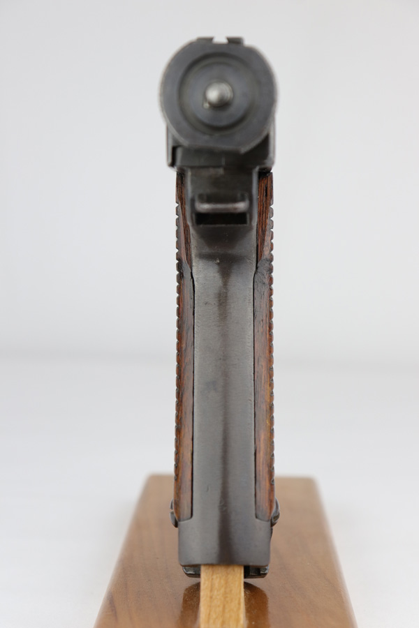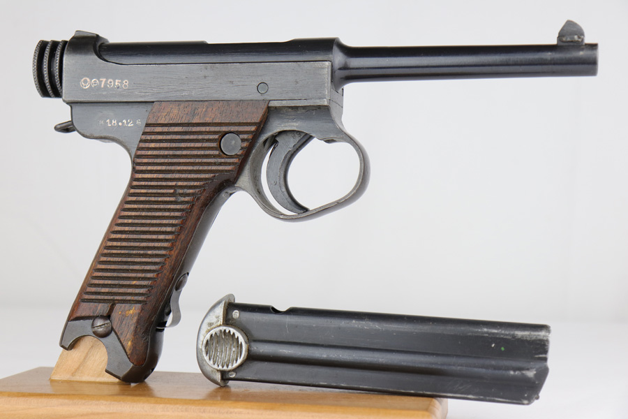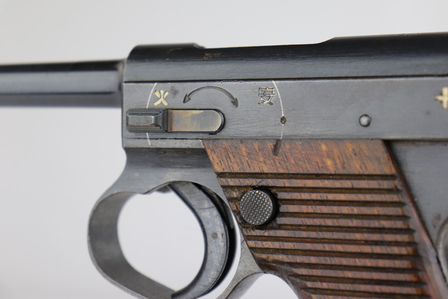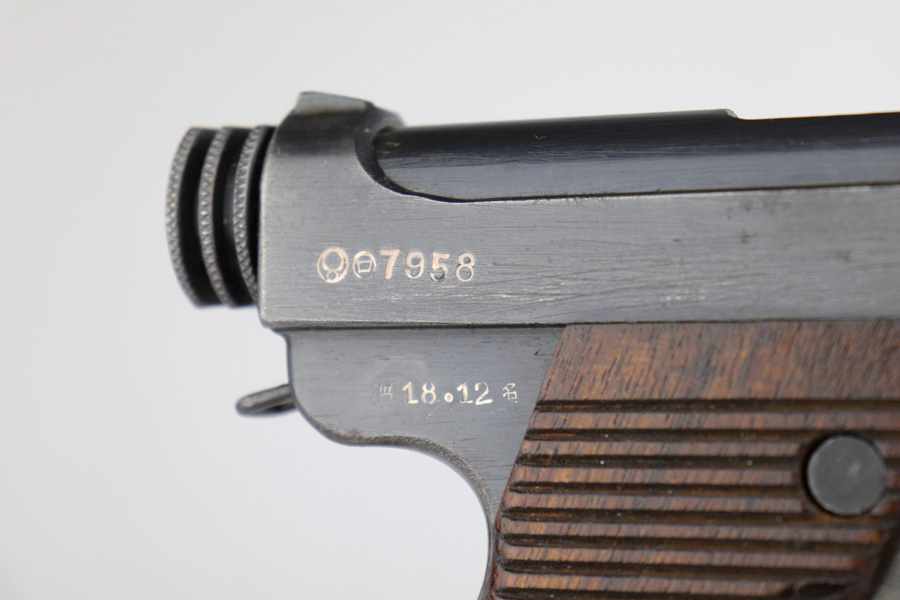 4/26/19 – This is an original December 1943 production Type 14 Nambu pistol. The late war finish is about 93-95% overall with a majority of the wear on the grip straps. There is brown patina throughout the front and back straps, as well as finish loss / thinning. There are also a few spots of patina on the sides of the frame, as shown in photos but no rust or pitting. The parts are all original and matching numbered, including the grips but not the magazine. The magazine however is a correct wartime magazine. The bore is clean with nice rifling – 9/10 overall.