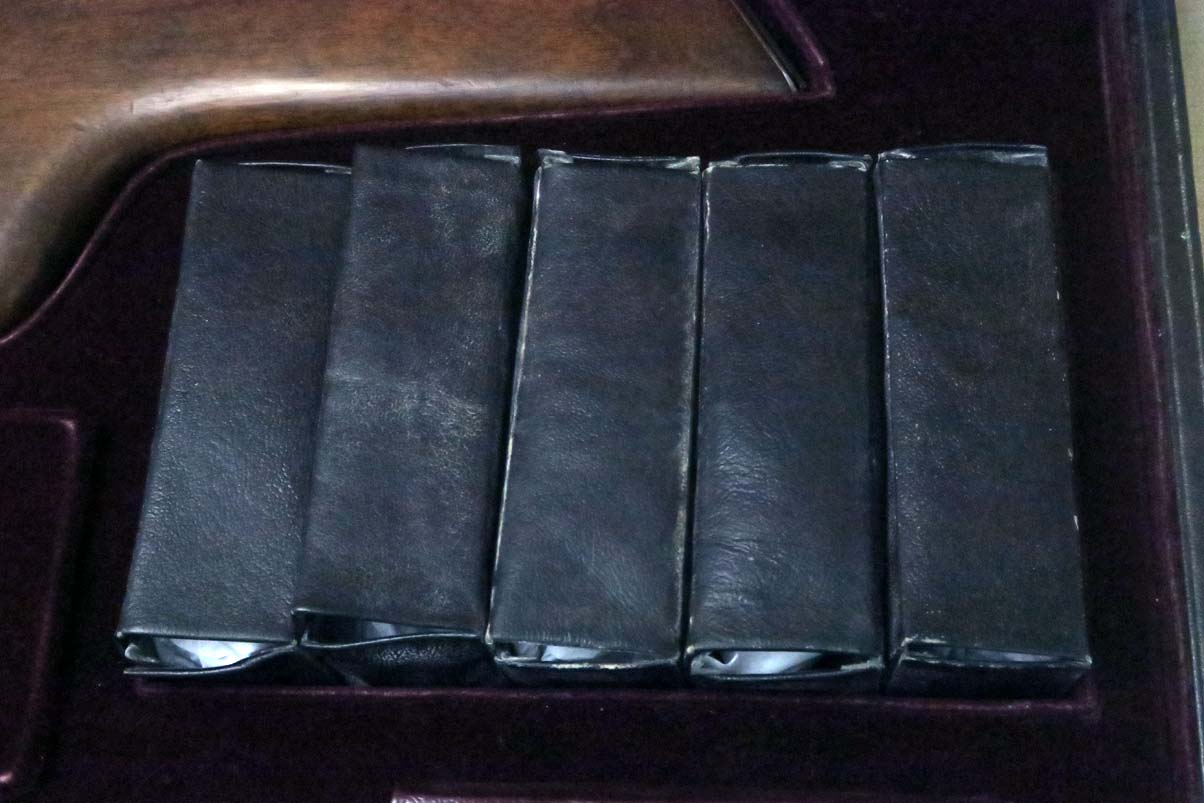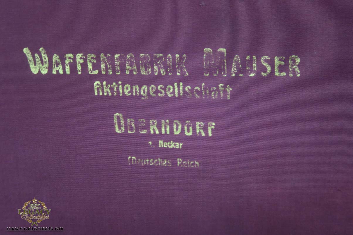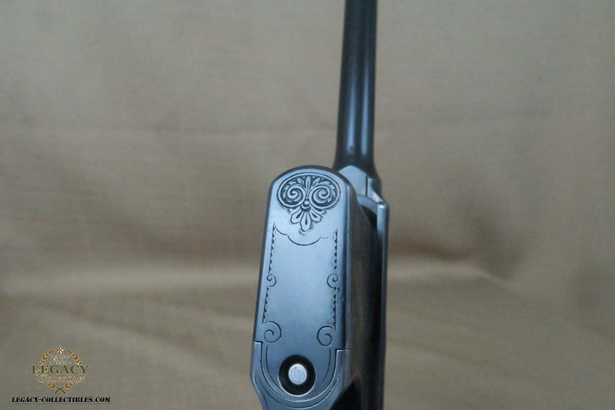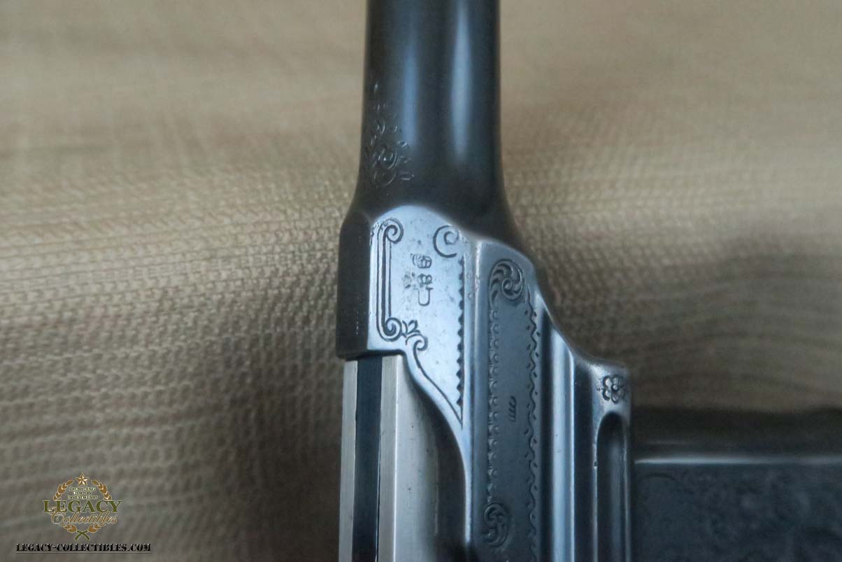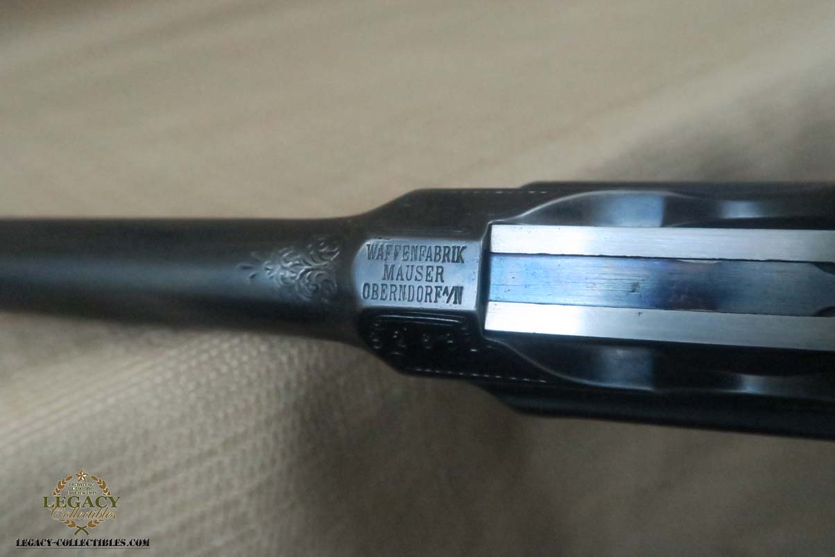 7/7/17 – We have taken in this beautifully engraved Broomhandle Mauser as a consignment gun.   Since we have never offered such a nice presentation piece before we are relying on the consignor for much of the description.  This is an engraved, Presentation Broomhandle C96.  Comes in Cal. 7.63mm.  Early Large Ring hammer, extensively engraved, with 5.5″ barrel.   As is the case for most factory engraved guns, the acceptance and proof marks have been relocated. In this case, the Crown/Crown/U has been moved from the left side of the barrel and the antler proof on the right side of the barrel is further back than usual. The right side of frame has the 2-line address. We believe the gun is most likely an old re-blue or restoration piece.   The finish shows age and wear but when examined with magnification we can see tiny dimples or pinpricks in the metal that have finish over them.  It is engraved with a fine scroll pattern that is fairly typical for factory engraved Broomhandles.  There is a lanyard ring present on the bottom of the frame. It appears to have all matching parts including the excellent walnut grip panels. Also comes with a matching stock which is also in excellent condition.   Bore is excellent with strong rifling.   In addition, it is housed in a high quality black, leather bound, presentation case. The case itself has to be worth a couple thousand.  Inside the case is a replica cleaning rod and what I believe are replica ammo boxes.    I would estimate that an all original presentation Broomhandle assembly like this one would easily top $15,000.   We are offering this beautiful collectors piece for considerably less.
