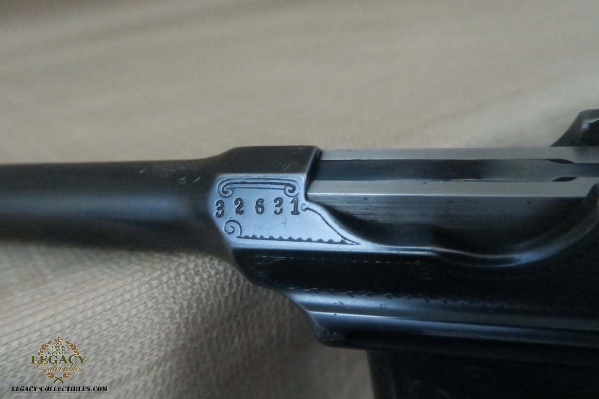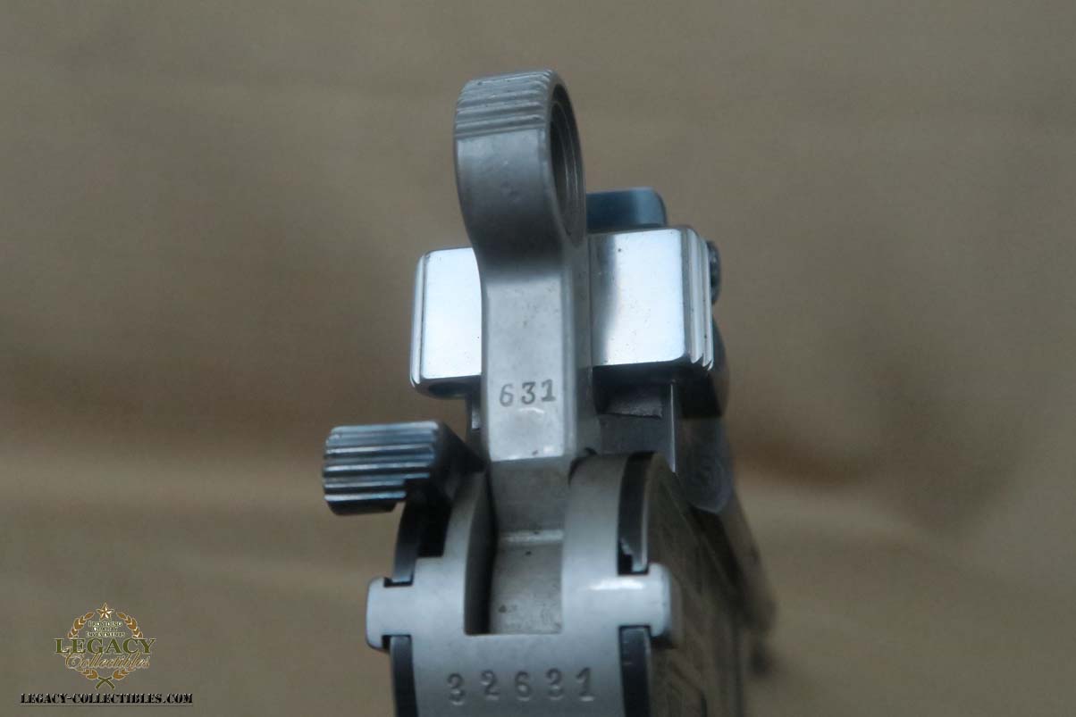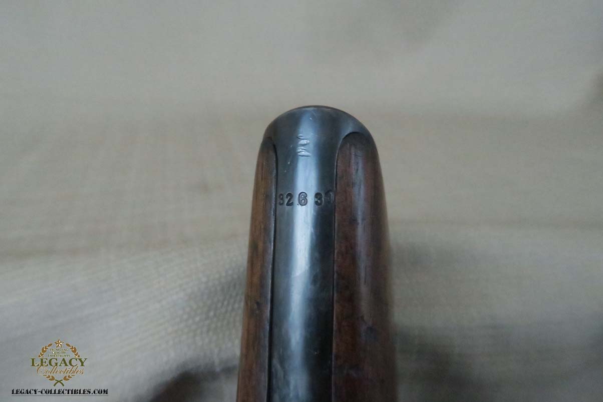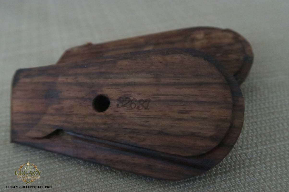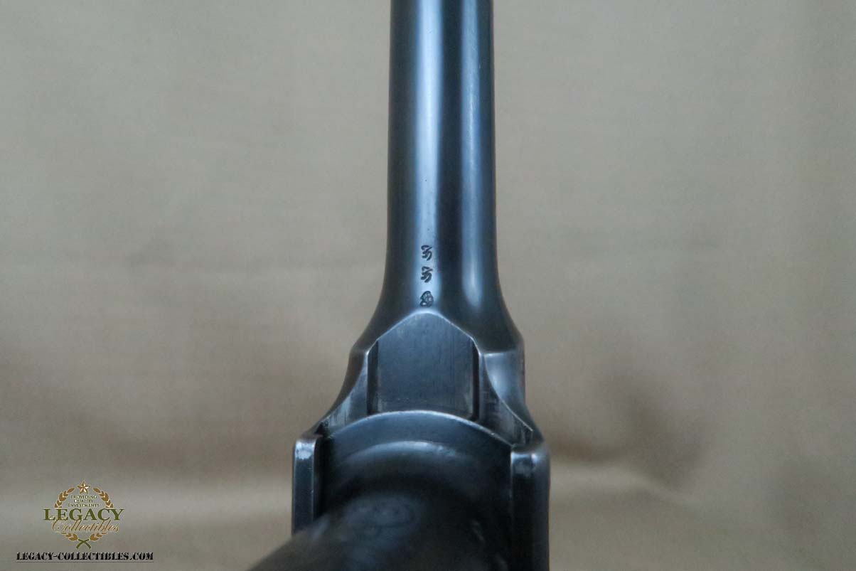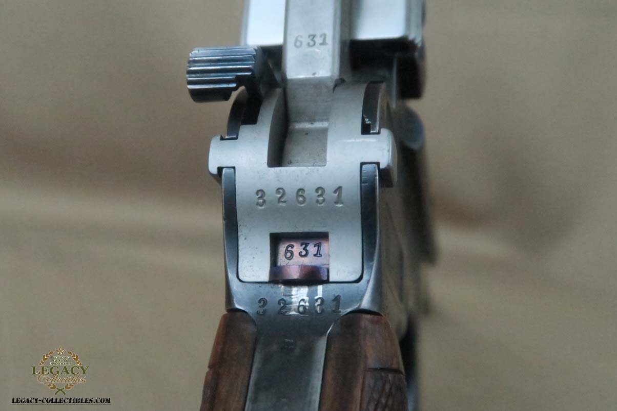 7/7/17 – We have taken in this beautifully engraved Broomhandle Mauser as a consignment gun.   Since we have never offered such a nice presentation piece before we are relying on the consignor for much of the description.  This is an engraved, Presentation Broomhandle C96.  Comes in Cal. 7.63mm.  Early Large Ring hammer, extensively engraved, with 5.5″ barrel.   As is the case for most factory engraved guns, the acceptance and proof marks have been relocated. In this case, the Crown/Crown/U has been moved from the left side of the barrel and the antler proof on the right side of the barrel is further back than usual. The right side of frame has the 2-line address. We believe the gun is most likely an old re-blue or restoration piece.   The finish shows age and wear but when examined with magnification we can see tiny dimples or pinpricks in the metal that have finish over them.  It is engraved with a fine scroll pattern that is fairly typical for factory engraved Broomhandles.  There is a lanyard ring present on the bottom of the frame. It appears to have all matching parts including the excellent walnut grip panels. Also comes with a matching stock which is also in excellent condition.   Bore is excellent with strong rifling.   In addition, it is housed in a high quality black, leather bound, presentation case. The case itself has to be worth a couple thousand.  Inside the case is a replica cleaning rod and what I believe are replica ammo boxes.    I would estimate that an all original presentation Broomhandle assembly like this one would easily top $15,000.   We are offering this beautiful collectors piece for considerably less.