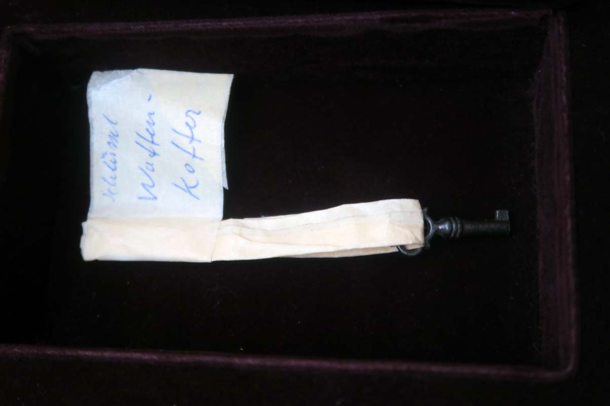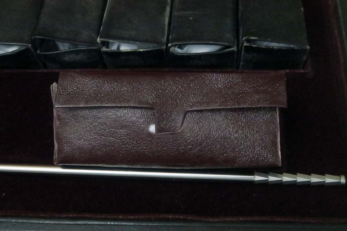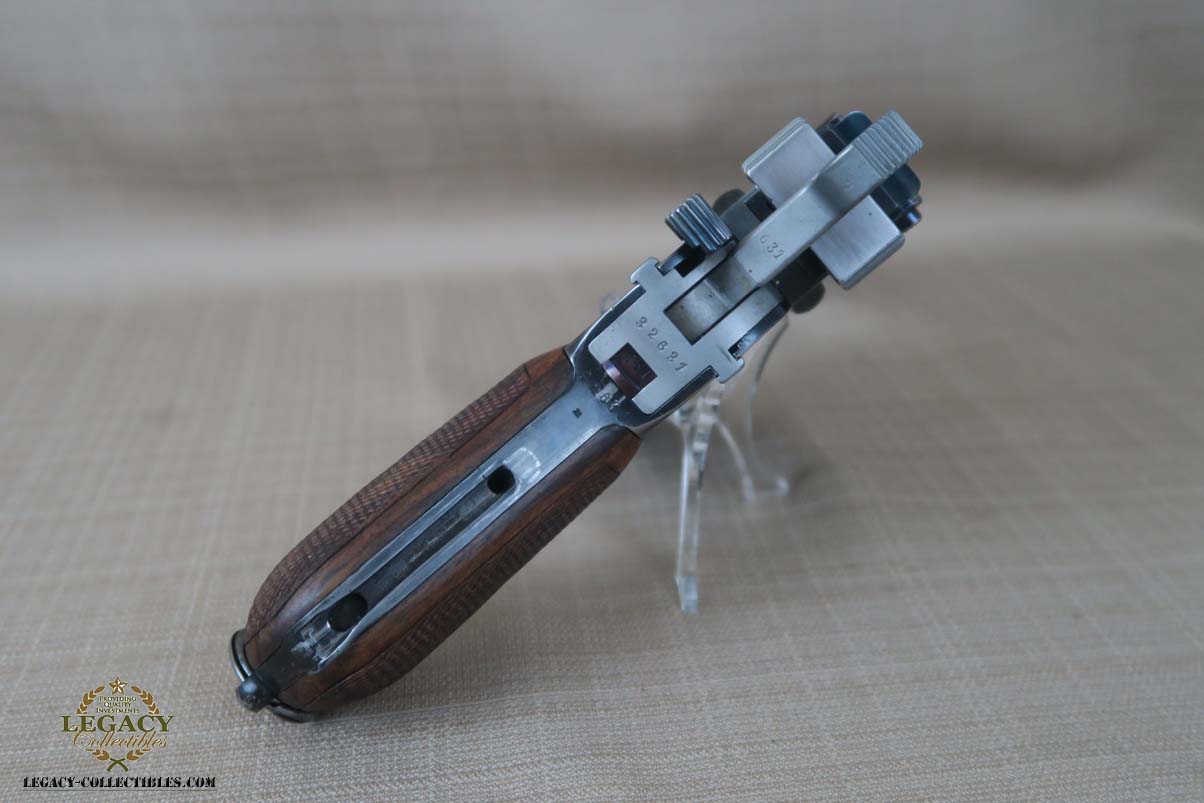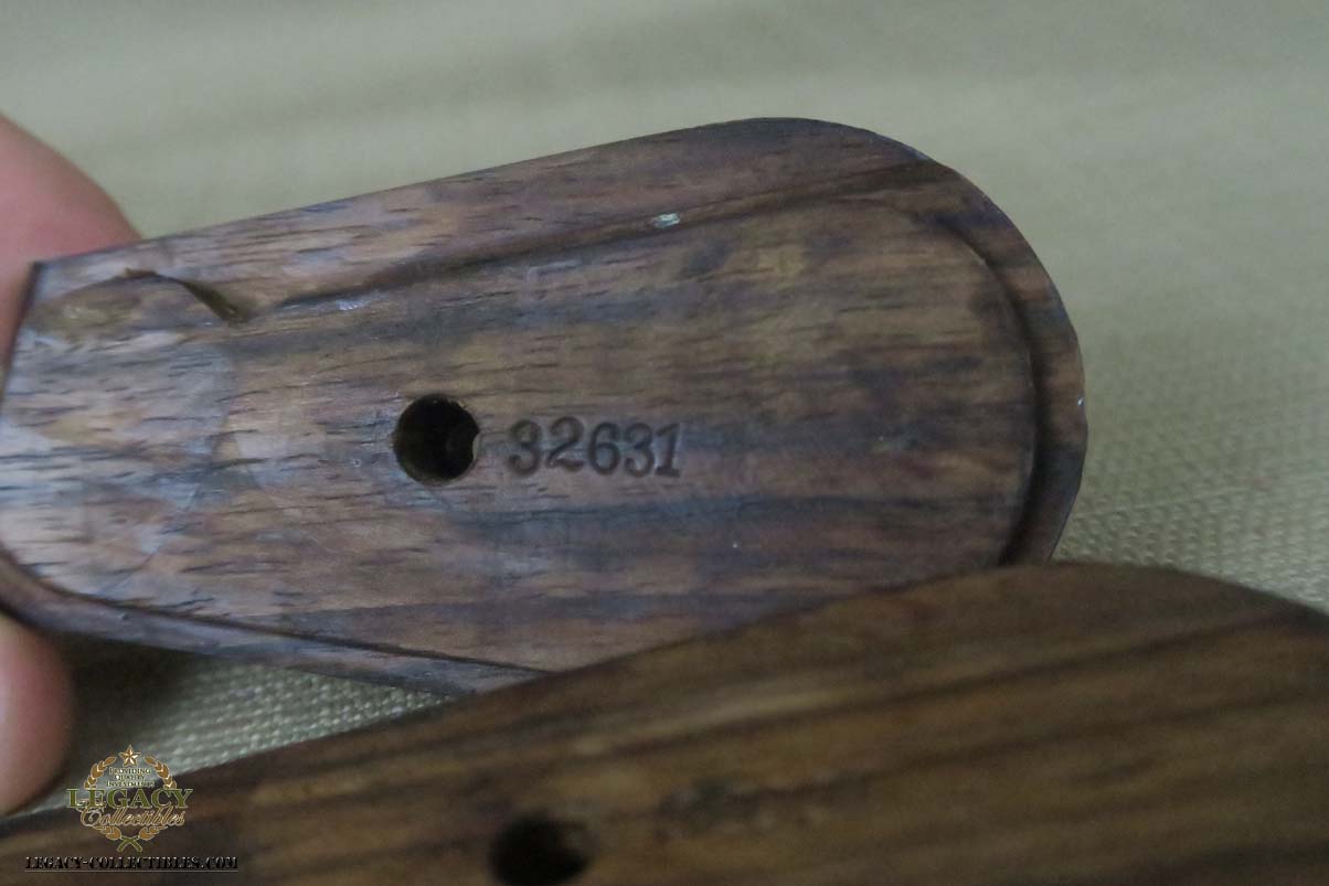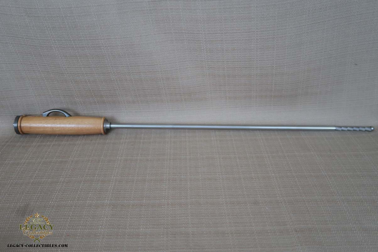 7/7/17 – We have taken in this beautifully engraved Broomhandle Mauser as a consignment gun.   Since we have never offered such a nice presentation piece before we are relying on the consignor for much of the description.  This is an engraved, Presentation Broomhandle C96.  Comes in Cal. 7.63mm.  Early Large Ring hammer, extensively engraved, with 5.5″ barrel.   As is the case for most factory engraved guns, the acceptance and proof marks have been relocated. In this case, the Crown/Crown/U has been moved from the left side of the barrel and the antler proof on the right side of the barrel is further back than usual. The right side of frame has the 2-line address. We believe the gun is most likely an old re-blue or restoration piece.   The finish shows age and wear but when examined with magnification we can see tiny dimples or pinpricks in the metal that have finish over them.  It is engraved with a fine scroll pattern that is fairly typical for factory engraved Broomhandles.  There is a lanyard ring present on the bottom of the frame. It appears to have all matching parts including the excellent walnut grip panels. Also comes with a matching stock which is also in excellent condition.   Bore is excellent with strong rifling.   In addition, it is housed in a high quality black, leather bound, presentation case. The case itself has to be worth a couple thousand.  Inside the case is a replica cleaning rod and what I believe are replica ammo boxes.    I would estimate that an all original presentation Broomhandle assembly like this one would easily top $15,000.   We are offering this beautiful collectors piece for considerably less.