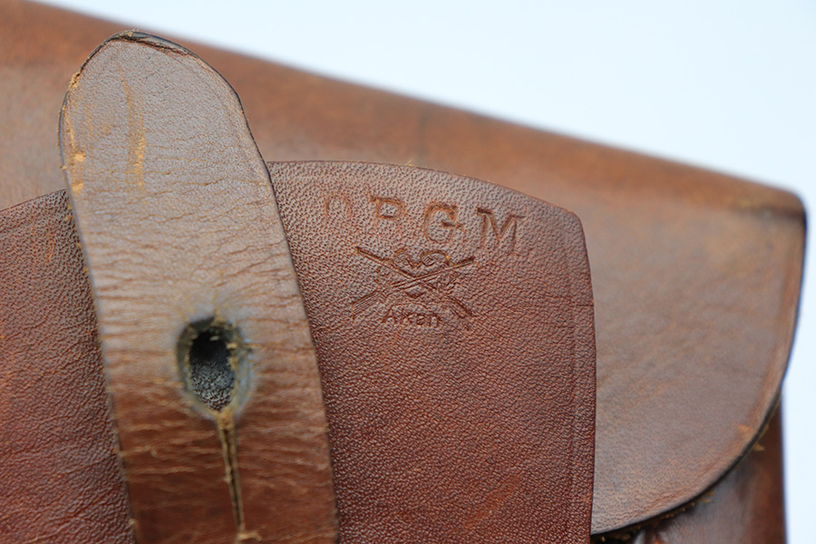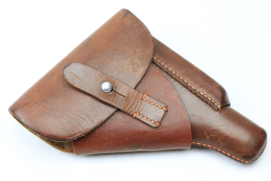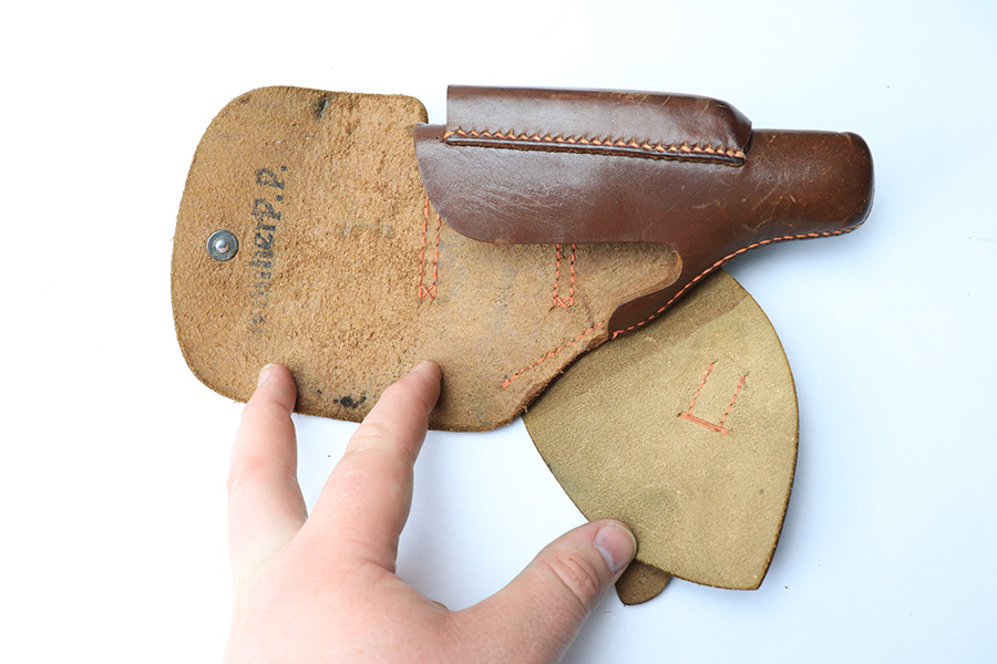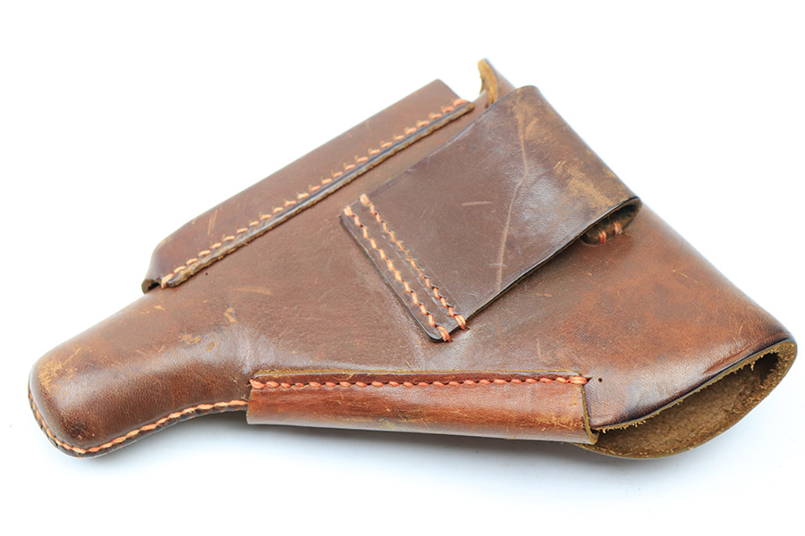 6/2/22 – This is an original AKAH Walther PP holster in the desirable “leading edge” style. The brown leather is in great condition with a clean interior that still shows the Walther PP ink stamp. There’s typical pliability and light surface wrinkling throughout the leather. The stitching is all tight and excellent throughout. Under the closure strap is an AKAH maker stamp.