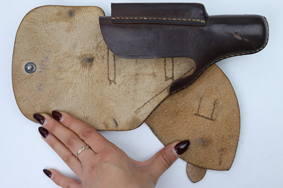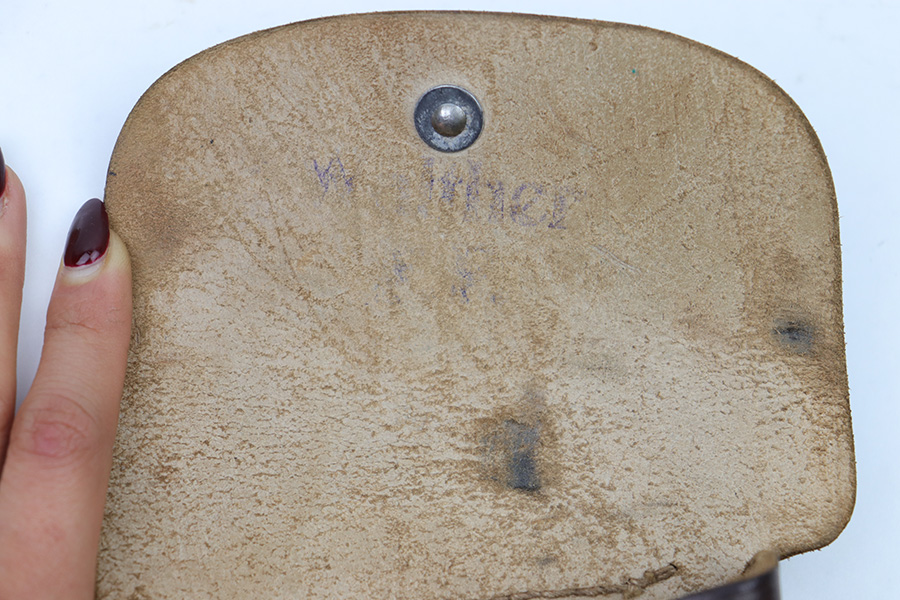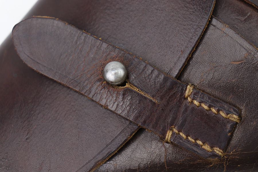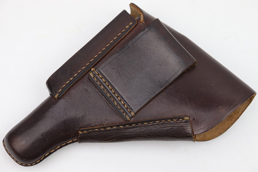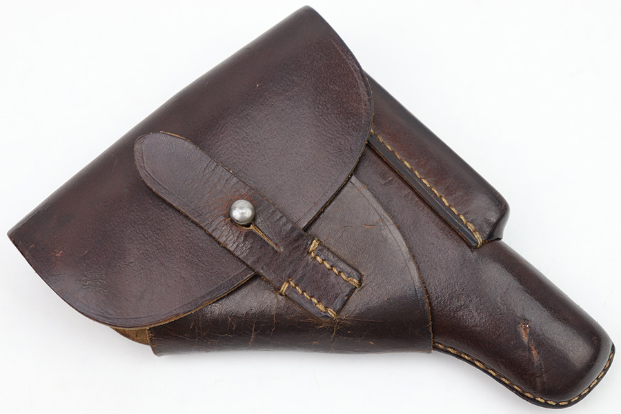 1/12/23 – This is an excellent, minty condition Leading Edge style AKAH Walther PP holster from WW2. The holster has beautiful chocolate brown leather and excellent straw colored stitching. No stitching issues and minimal surface wear on the leather. The leather has normal pliability and has a very clean interior. Remnants of the Walther PP ink stamp are still visible on the interior leather, and the AKAH maker stamp is visible under the closure strap. A very nice, hard to upgrade example.