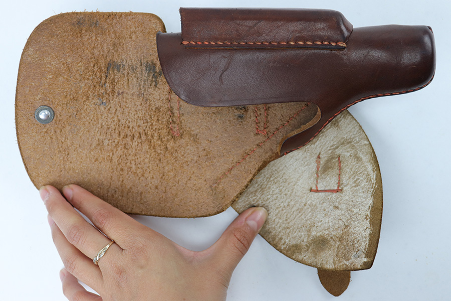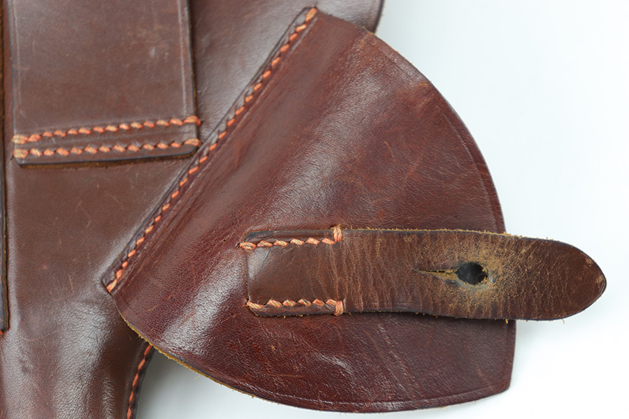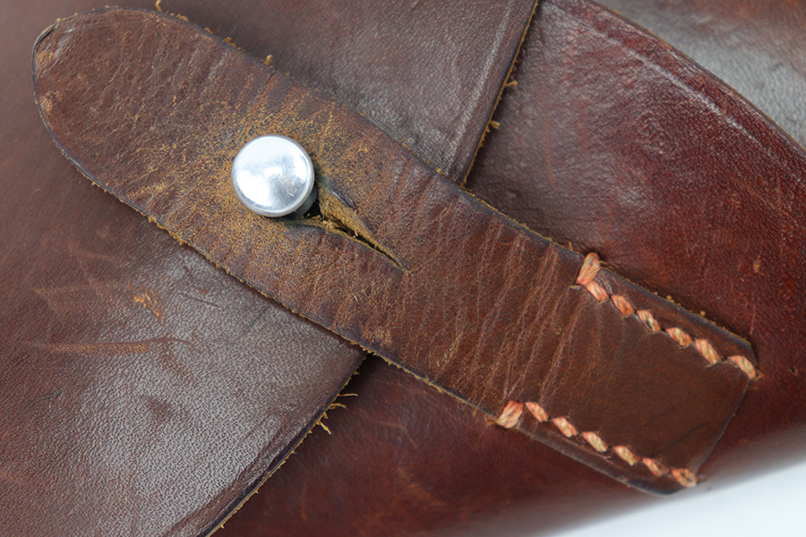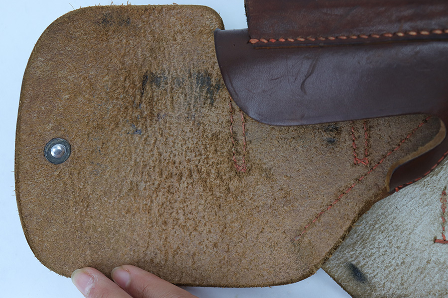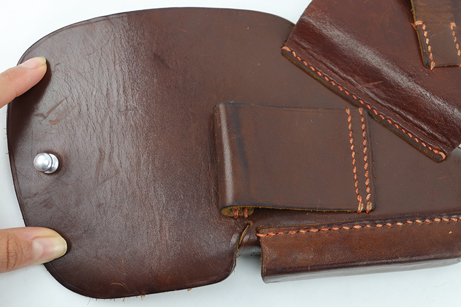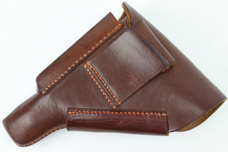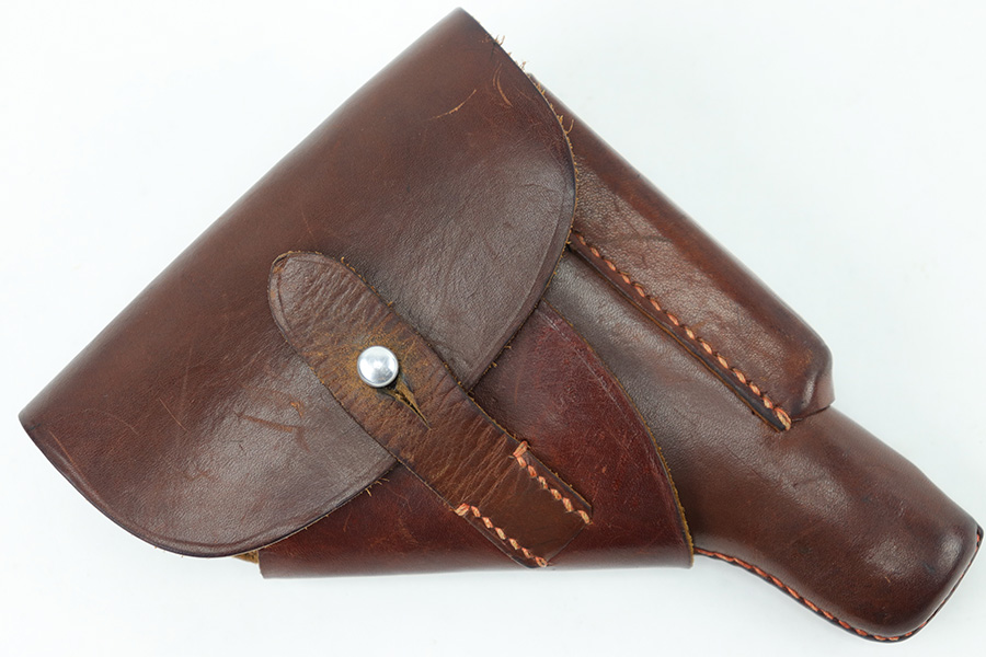 5/3/23 – This is an original leading edge style AKAH Walther PP holster from WW2. The holster is in excellent condition with clean brown leather and reddish colored straw stitching. There’s an AKAH maker stamp under the closure strap. The leather has normal pliability and no major areas of wrinkling or cracking. Clean interior leather has traces of the original ink stamp. A beautiful example.