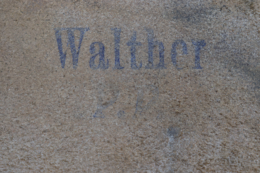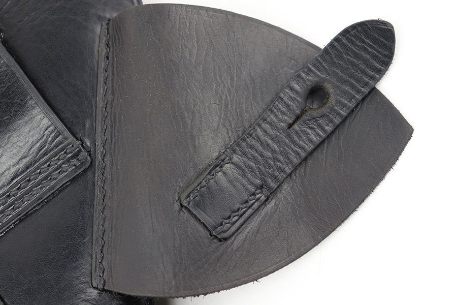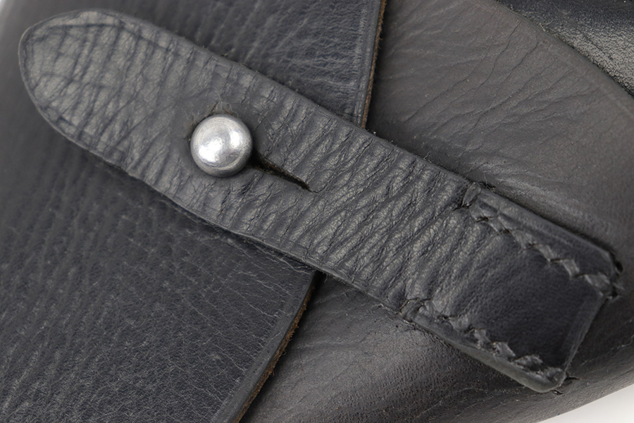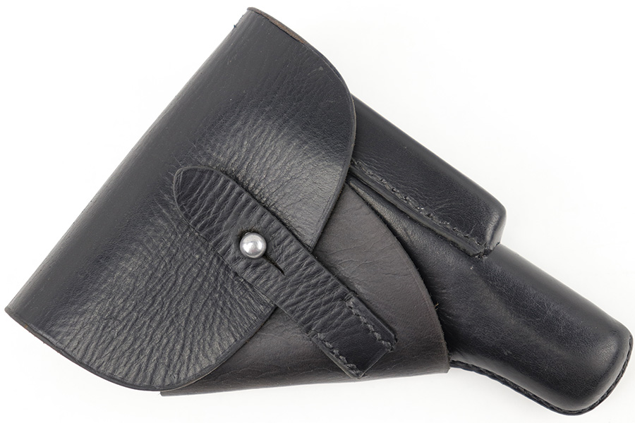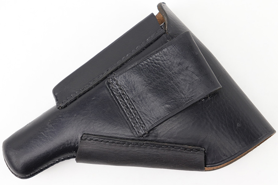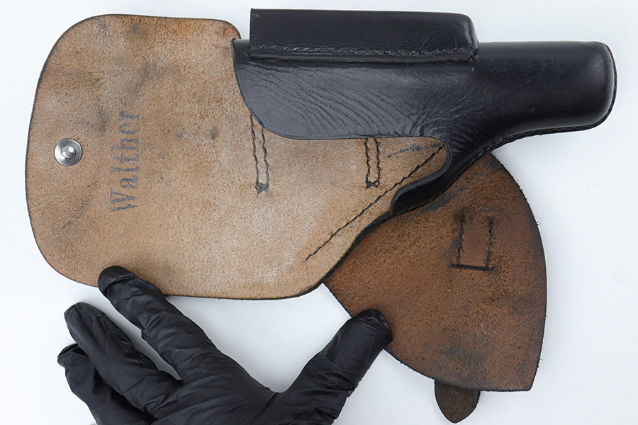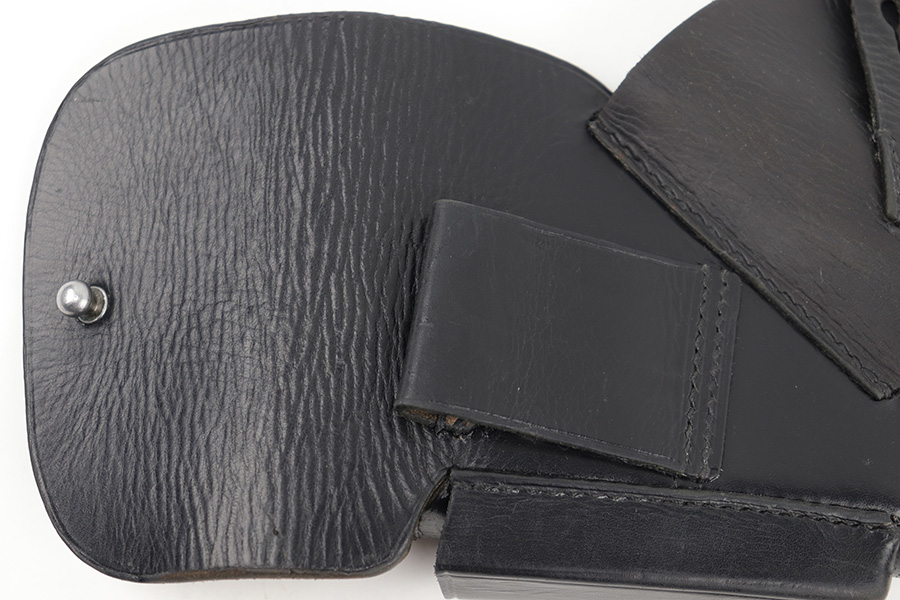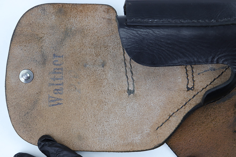 5/22/23 – This is an excellent condition AKAH Walther PP holster from WW2. The holster is in the “leading edge” style with an AKAH maker stamp under the closure strap and an original Walther PP ink stamp still visible on the interior leather. This example has black leather and black stitching, which is often paired with SS-issued pistols, and makes a great pairing with most military issued Walther PP pistols. The leather has some mild surface wrinkling throughout the exterior, with normal pliability. Excellent, clean interior leather and no stitching issues.