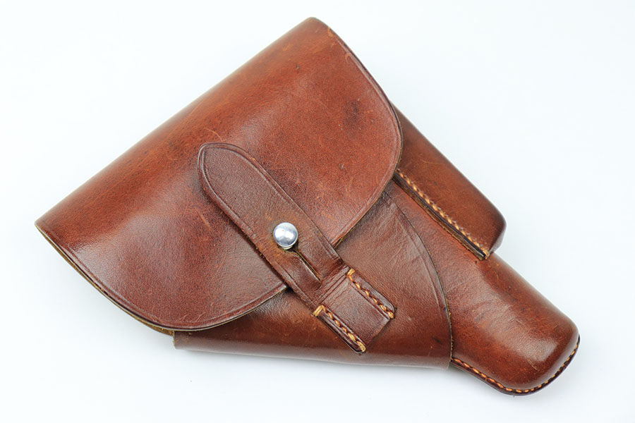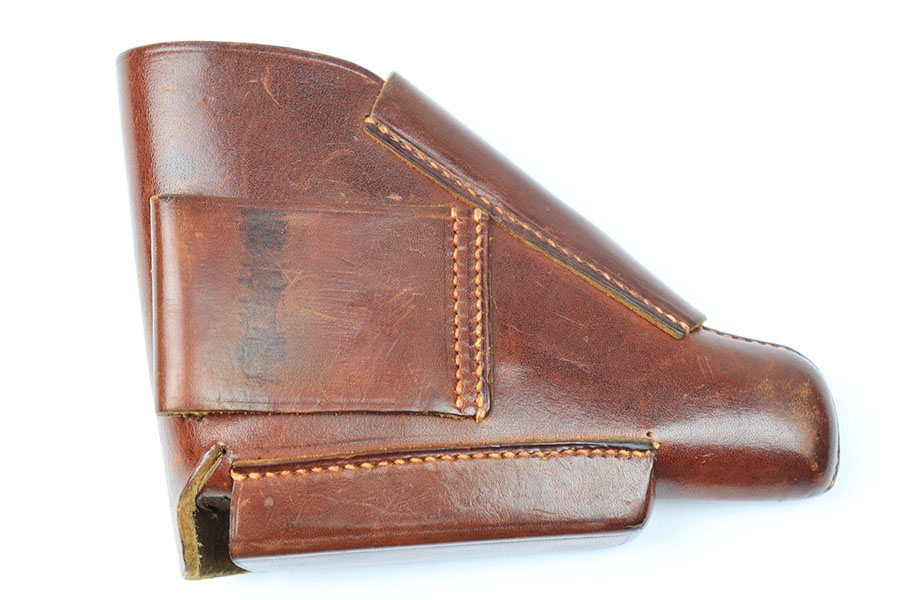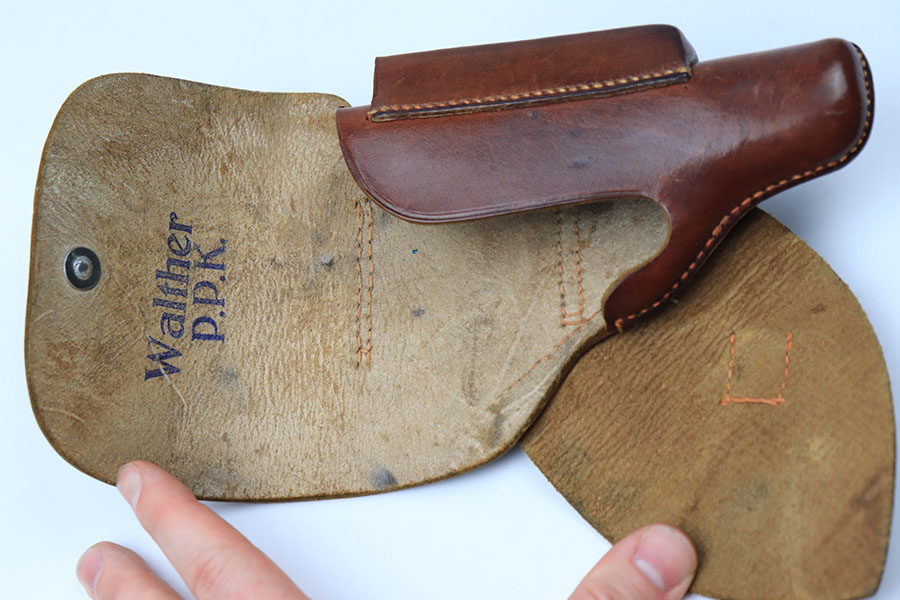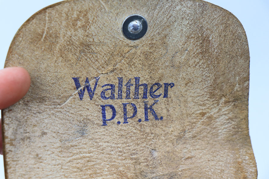 5/25/21 – This is an excellent, high end collectible AKAH PPK holster in leading edge style. The brown leather is very clean and has a beautiful, clean interior. There’s some minor exterior scuffing and signs of use but no major damage. Beautiful interior Walther PPK ink stamp. There’s an AKAH maker stamp under the closure strap. The stitching is all tight and original.