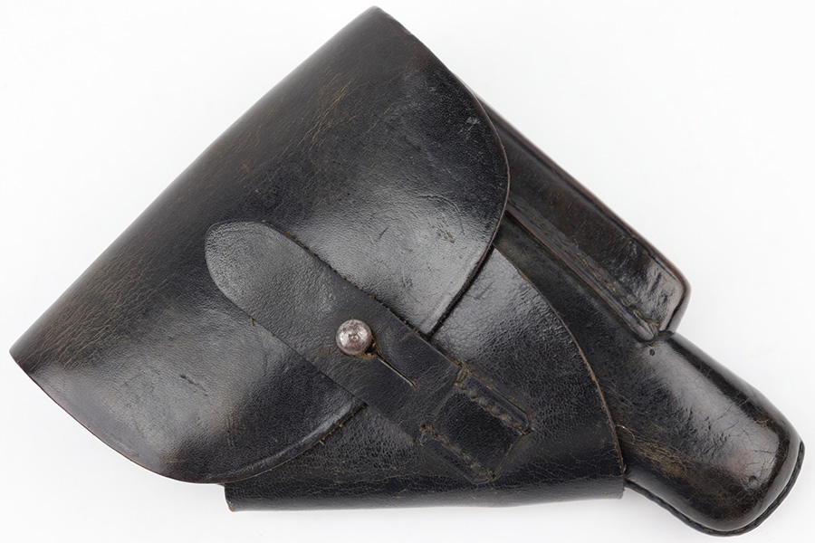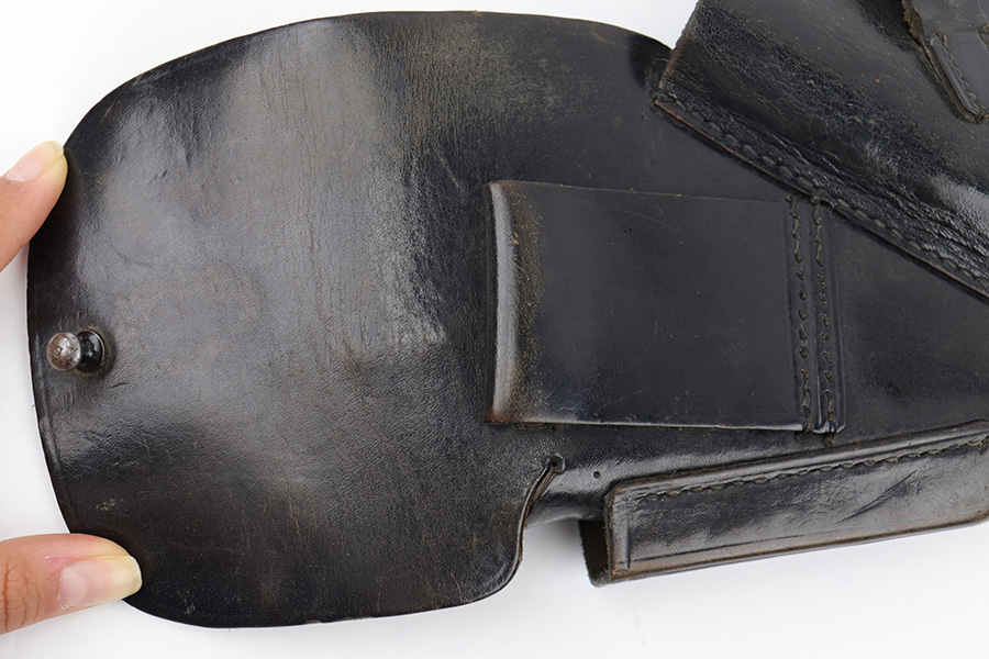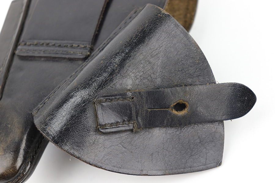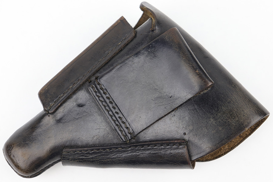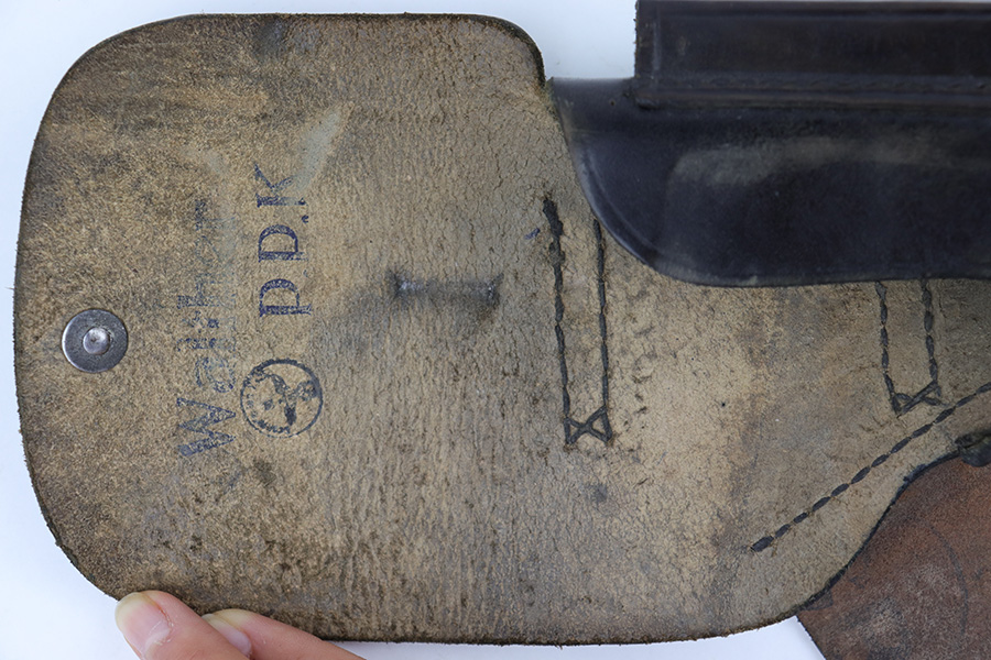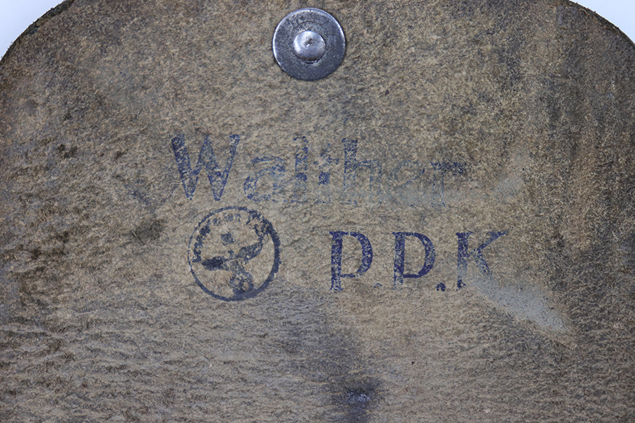 6/15/23 – This is an original black leather AKAH Walther PPK holster from WW2. The holster is desirable due to the uncommon “leading edge” style, as well as having black leather and stitching (often found with SS examples). The closure knob has remnants of black paint as well, as this was likely painted black during production. There’s a faint AKAH “D.R.G.M.” stamp under the closure strap, and the interior leather has an original Walther PPK ink stamp. There’s another small circular ink stamp on the interior leather that we’re not sure the significance of. The leather has mild surface wrinkling throughout and normal aging wear, but no excessive damage. All original stitching is intact.