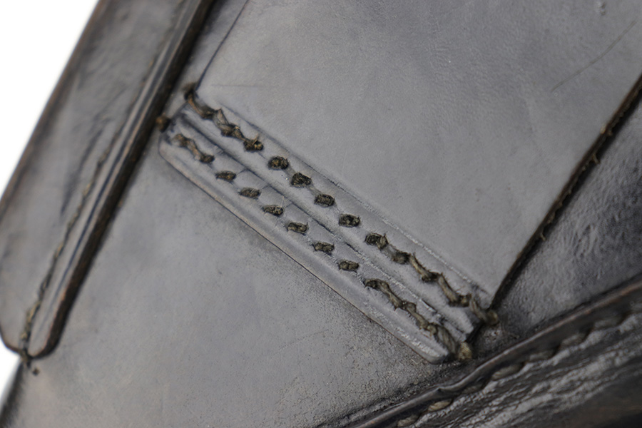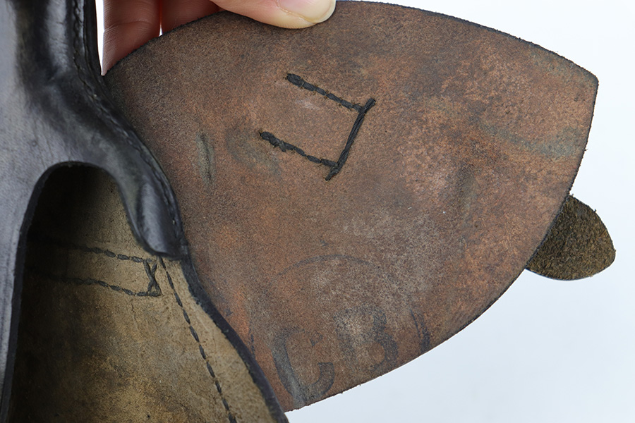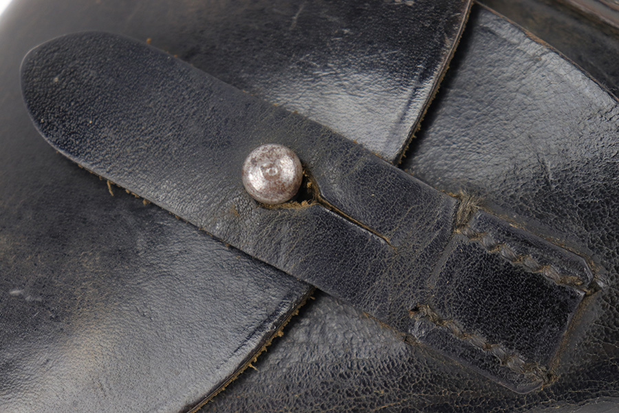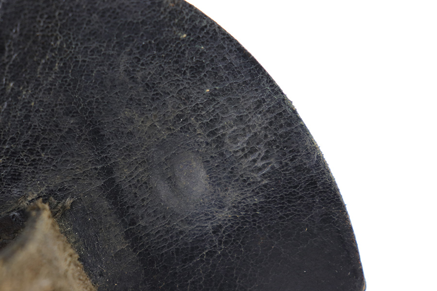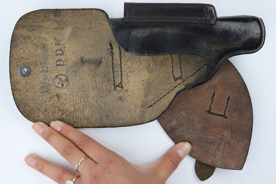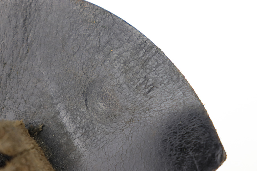 6/15/23 – This is an original black leather AKAH Walther PPK holster from WW2. The holster is desirable due to the uncommon “leading edge” style, as well as having black leather and stitching (often found with SS examples). The closure knob has remnants of black paint as well, as this was likely painted black during production. There’s a faint AKAH “D.R.G.M.” stamp under the closure strap, and the interior leather has an original Walther PPK ink stamp. There’s another small circular ink stamp on the interior leather that we’re not sure the significance of. The leather has mild surface wrinkling throughout and normal aging wear, but no excessive damage. All original stitching is intact.