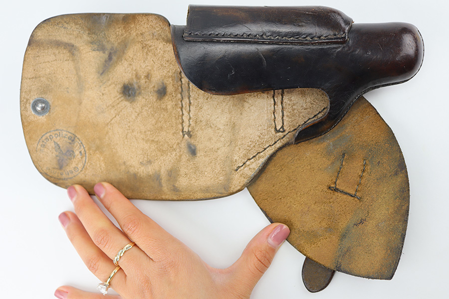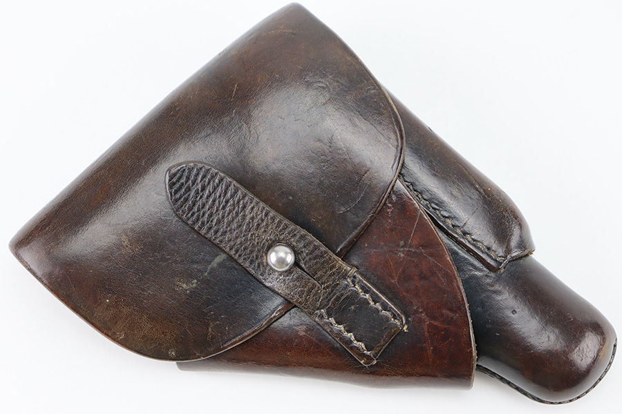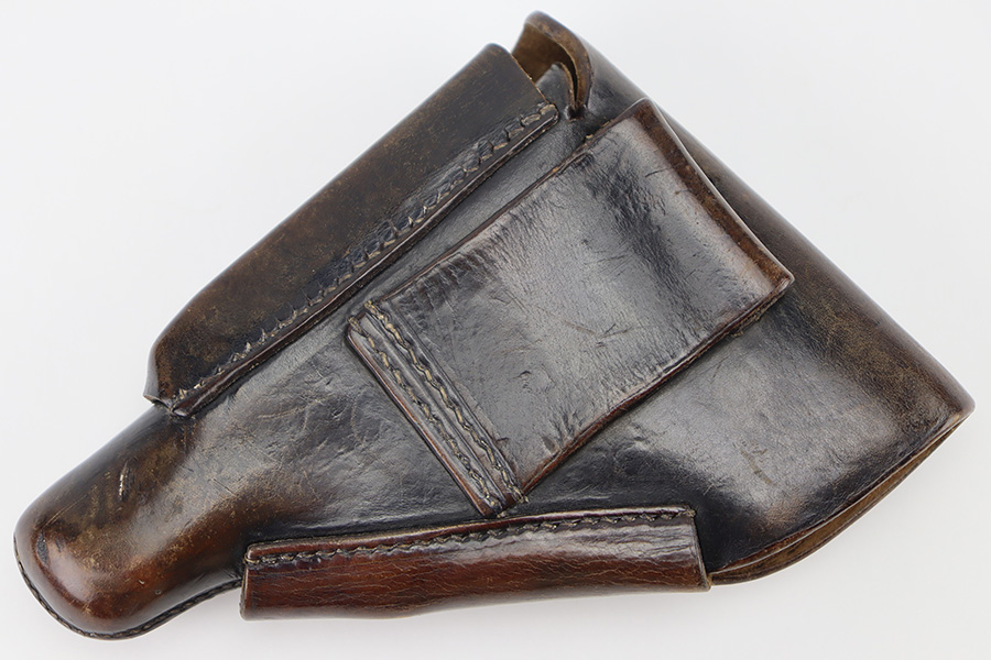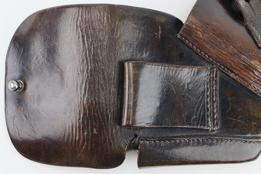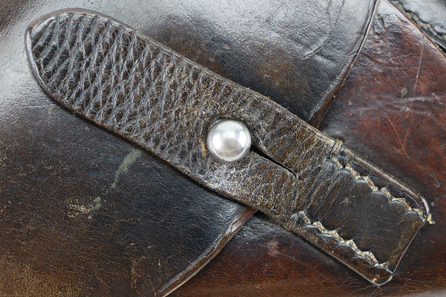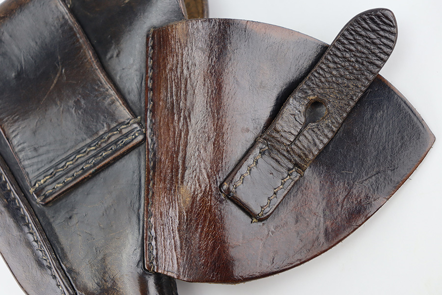 3/19/24 – This is a very nice Akah leading edge holster for a Walther PPK. Akah marked under the closure strap with an ink stamp on the inside. Excellent stitching. Nice leather overall with typical signs of wear.