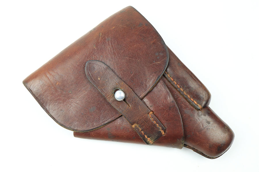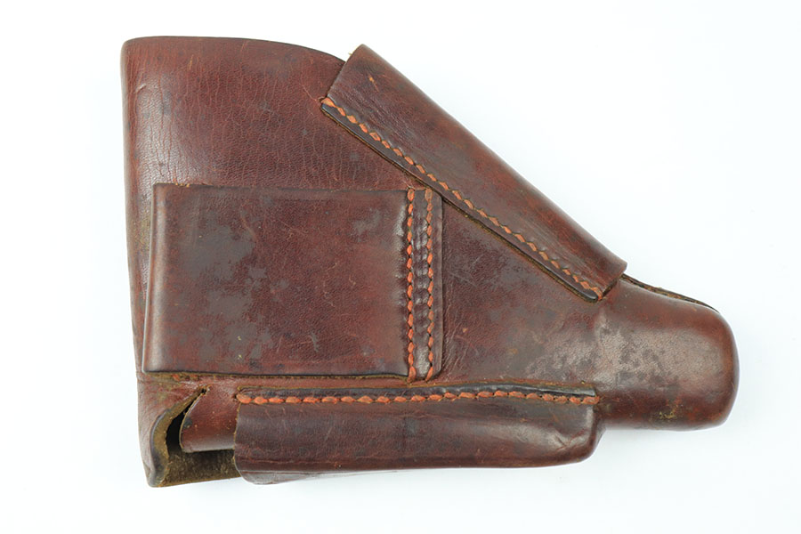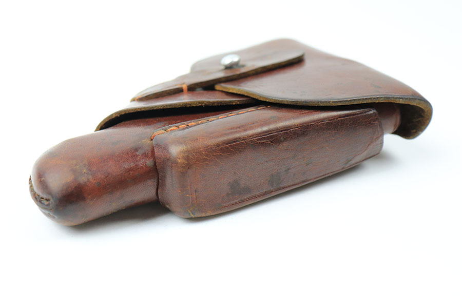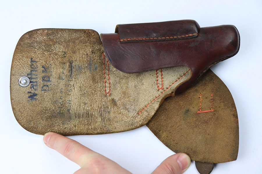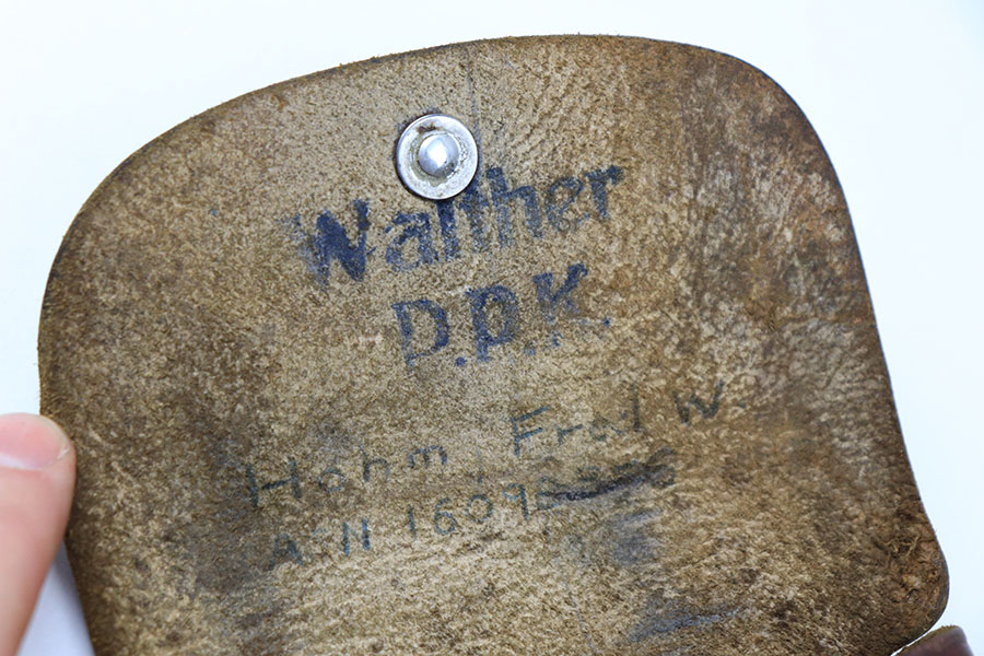 9/3/21 – This is an original Walther PPK AKAH Holster in the leading edge style. The holster has nice brown leather with honest wear and signs of previous use. The leather is soft and pliable yet still retains the original Walther PPK ink stamp on the interior leather, as well as an AKAH stamp under the closure strap. The interior leather also has some writing from a previous owner. No stitching issues.