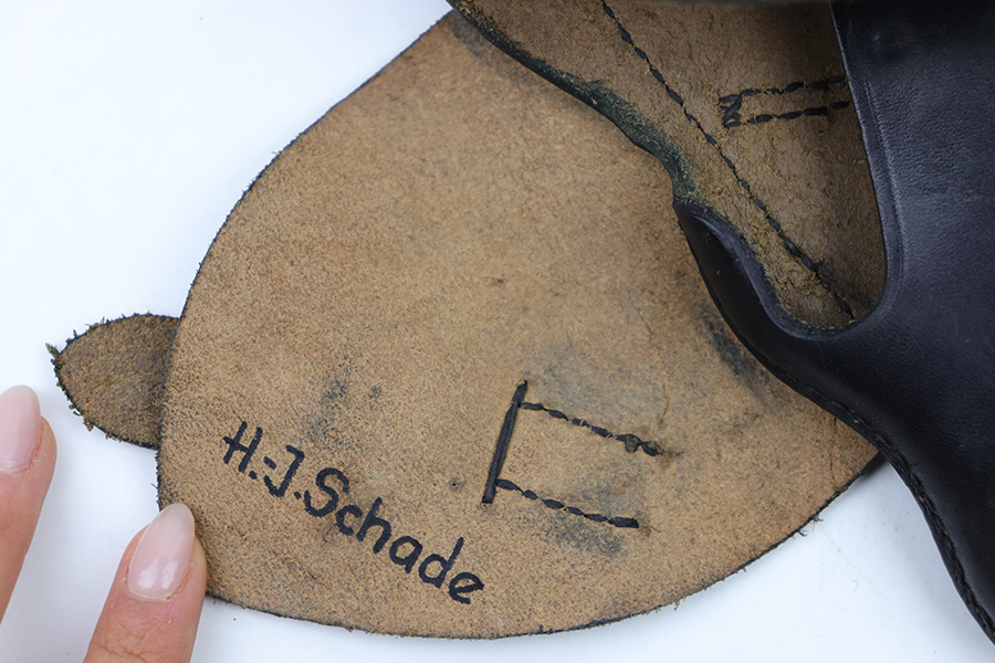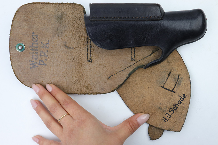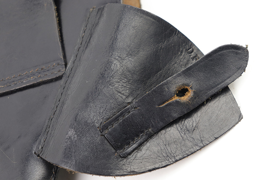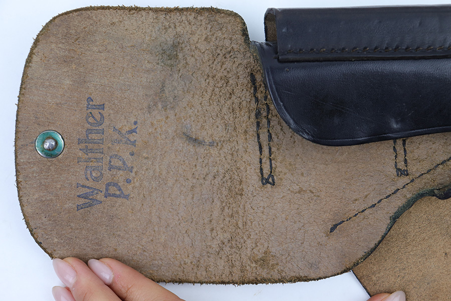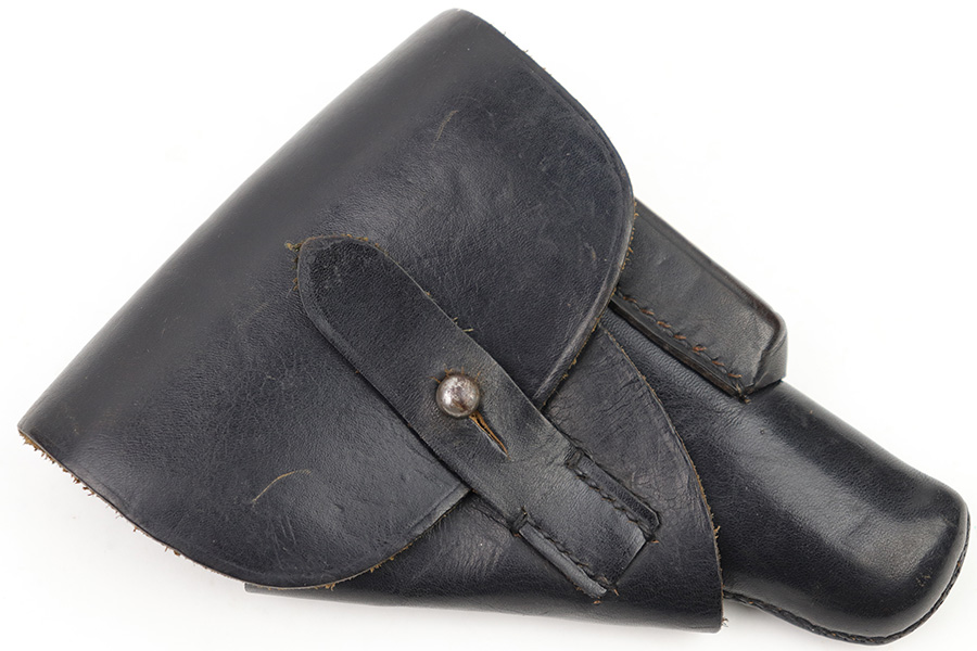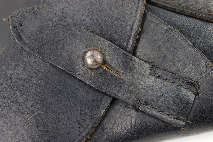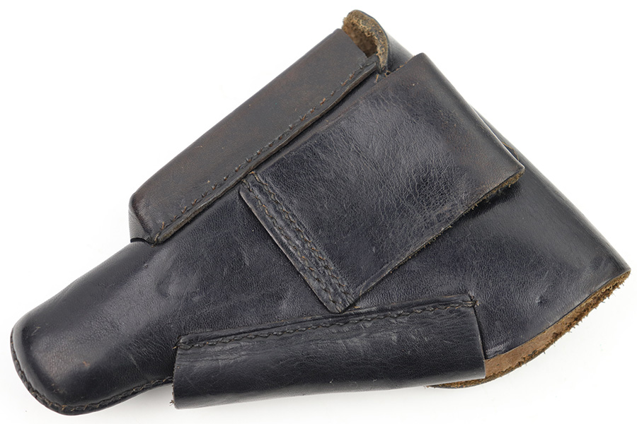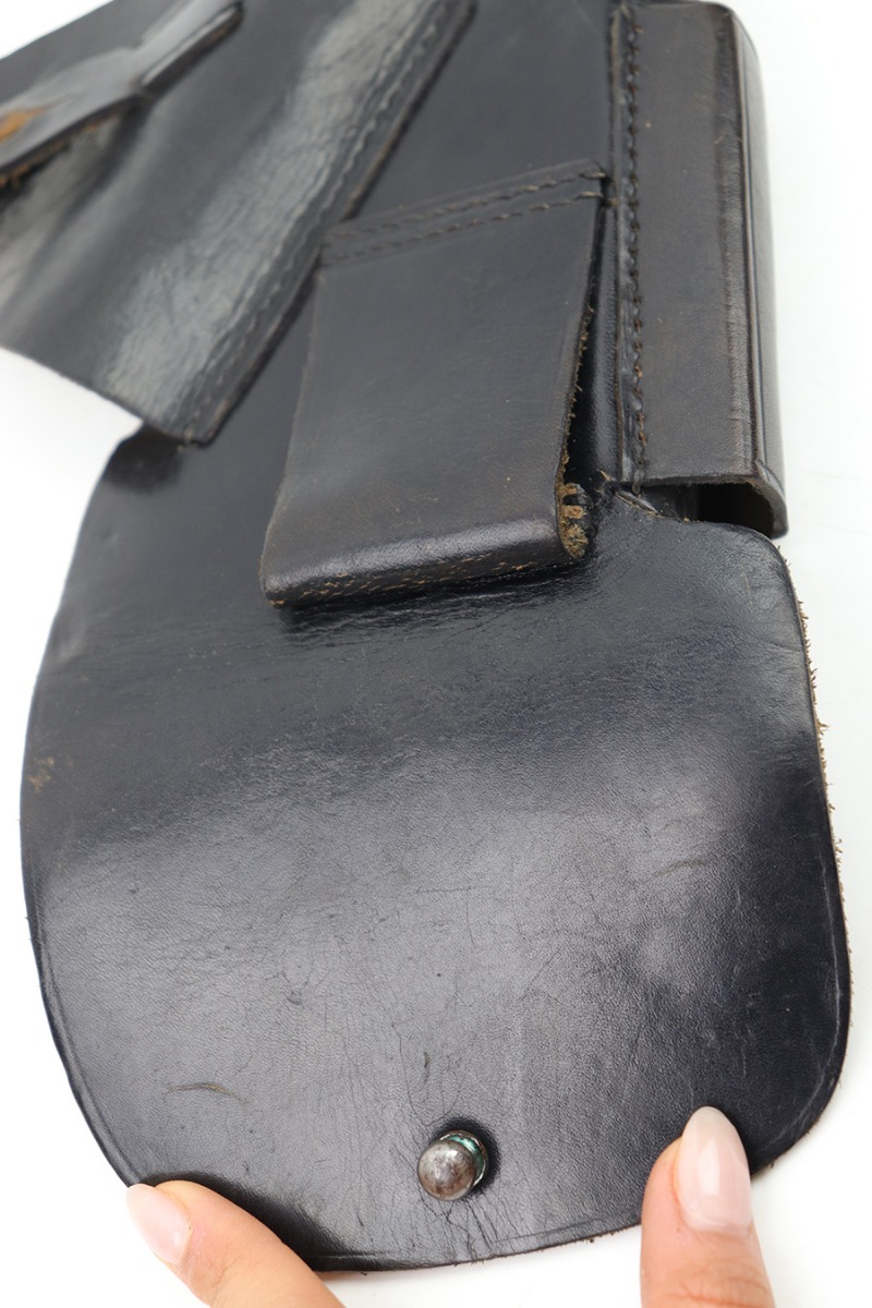2/22/23 – This is a desirable black leather leading edge style AKAH Walther PPK holster from WW2. The holster is in excellent condition with very nice black leather and all original black stitching. No notable stitching flaws, and very nice interior leather. The interior leather shows the original Walther PPK designation ink stamp clearly. The exterior leather has some mild surface wrinkling and light signs of aging. The leather is pliable but has no excessive wear or damage. AKAH maker stamped under the closure strap. These are often paired with SS issued Walther PPKs.