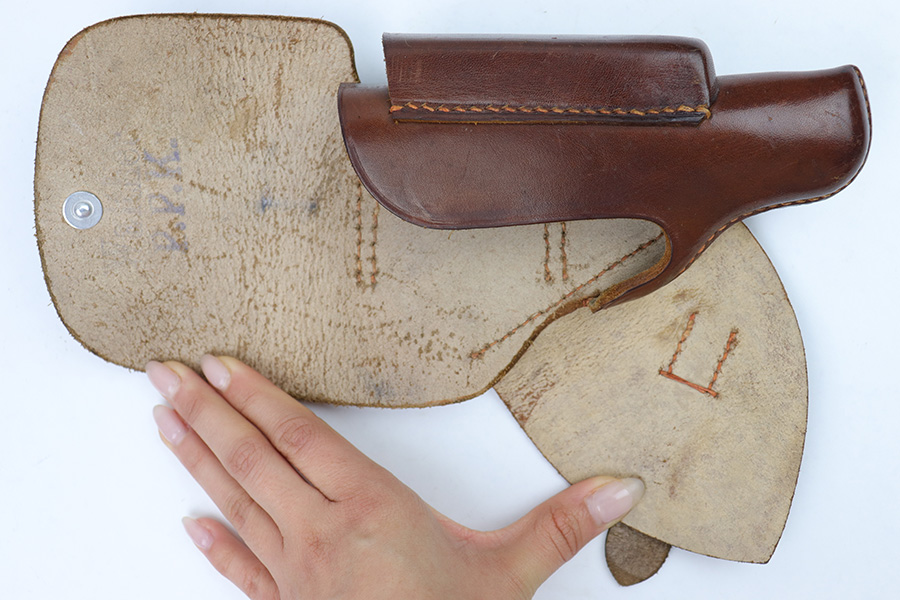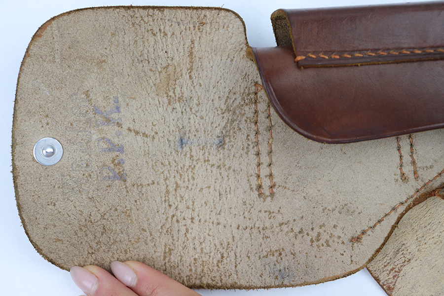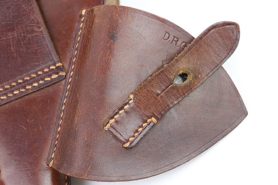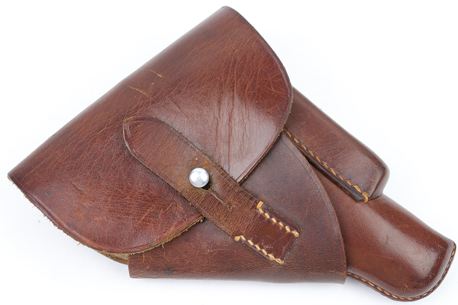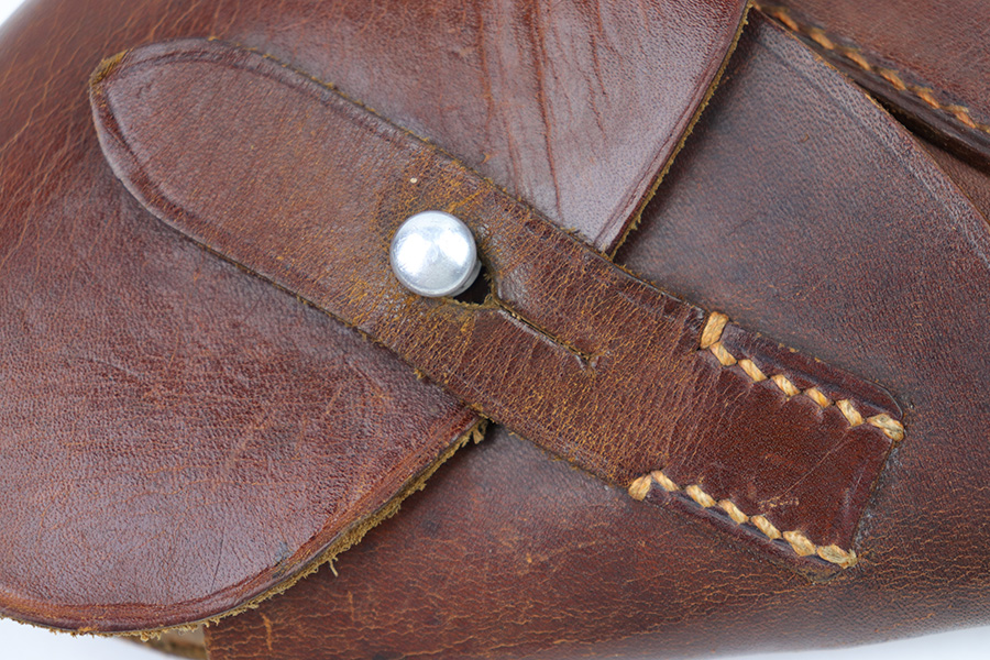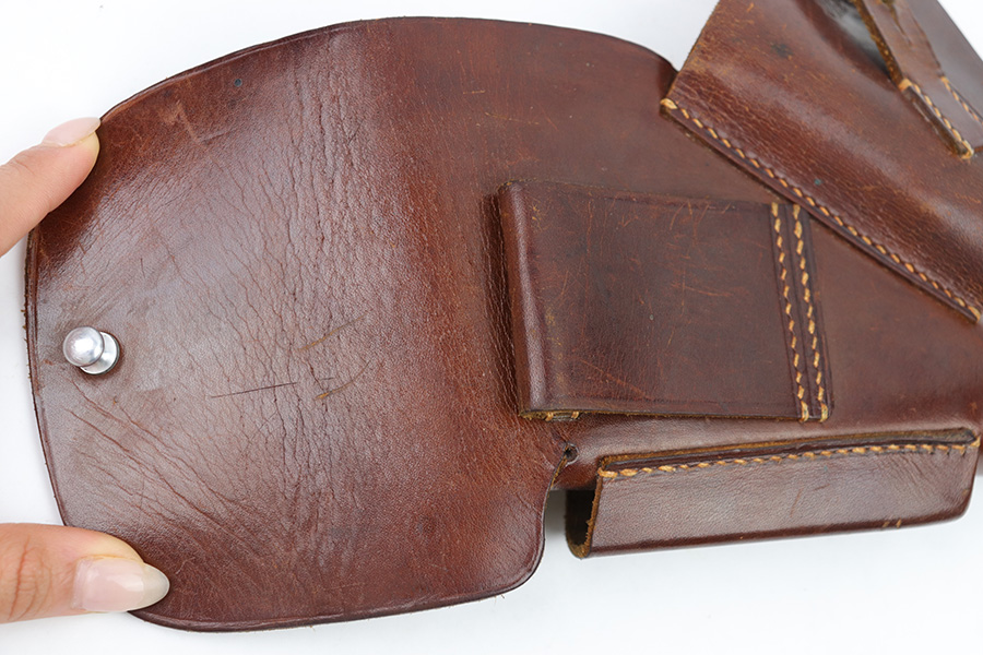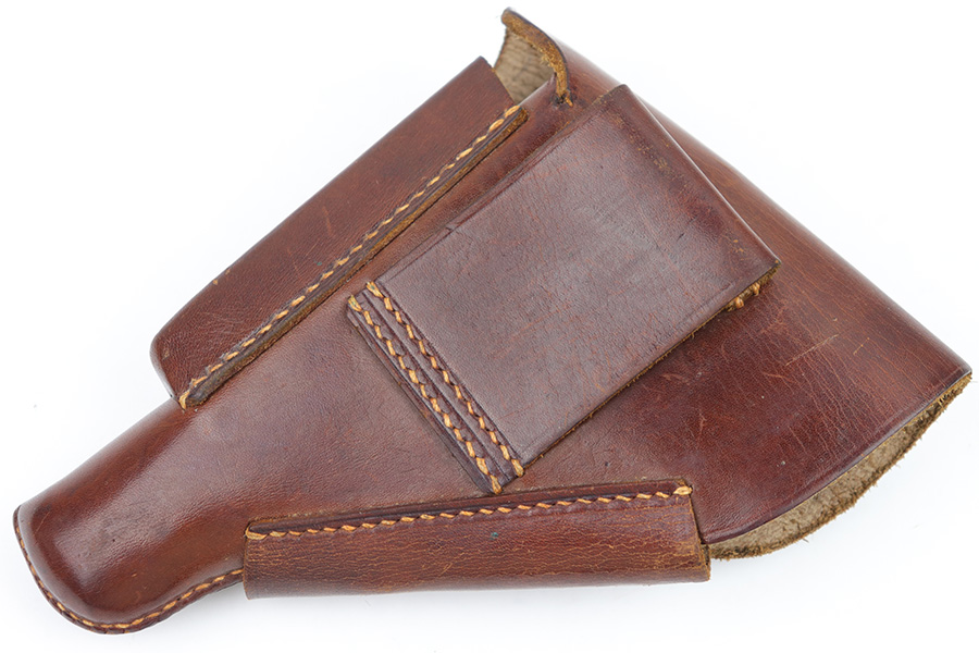 3/8/23 – This is an original WW2 AKAH Walther PPK holster. The holster is “leading edge” style with the magazine pouch along the edge of the holster instead of the front. The holster features excellent brown leather that has some mild surface wrinkling on the font lid and side flap, but no major issues. The interior leather is clean and still shows the original Walther PPK designation ink stamp. AKAH maker stamped under the closure strap. All original stitching is tight and intact. A very nice, scarce example WW2 PPK holster.