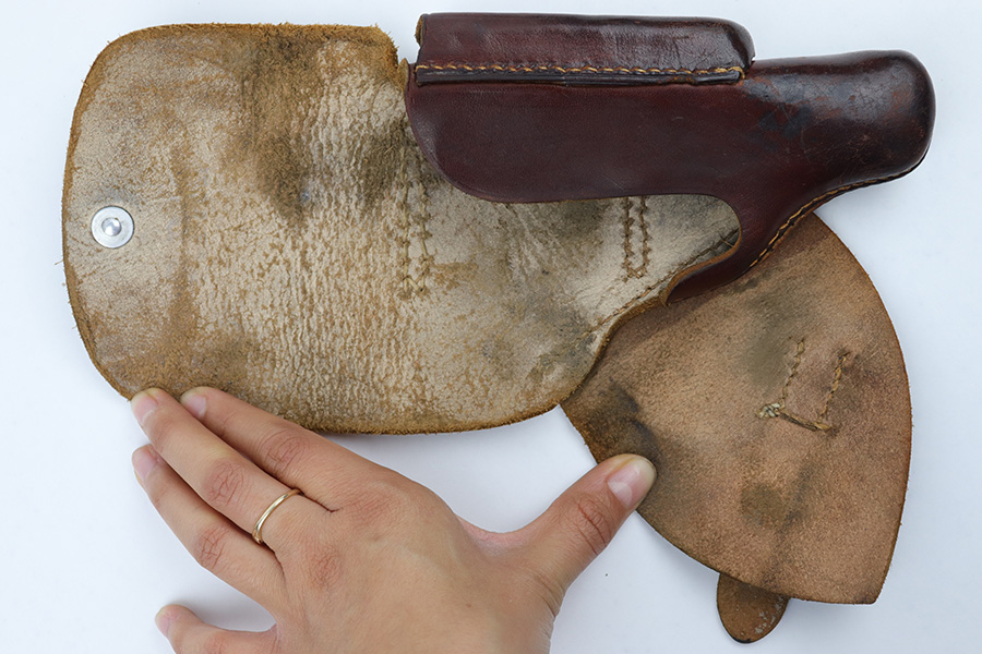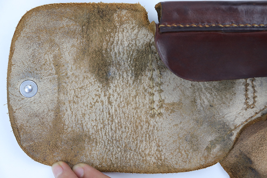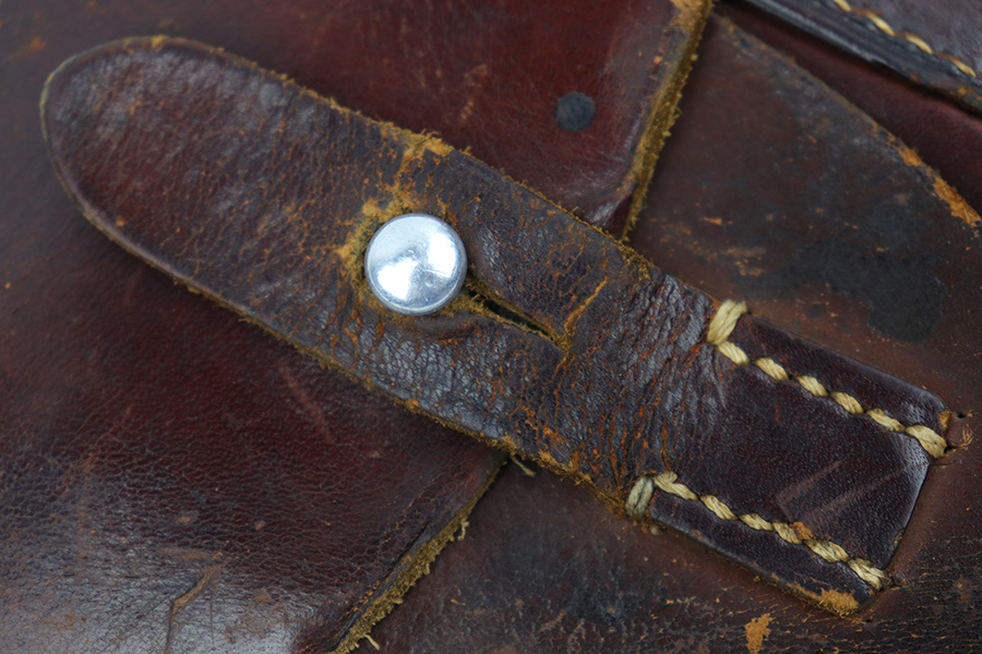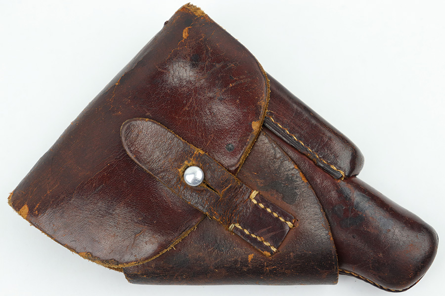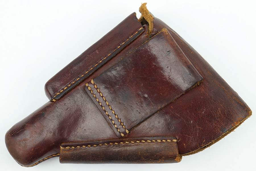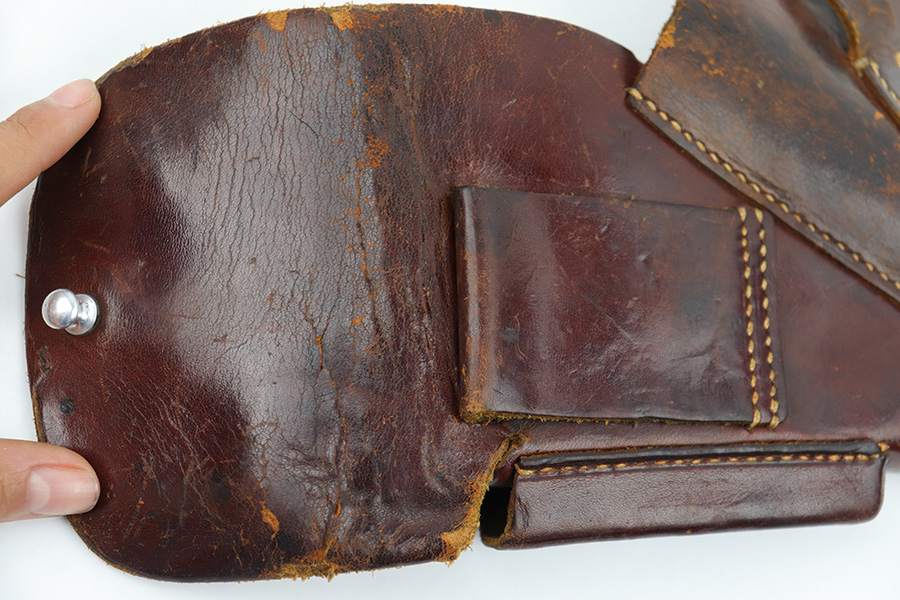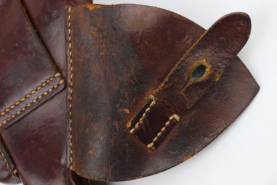 4/25/23 – This is an original WW2 production AKAH Walther PPK holster in the “Leading Edge” style. The holster is in very good overall condition with some light surface wrinkling throughout the top leather and side flap. There’s also mild scuffing around the edges of the lid, and dark spotty discoloration on the exterior leather. The rounded top leather has some cracking and scuffing on the surface as well. The interior leather is fairly clean with mild signs of previous use. All original stitching is in great condition. AKAH maker stamped under the closure strap.