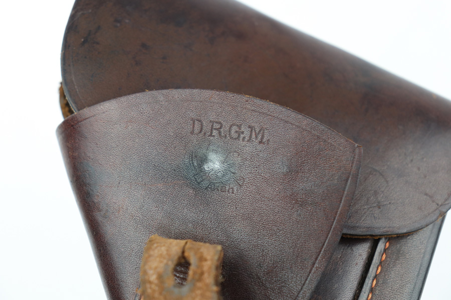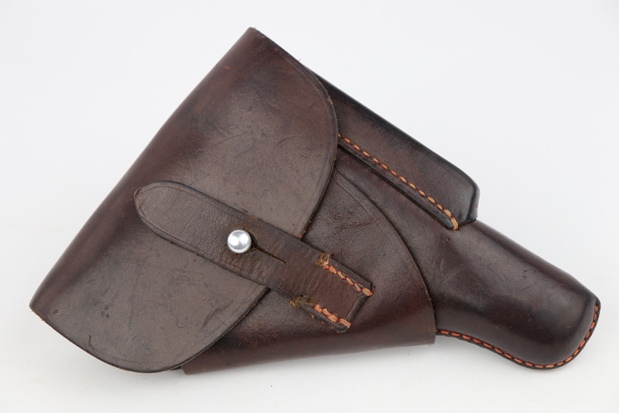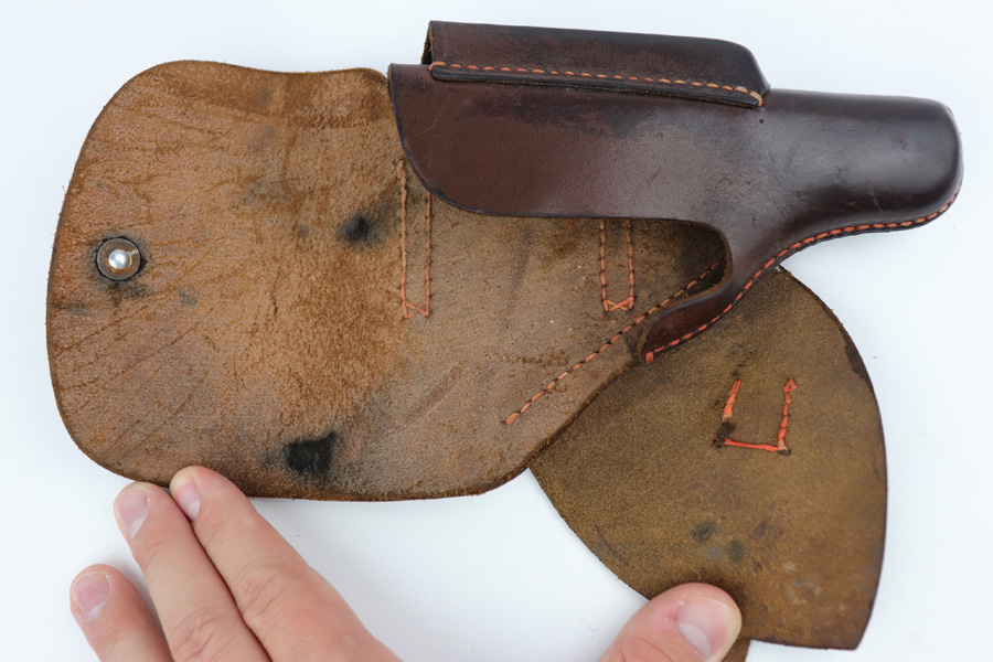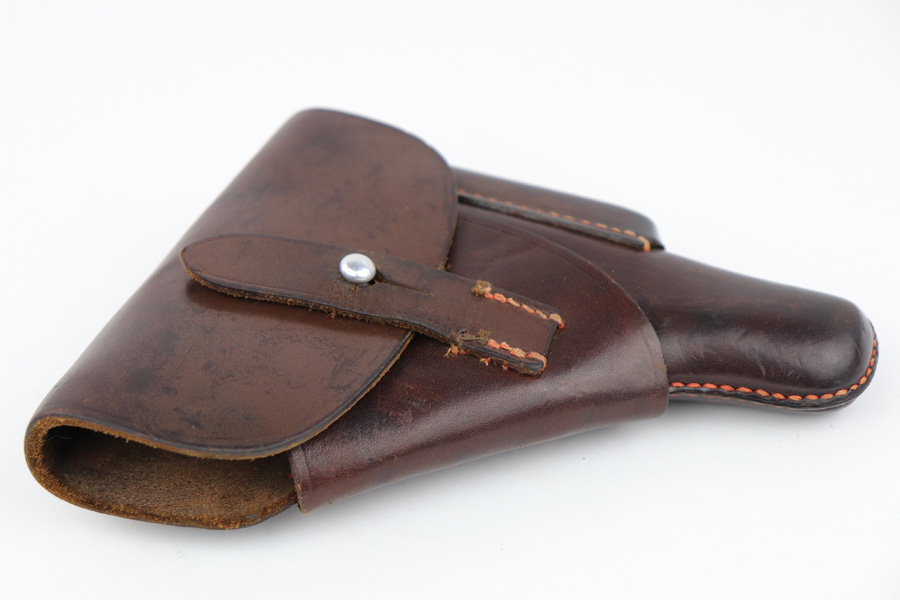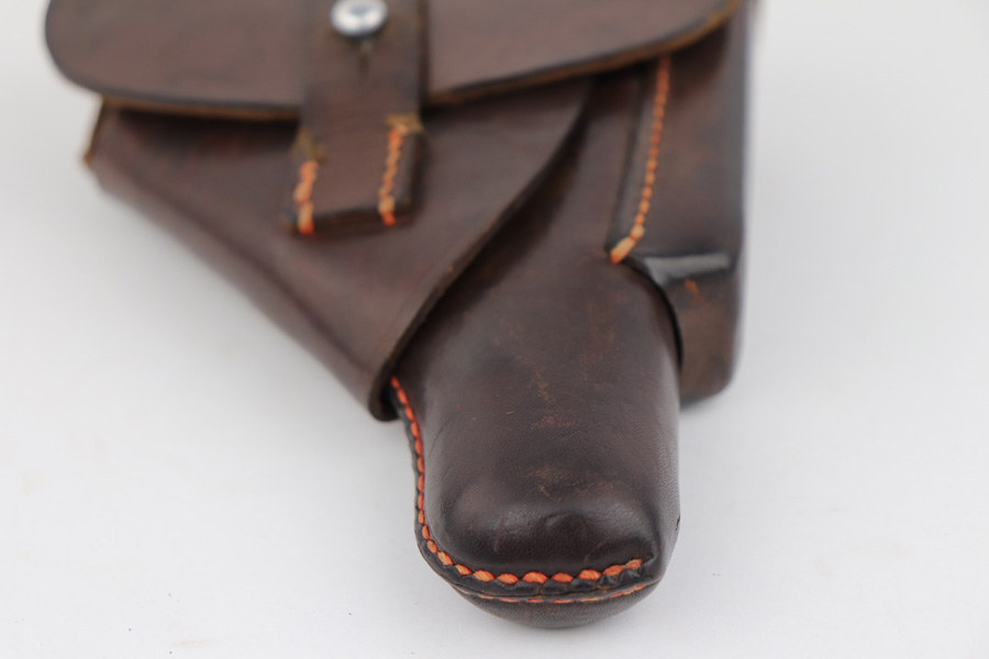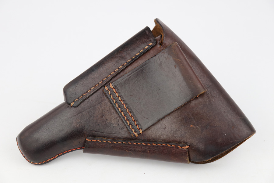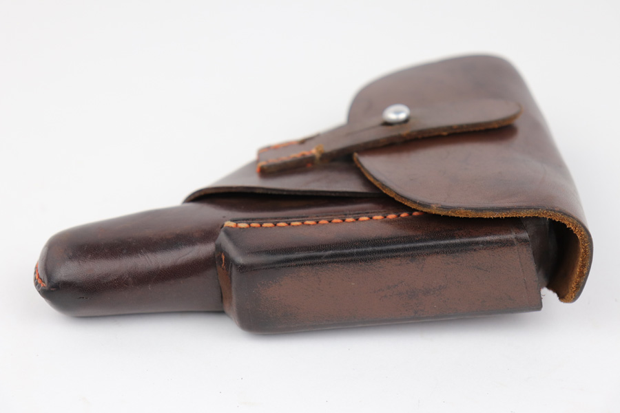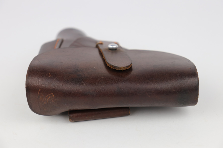 8/7/19 – This is an excellent, scarce variation Walther PP “leading edge” holster with very nice reddish brown leather. The interior leather is clean but shows signs of having held a pistol for a while. Exterior leather has a few minor and normal scuffs, but no major or notable wear. The front leather has a few areas where the leather looks to be a shade darker than the rest of the leather, and this is likely due to sun exposure / normal aging. All original stitching is tight and in tact. AKAH stamped under the closure strap. All original and authentic.