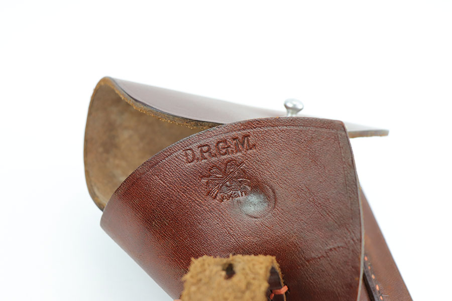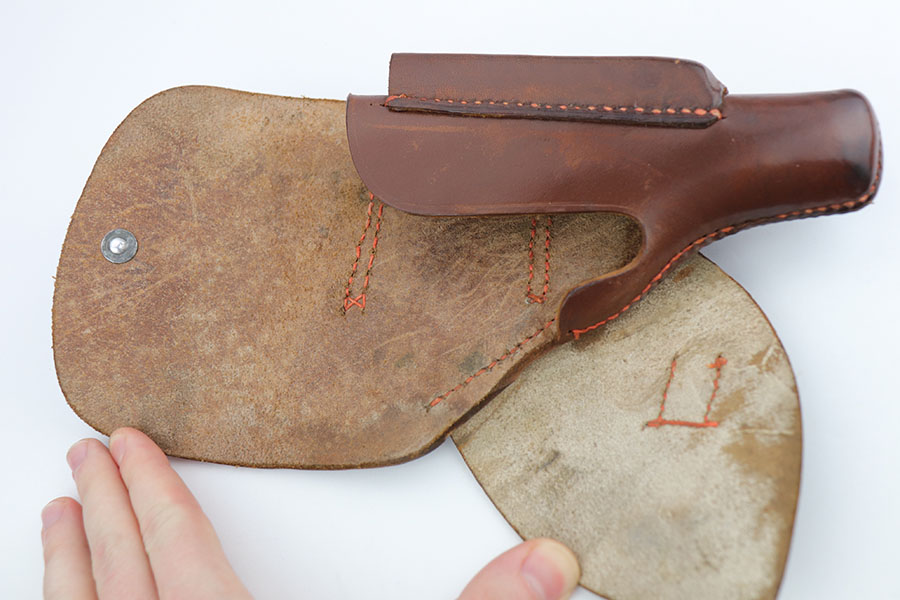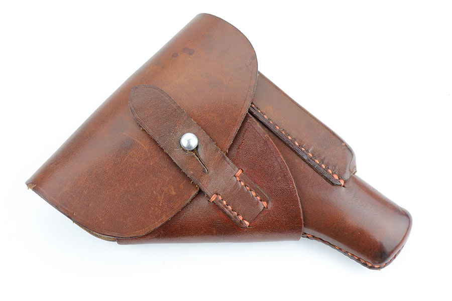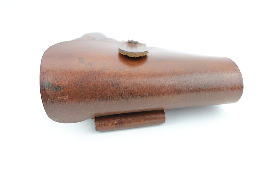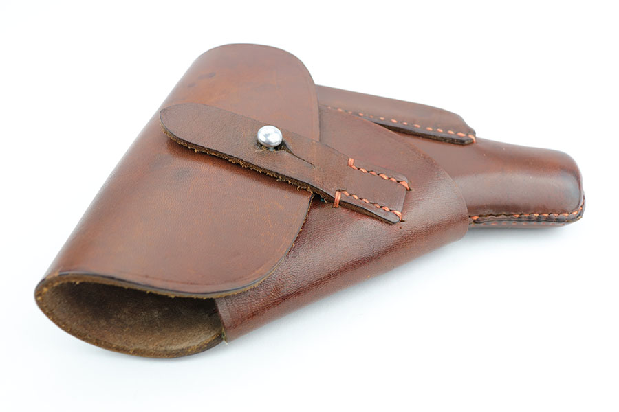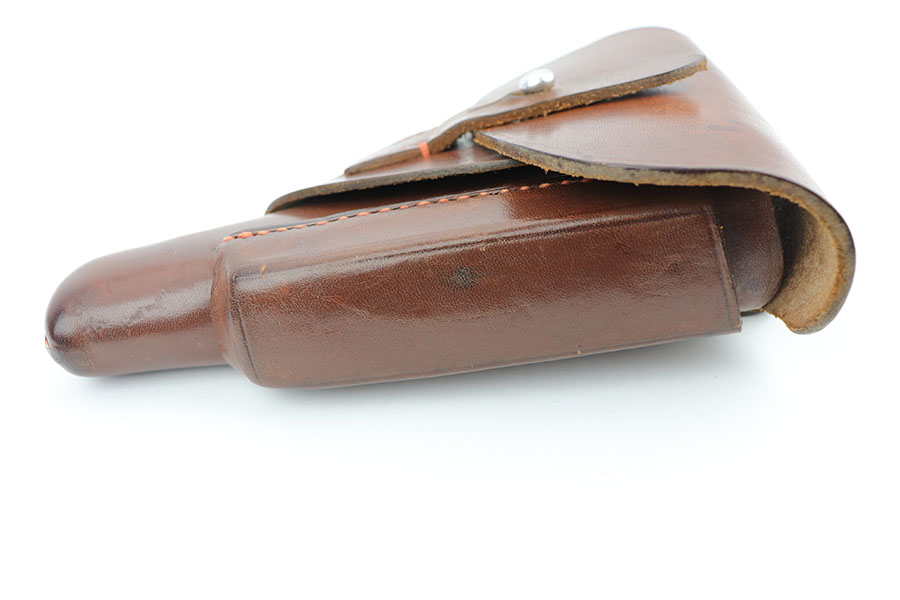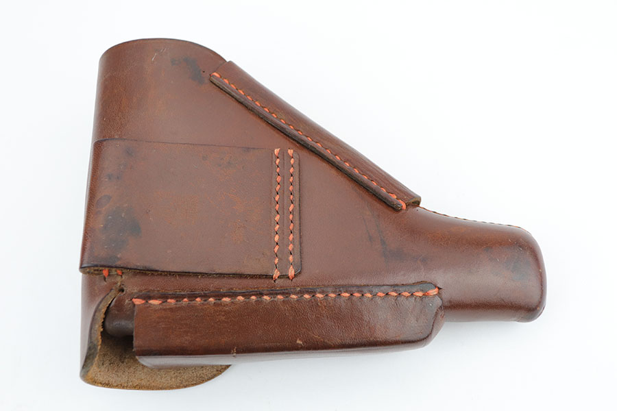 10/18/19 – This is an original leading edge style Akah holster made for a PP or PPK. The holster is AKAH maker stamped under the closure flap. The interior leather has a faint remnant of the original Walther ink stamp. The leather and stitching are all original and excellent. The only flaw is that the leather is very tight around a Walther PP (but this is due to shrinking of the leather over time, and is very common). It fits a PPK very well, but the PP is a very tight fit. Most likely made for a Commercial gun in the pre-war to early WW2 era.
