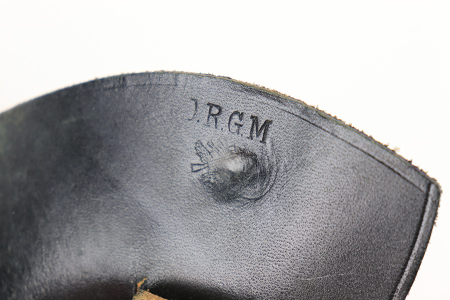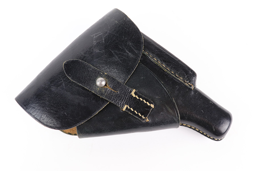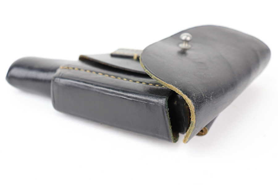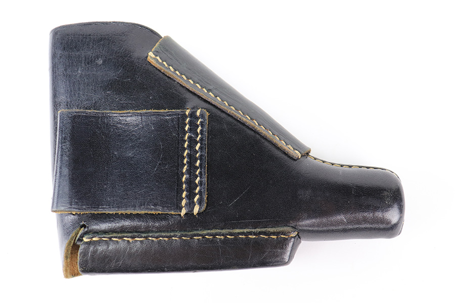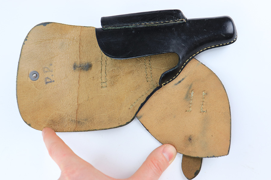 3/21/22 – This is an original and extremely desirable leading edge style AKAH Walther PP holster. The holster is in excellent overall condition, and very hard to upgrade! The leather is pliable but holds nice shape and has some mild surface wrinkling but no cracks or issues. Clean interior leather with a “P.P.” ink stamp. Nice straw colored stitching throughout is tight and without issue. AKAH stamped under the closure strap.