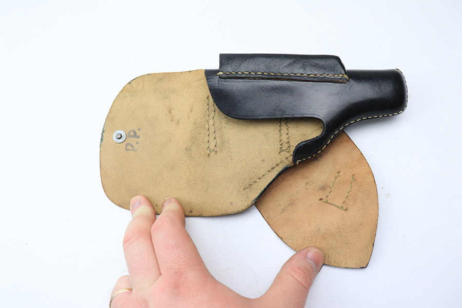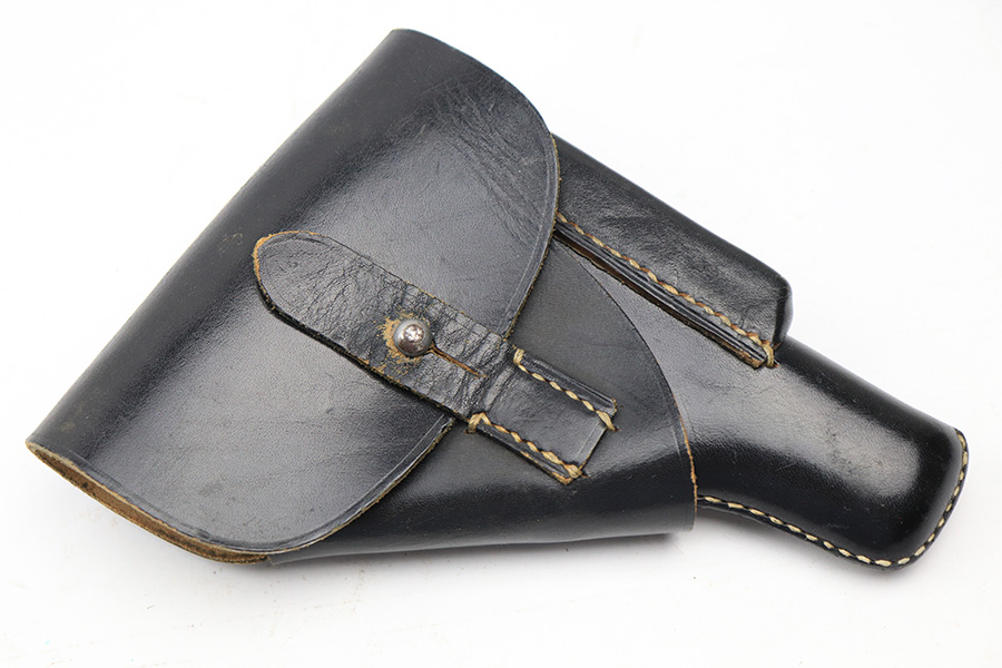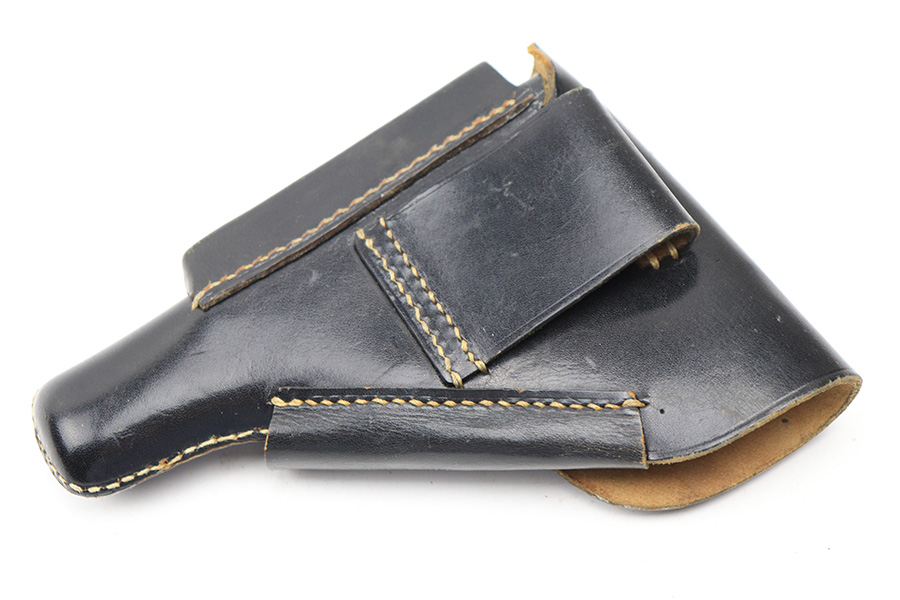 5/12/22 – This is an original leading edge style Walther PP holster from WW2. The holster is in excellent condition with very clean black leather and all original straw colored stitching. The leather has a very clean interior and crisp “PP” interior ink stamp. There’s an AKAH maker stamp under the closure strap. A hard-to-upgrade example.