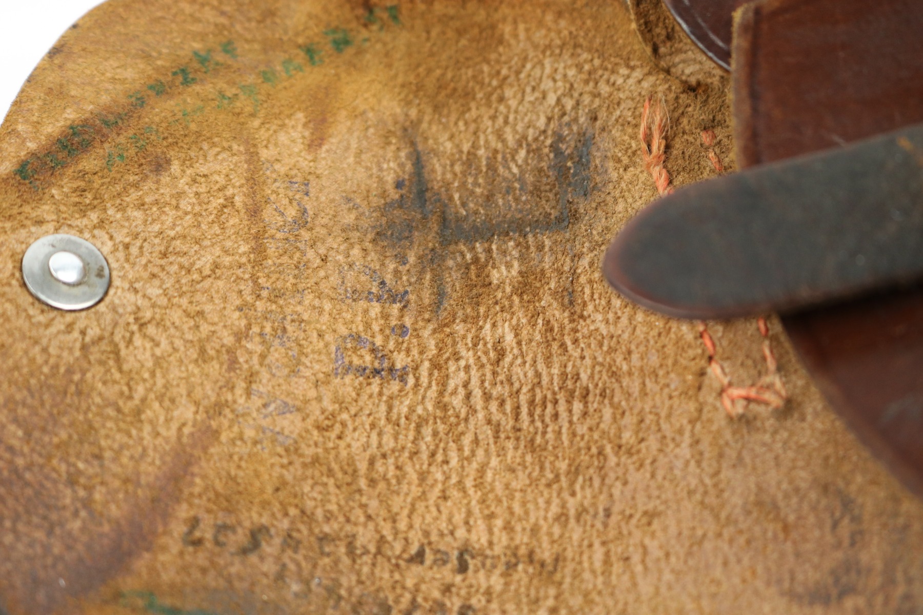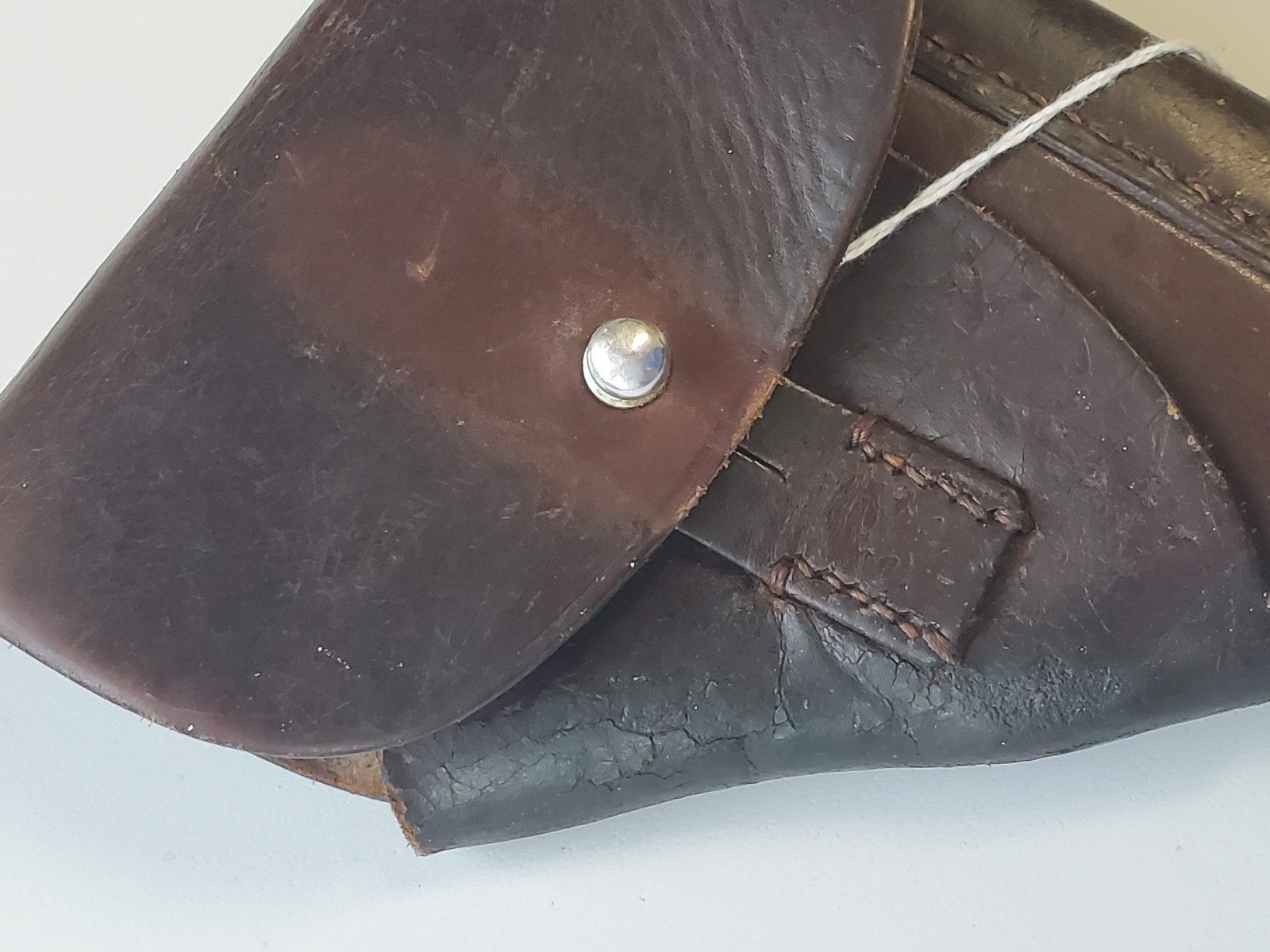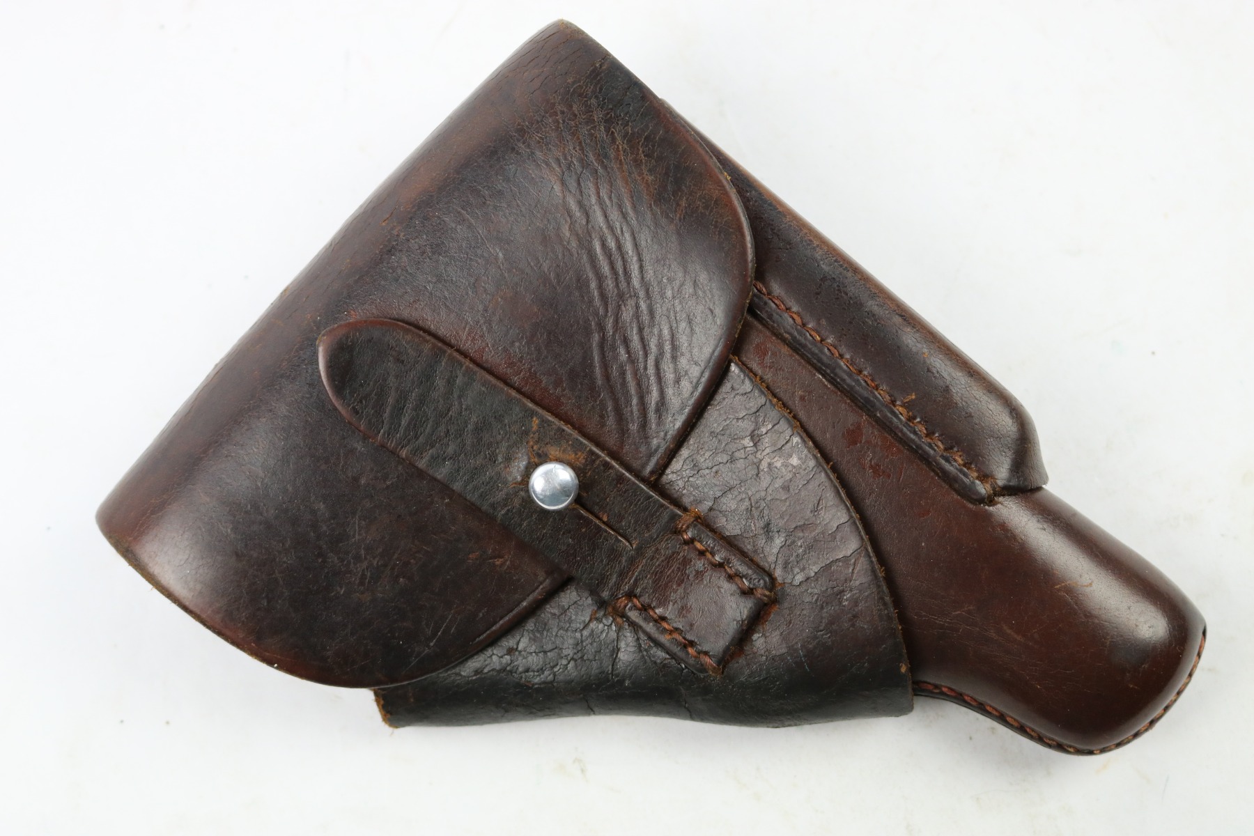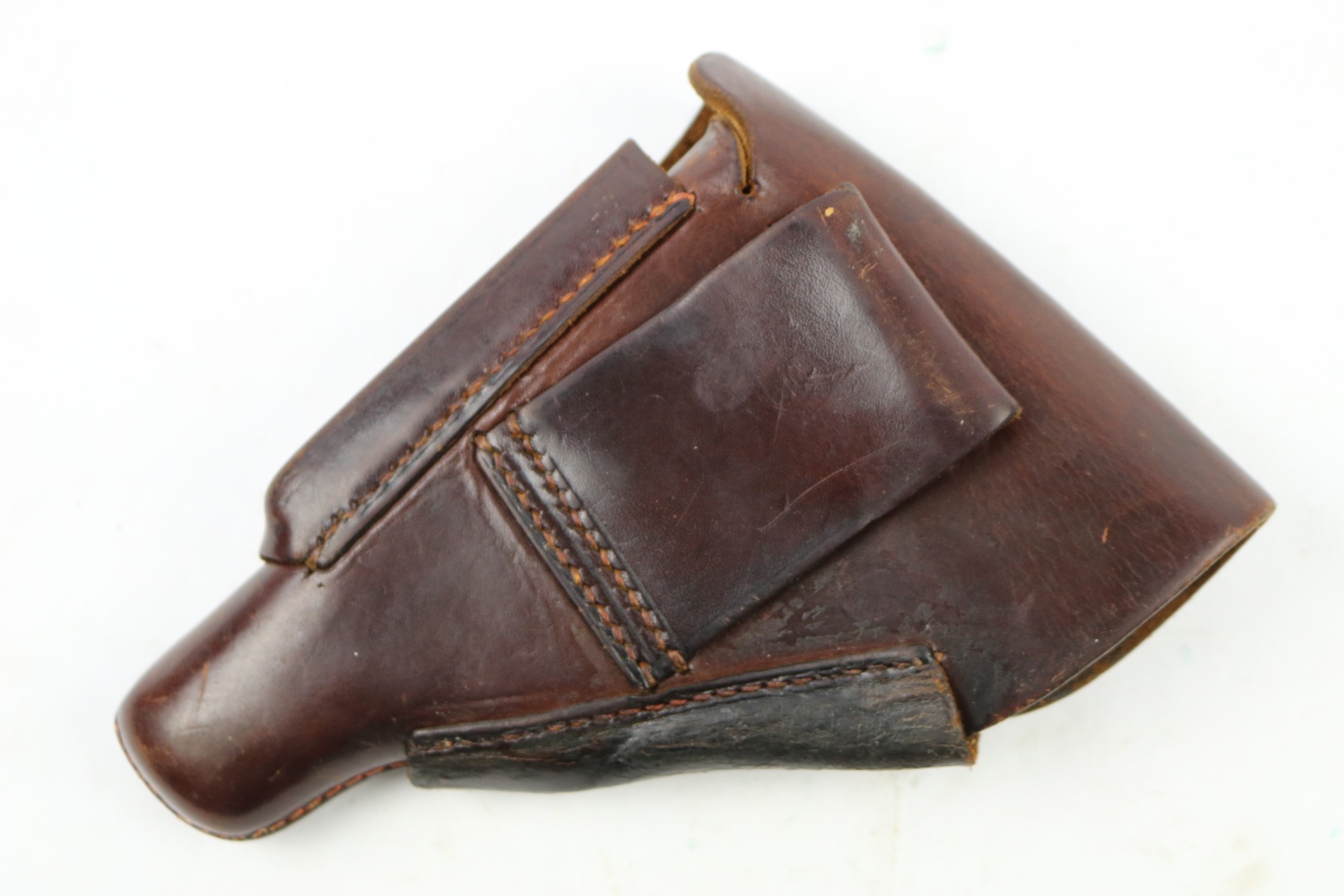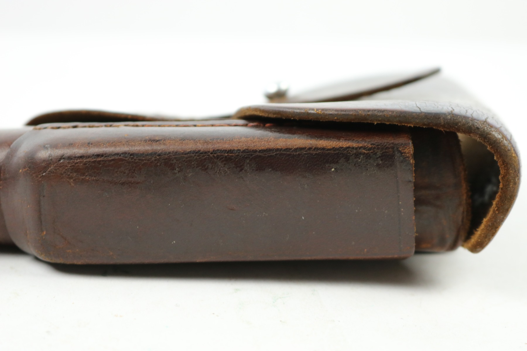 4/11/19 – This is an original WW2 production leading edge AKAH Walther PPK holster. The holster is in good condition overall with some exterior leather cracking on the side flap. The remaining leather has no notable flaws outside of normal use wear and pliability. The stitching is all original and in tact. The interior leather looks used, and has a faint remnant of the interior ink stamp “WALTHER P.P.K.”. There is an AKAH maker stamp under the closure flap. Guaranteed original.