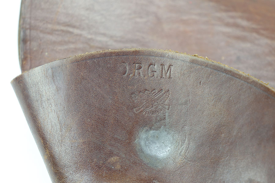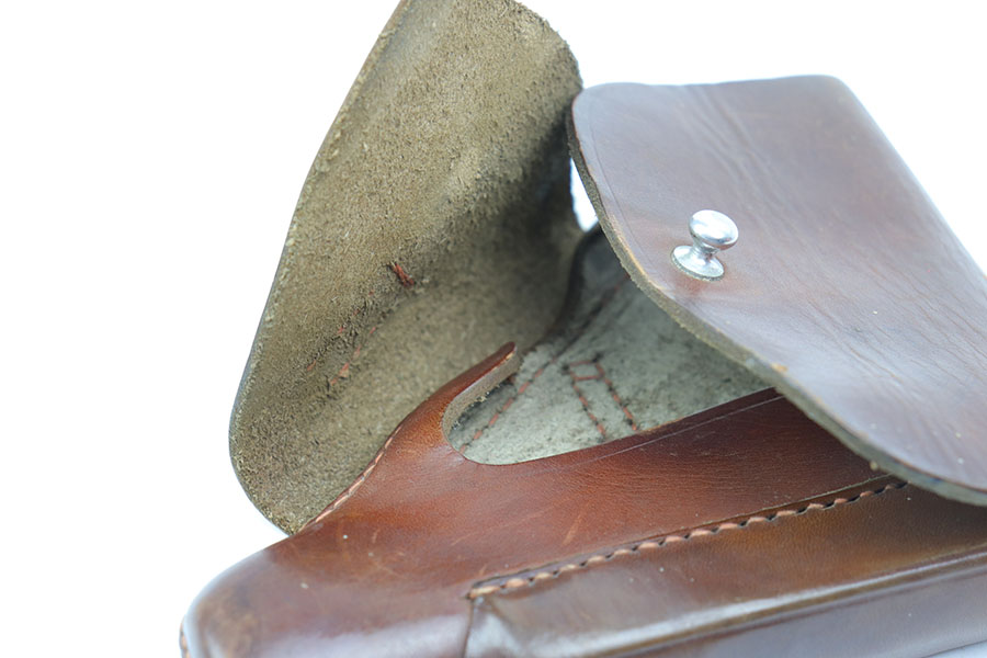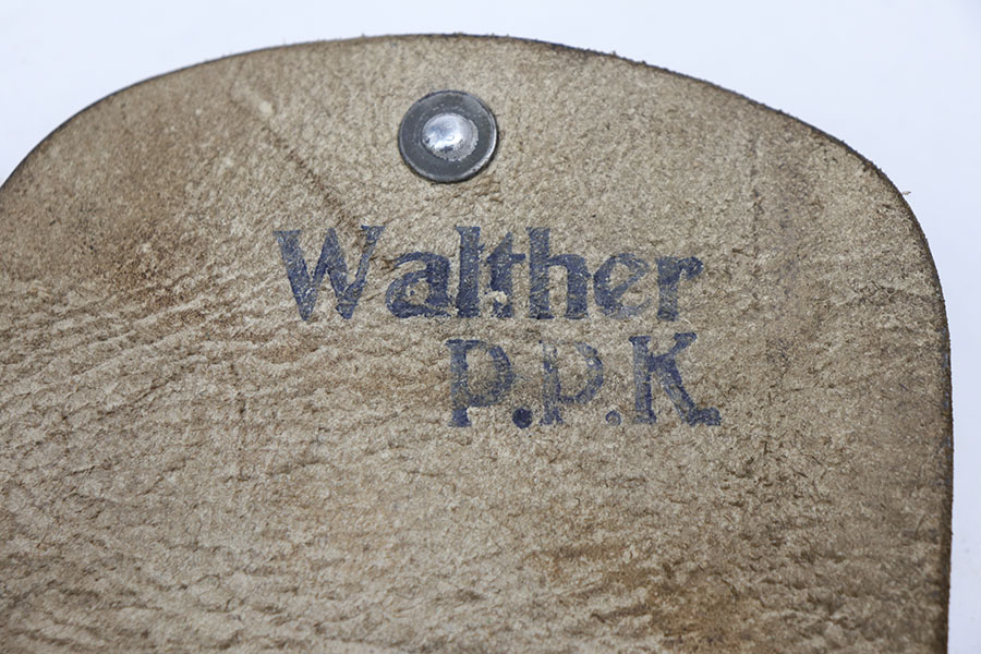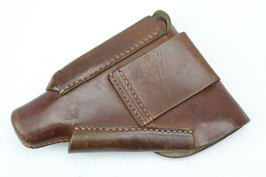 9/17/20 – This is an original brown leather leading edge style PPK holster. AKAH DRGM maker stamped under the closure strap. The interior leather has a strong, original PPK ink stamp. No other markings. The brown leather has some light wrinkling and normal signs of aging, but is in great overall condition with no major cracks or scuffs. Clean interior leather and all original stitching in tact.