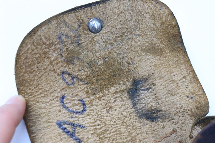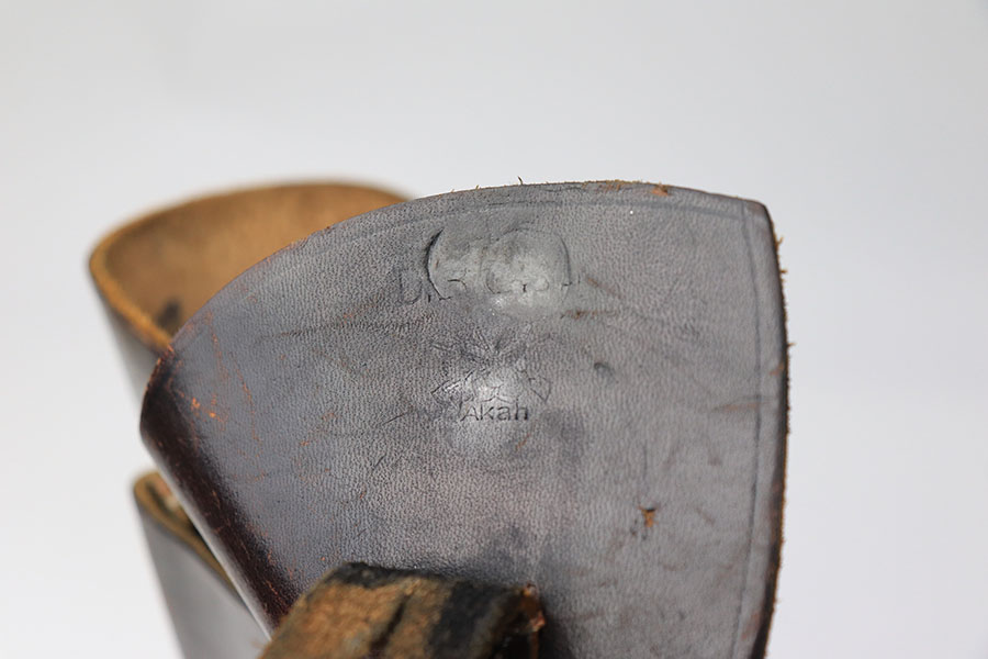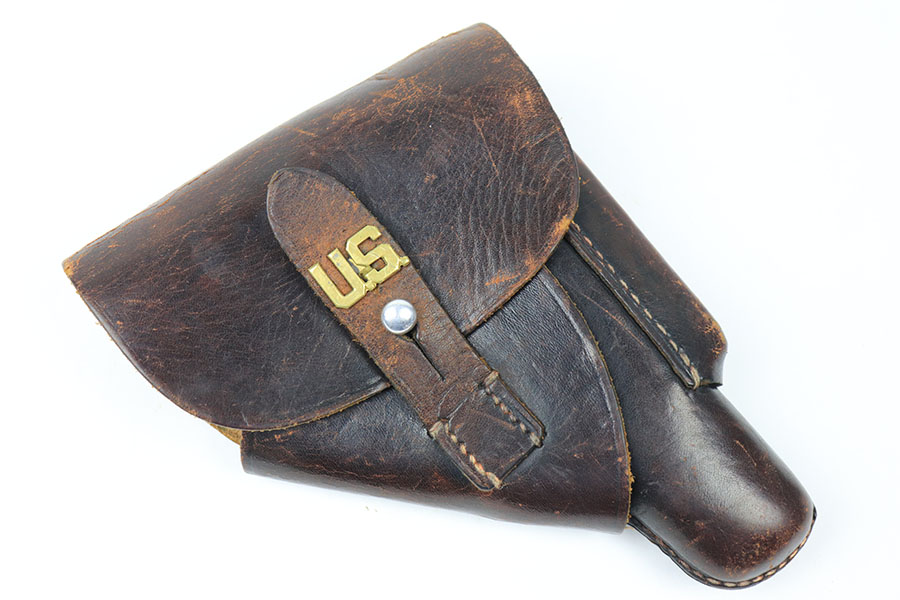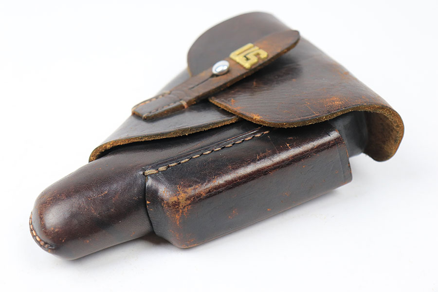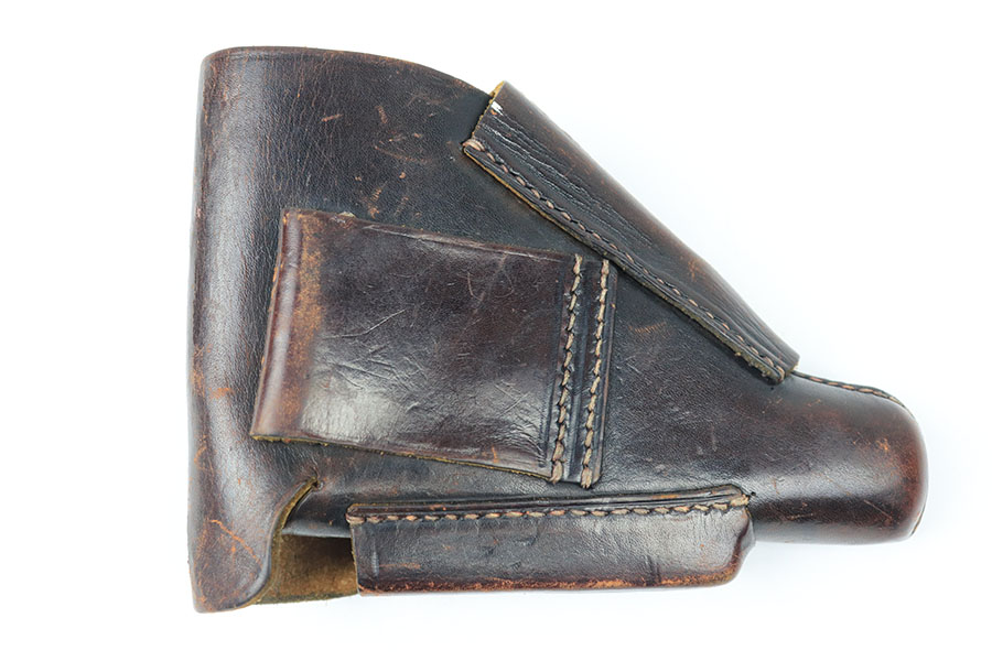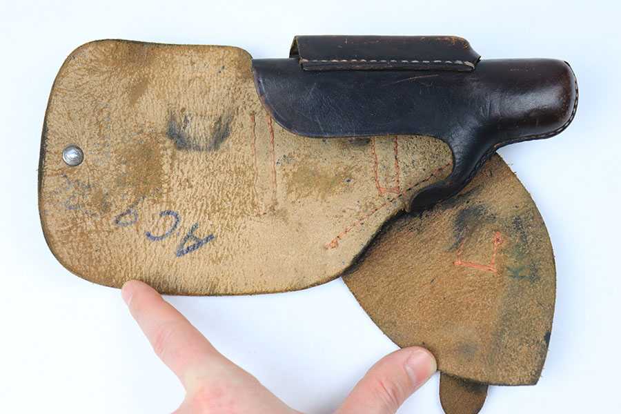 8/24/21 – This is an original AKAH Walther PPK holster, in the desirable Leading Edge style. The holster has black leather that has faded somewhat throughout. The leather is in great overall condition though with no major wear or issues. The interior leather has some writing, and the original Walther PPK ink stamp is barely still visible. The holster also has an AKAH stamp under the closure strap, and a “US” uniform embellishment pinned to the closure strap – likely from the vet who captured this. The stitching is tight and all original.