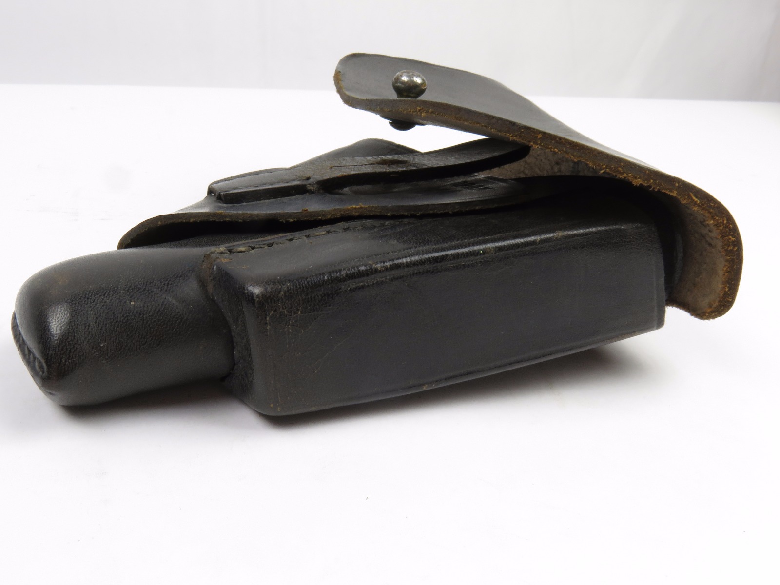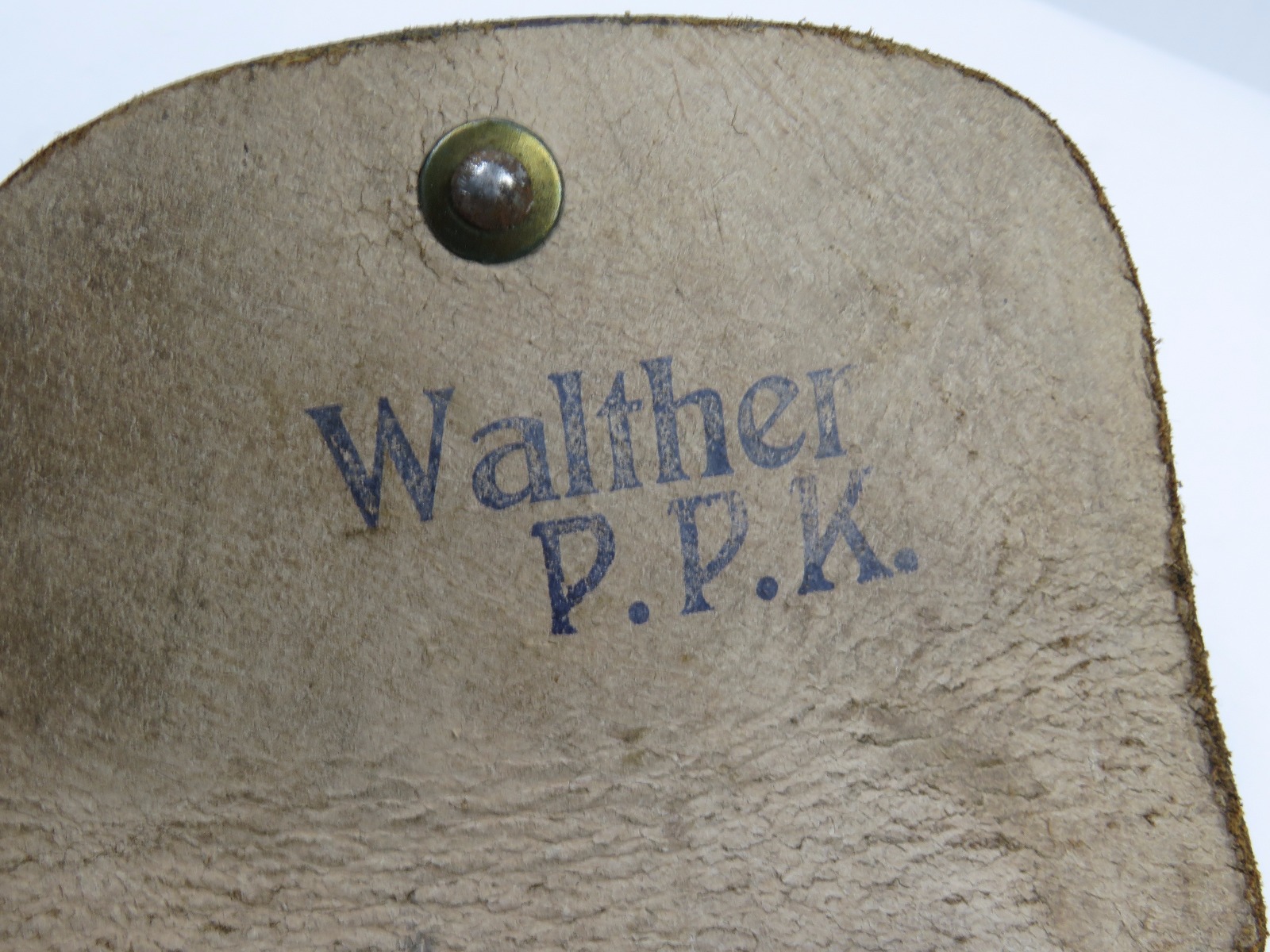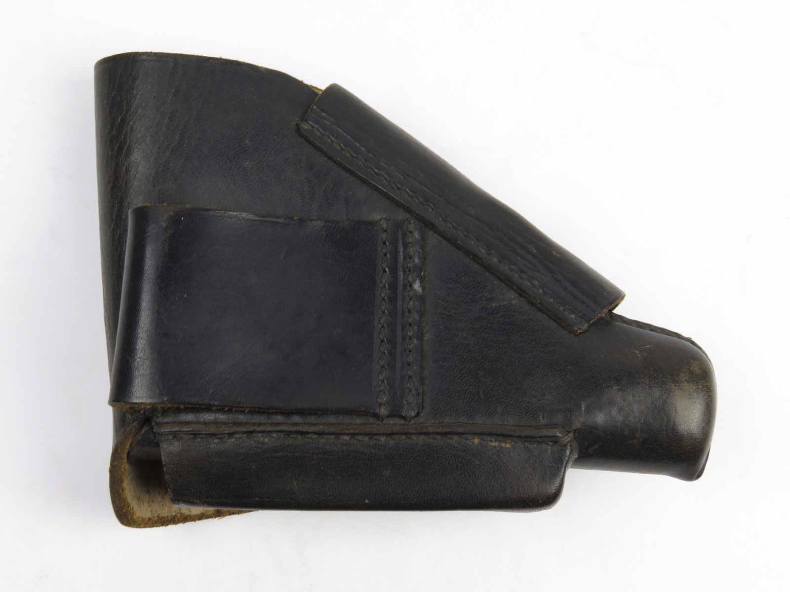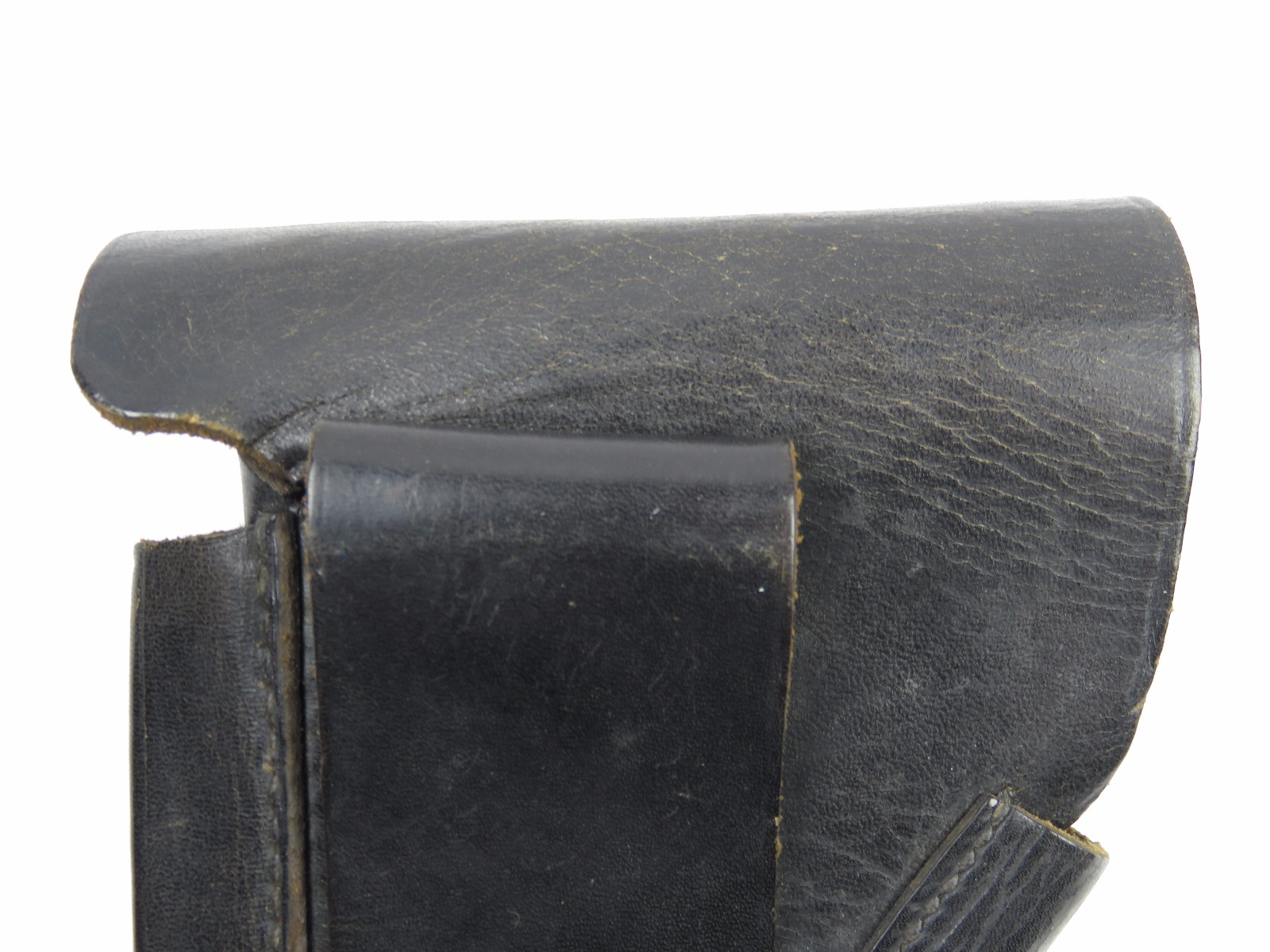 11/13/17 – This is an original WW2 production Walther PPK AKAH holster. The holster is leading edge, meaning the magazine pouch is on the side of the holster instead of in the front. This feature plus the black leather is speculated as “SS” issued among the collector community. The holster has firm leather that’s in great shape overall. The exterior leather has some wrinkling and surface wear, but the interior leather is near mint! The interior ink stamp is original and as nice as I’ve seen. There is also an AKAH DRGM stamp under the closure strap. The black stitching is all original and in tact as well. Free shipping on this item!