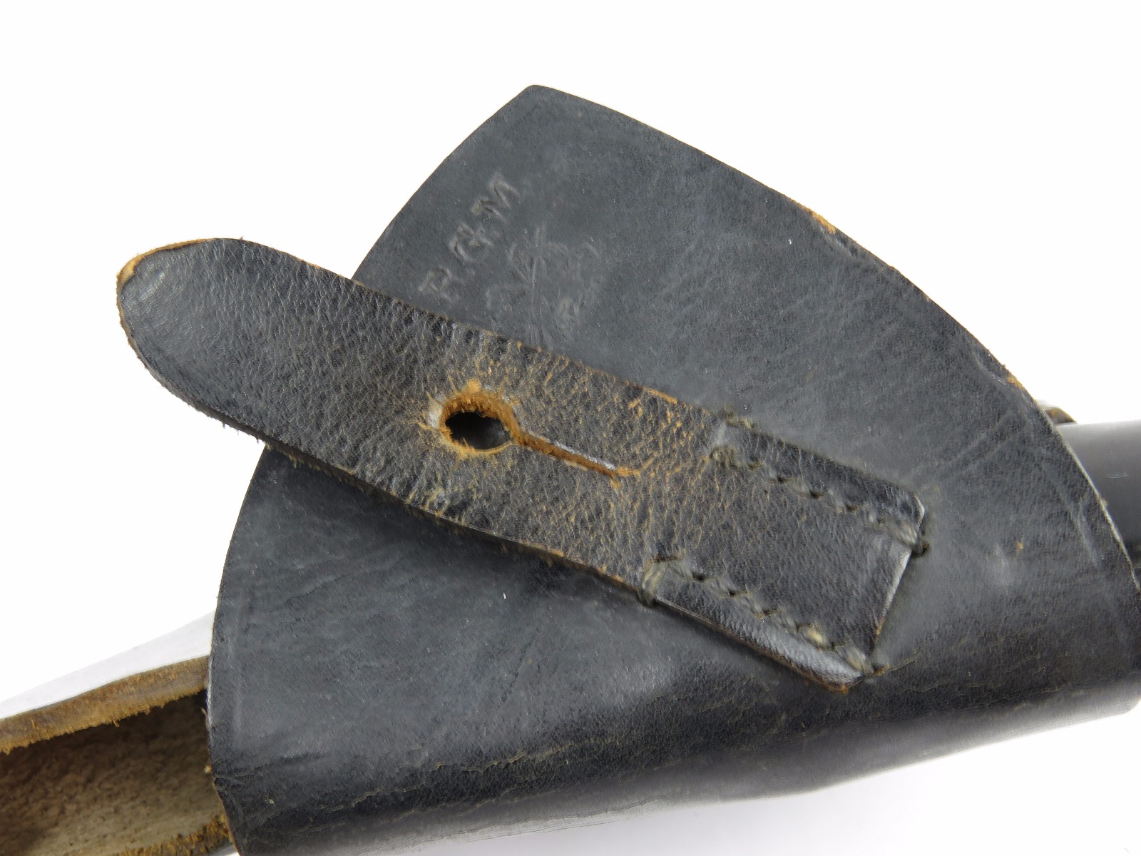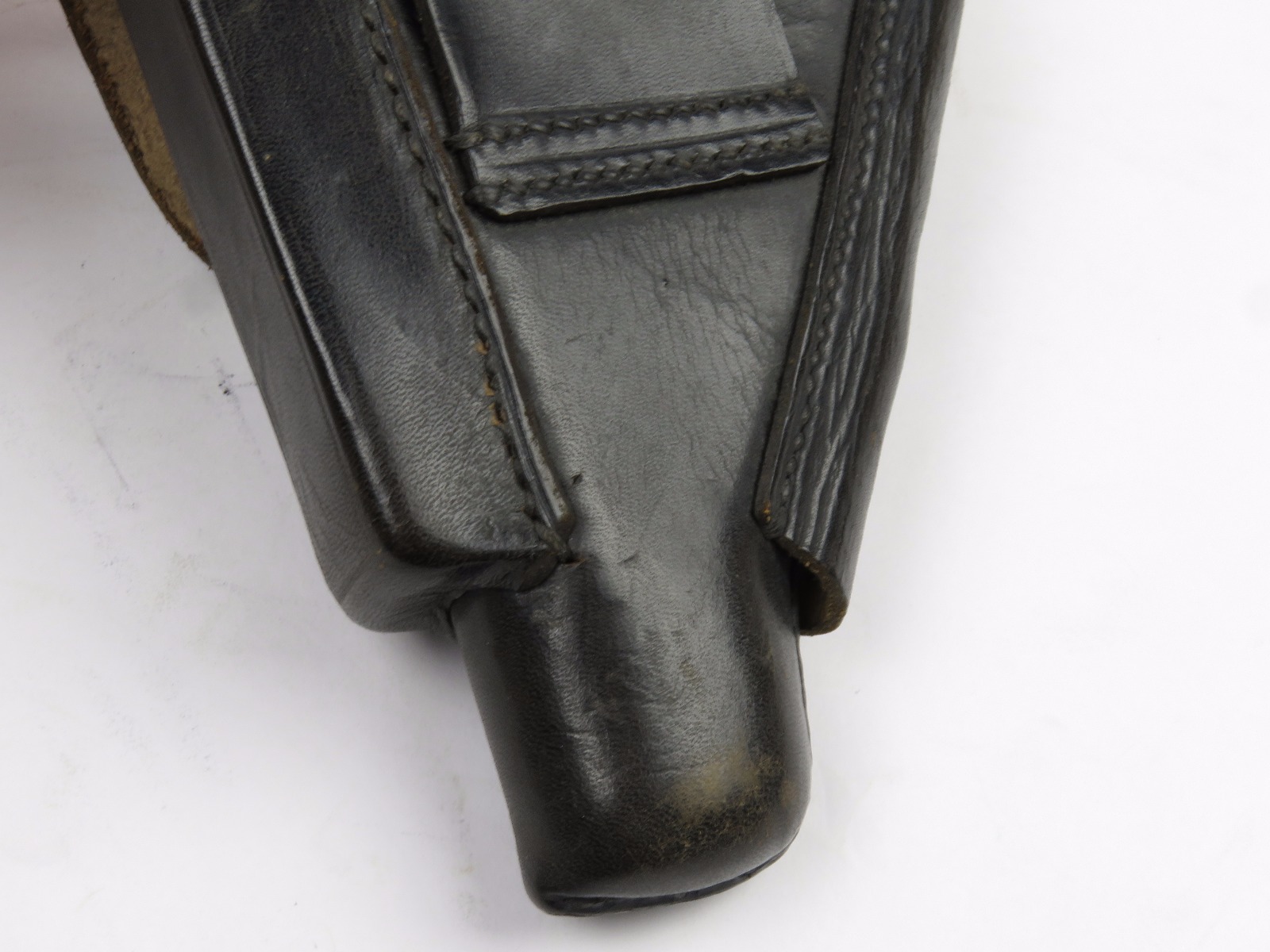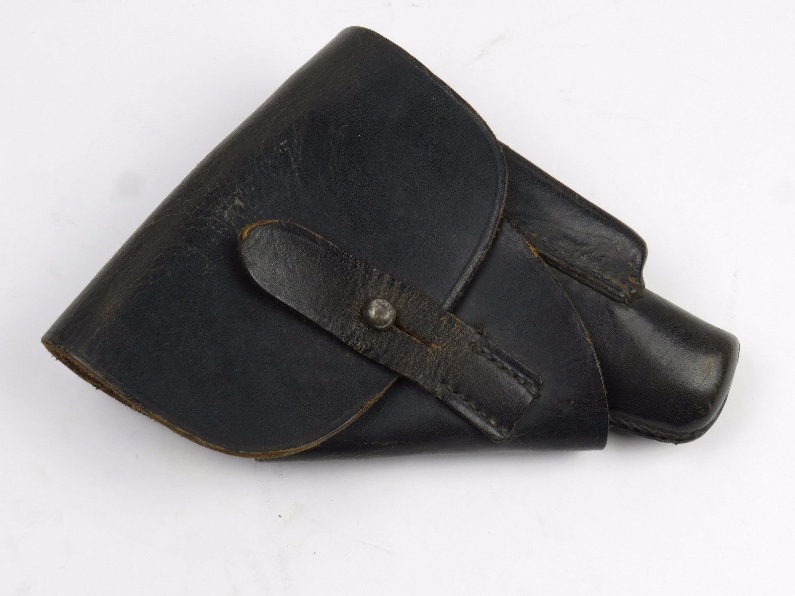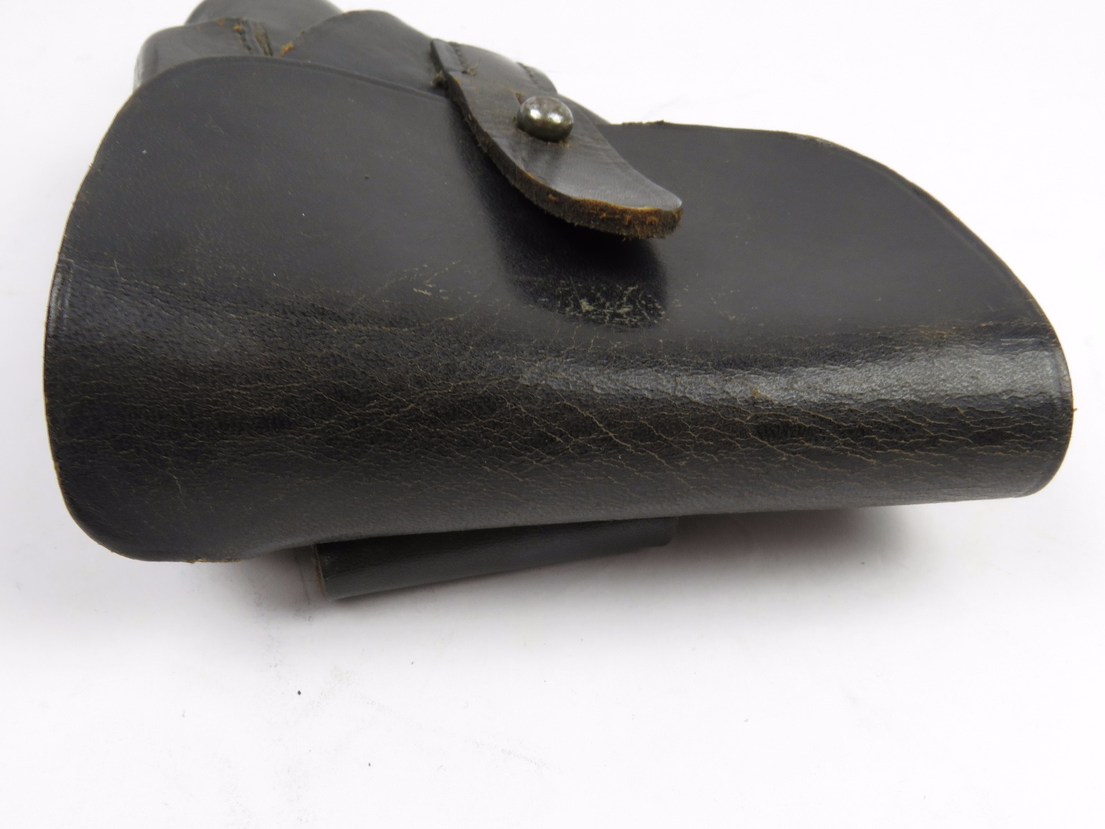 11/13/17 – This is an original WW2 production Walther PPK AKAH holster. The holster is leading edge, meaning the magazine pouch is on the side of the holster instead of in the front. This feature plus the black leather is speculated as “SS” issued among the collector community. The holster has firm leather that’s in great shape overall. The exterior leather has some wrinkling and surface wear, but the interior leather is near mint! The interior ink stamp is original and as nice as I’ve seen. There is also an AKAH DRGM stamp under the closure strap. The black stitching is all original and in tact as well. Free shipping on this item!