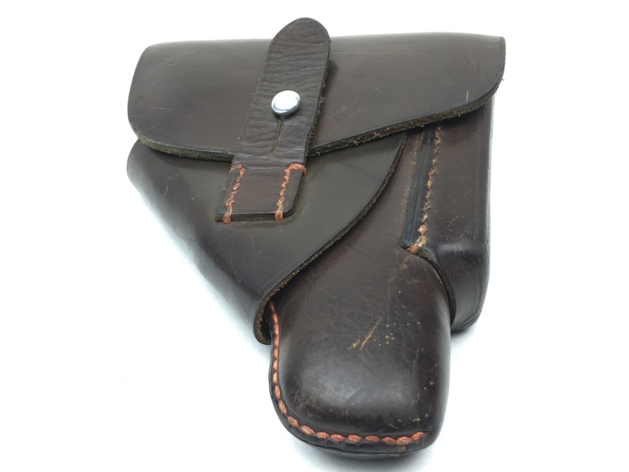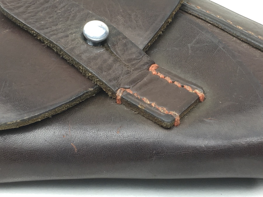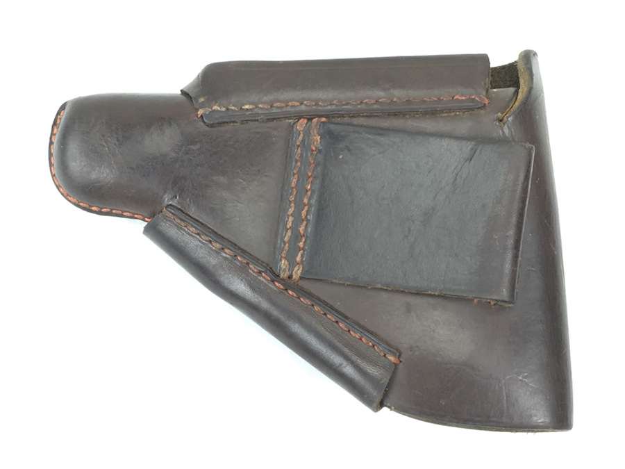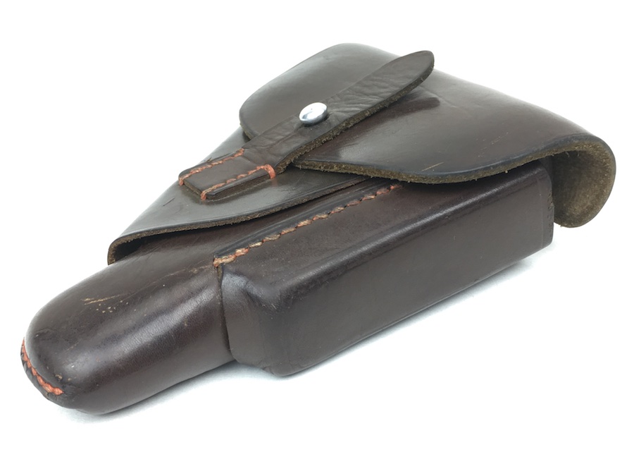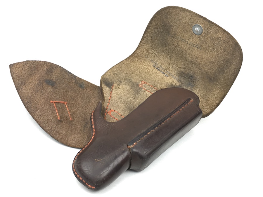 4/17/19 – This is an original and excellent condition AKAH D.R.G.M. Walther PPK leading edge holster. The brown leather is firm yet somewhat pliable. Minor wrinkling with a few surface scuffs, but appears to be normal use wear. Stitching is original and intact. The interior leather is clean with a personalized ink stamp. Appears to be a name and the German word for “Surgeon” The AKAH maker stamp under the closure strap is a strong, clean strike. The only minor flaw is a tiny impression under the make stamp where the back of the closure stud rests. Guaranteed original and authentic.