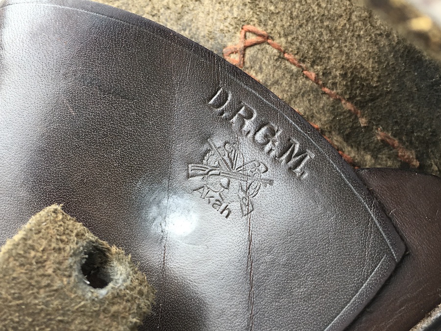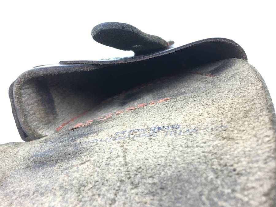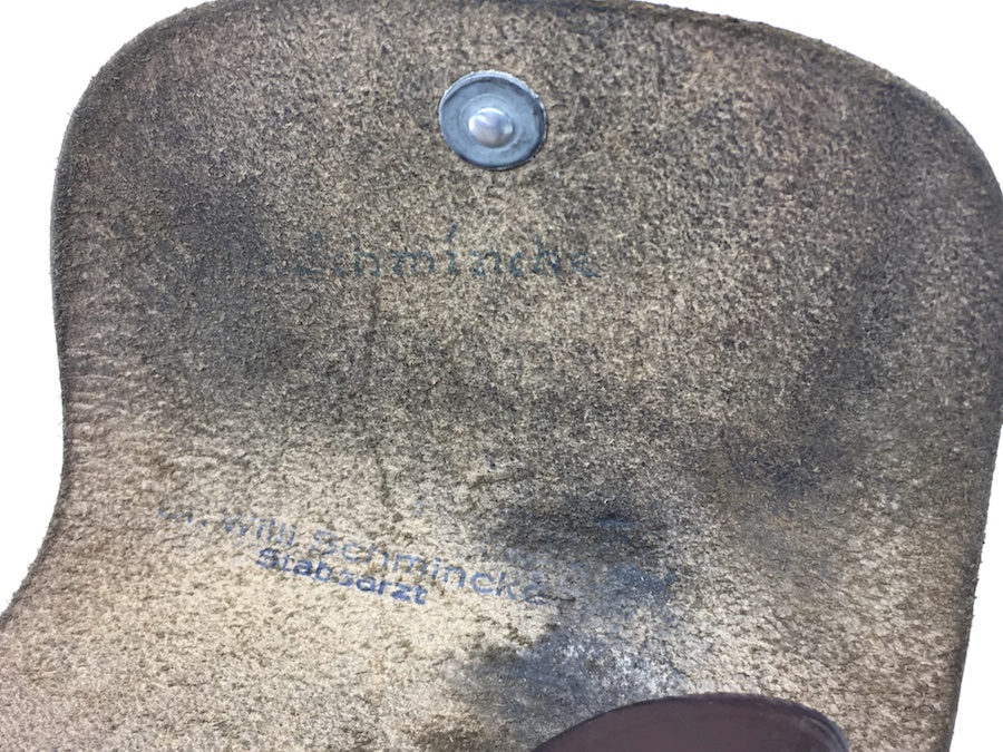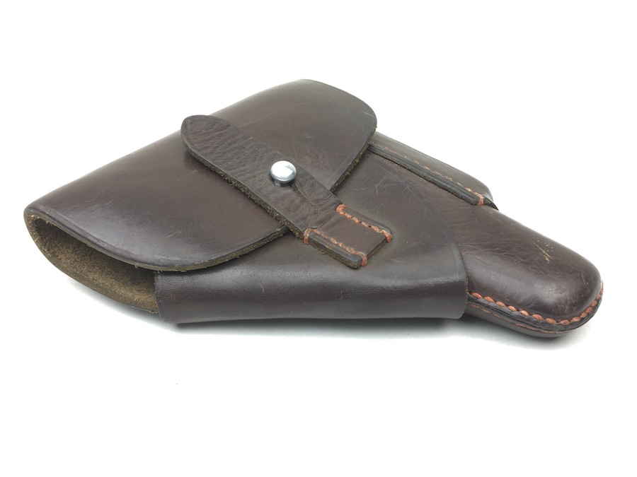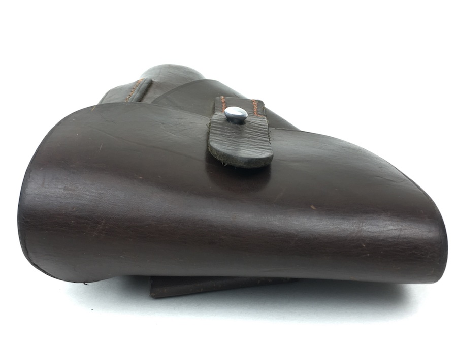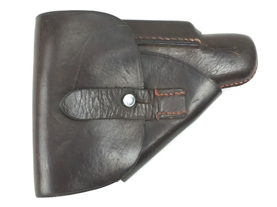 4/17/19 – This is an original and excellent condition AKAH D.R.G.M. Walther PPK leading edge holster. The brown leather is firm yet somewhat pliable. Minor wrinkling with a few surface scuffs, but appears to be normal use wear. Stitching is original and intact. The interior leather is clean with a personalized ink stamp. Appears to be a name and the German word for “Surgeon” The AKAH maker stamp under the closure strap is a strong, clean strike. The only minor flaw is a tiny impression under the make stamp where the back of the closure stud rests. Guaranteed original and authentic.