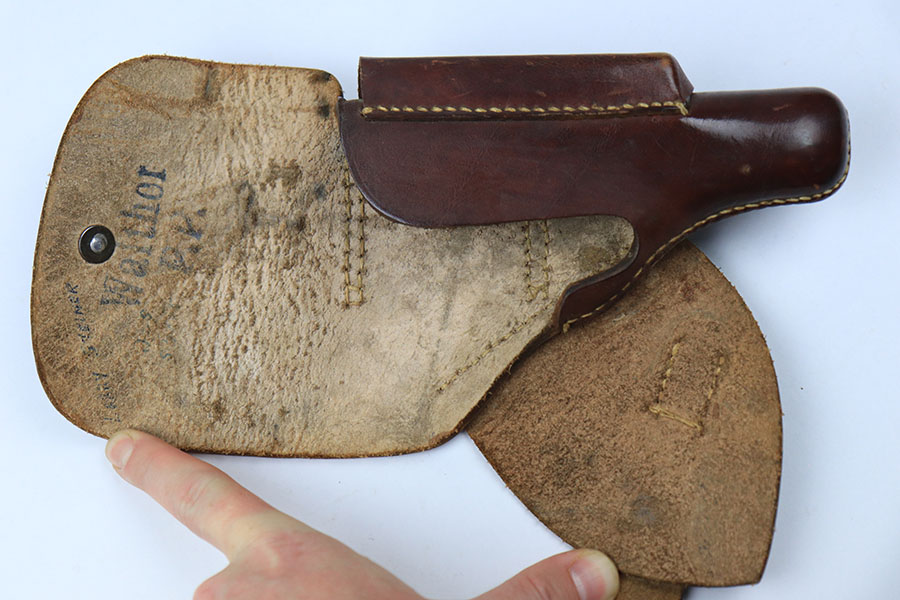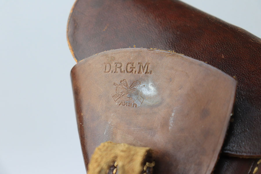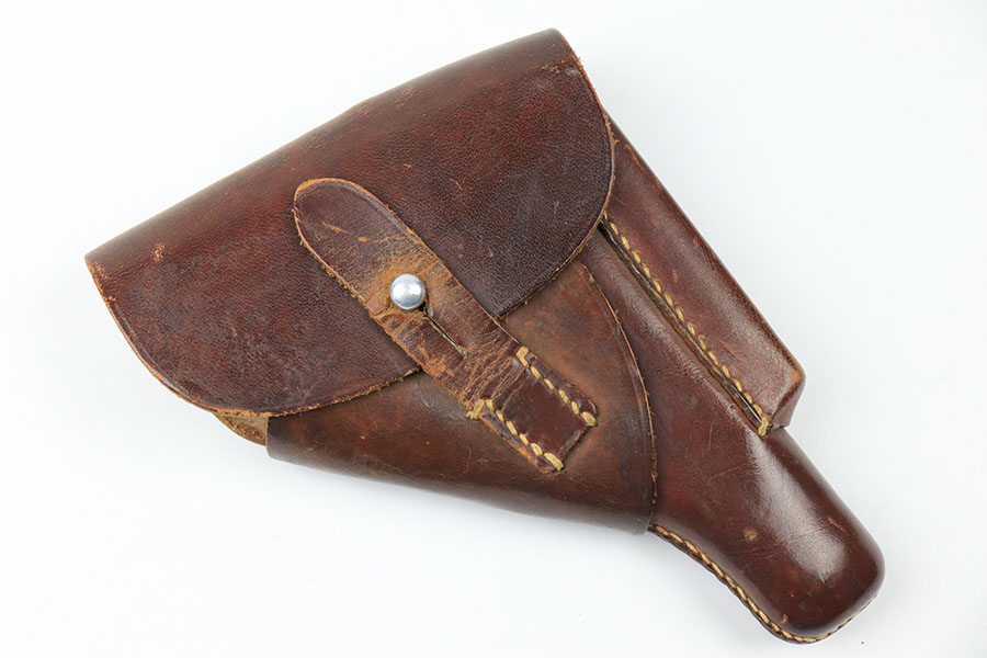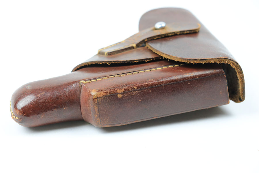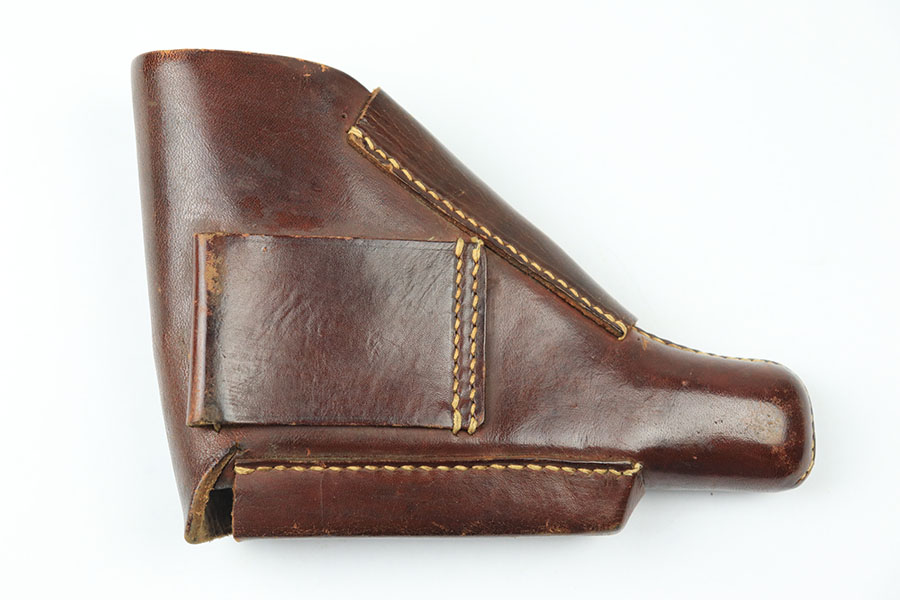 8/9/21 – This is an excellent condition Brown leather Walther PP Leading Edge AKAH holster. The holster is very clean, with strong leather and excellent stitching. The leather has some mild surface scuffs but no major issues. The interior leather shows the original Walther PP ink stamp and has a name / serial number lightly written inside. AKAH stamped under the closure strap. Has an excellent wartime aluminum stud. A high-end collectible example.