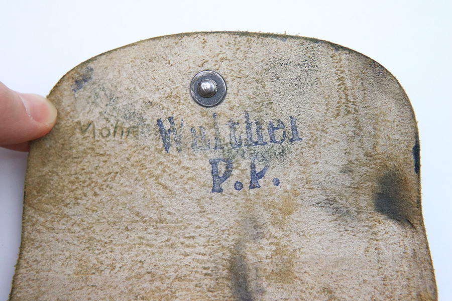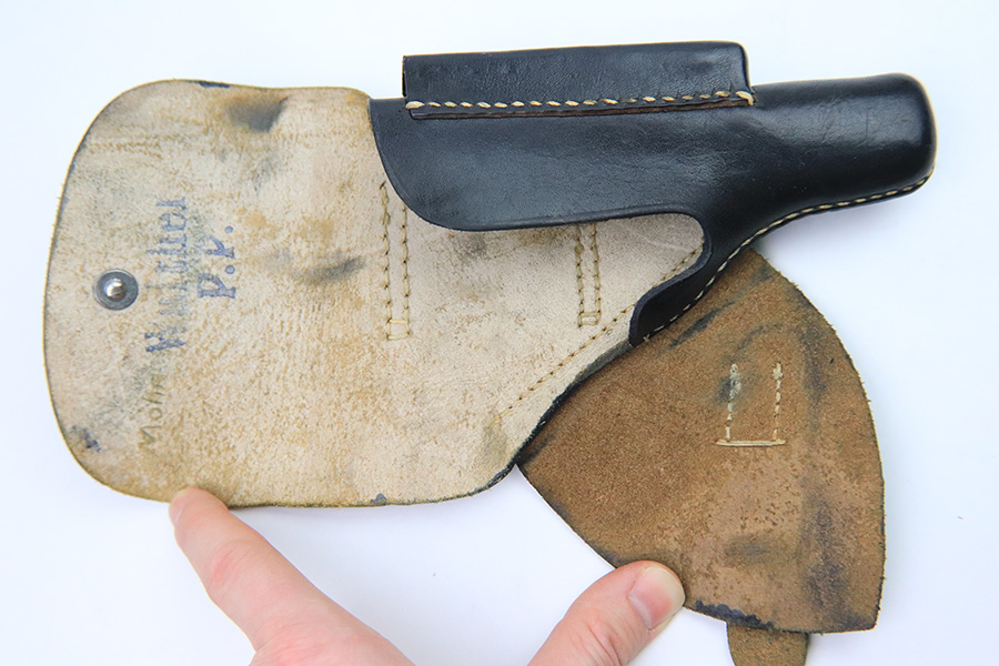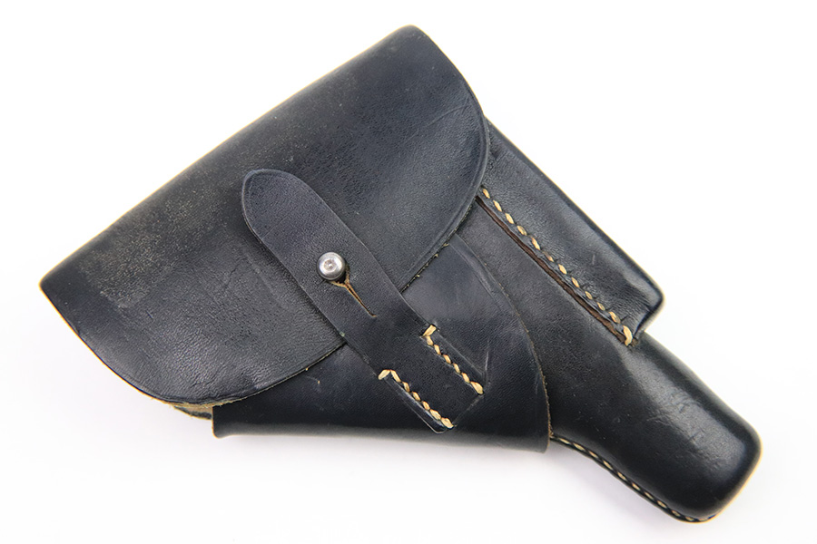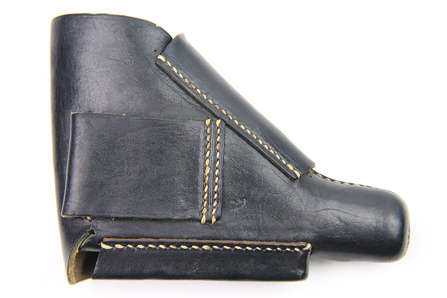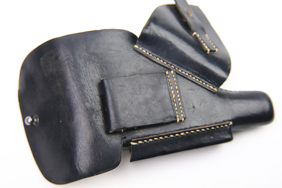 3/13/22 – This is an excellent example of a black leather leading edge style AKAH Walther PP holster from WW2. The holster has very clean black leather and all original straw colored stitching intact. There’s a maker stamp under the closure strap that’s somewhat worn from use wear, but the DRGM is still crisp. The interior Walther PP ink stamp is still clearly visible as well. The leather has normal pliability and some mild wear around the top leather but no cracking or notable damage.