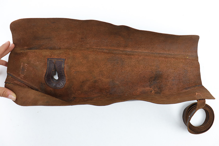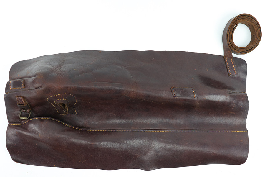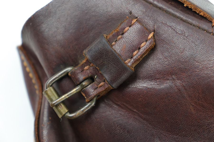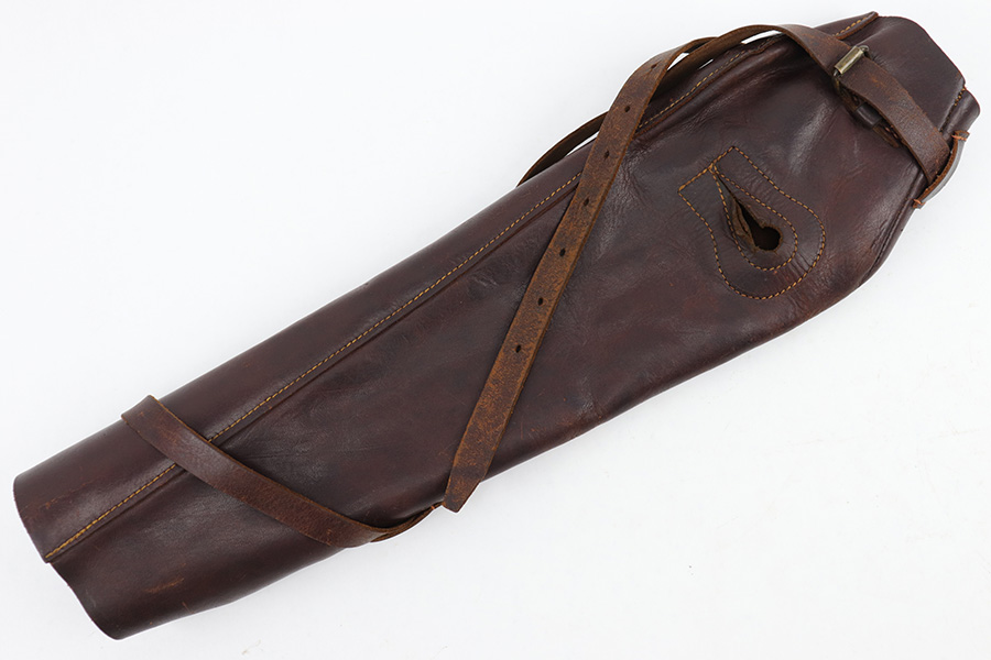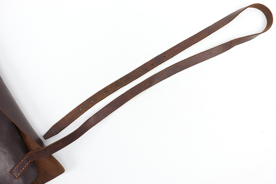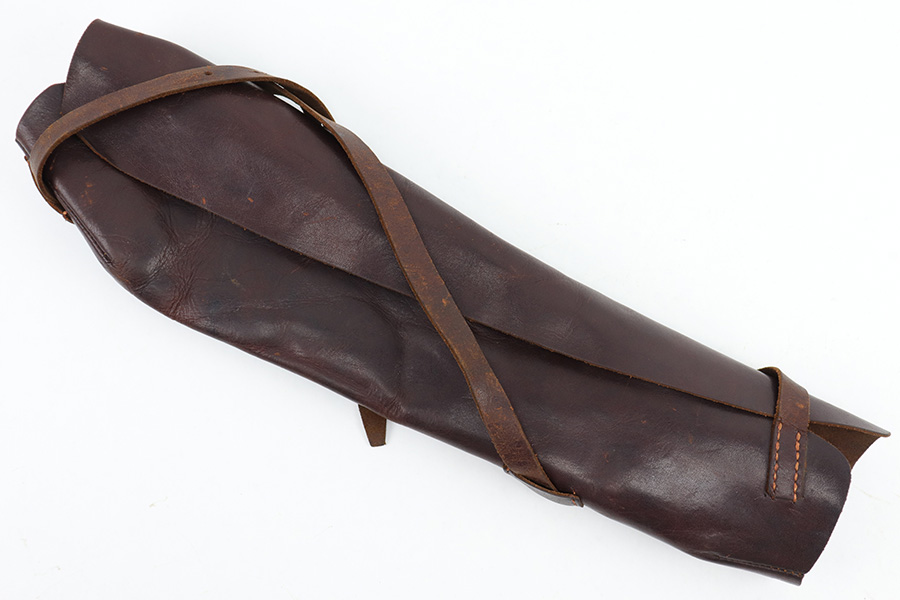 4/7/23 – This is an unmarked leather K98 action cover. The leather is soft and pliable and shows natural signs of aging such as light surface wrinkling and mild scuffs as well as light wrinkling on the leather strap. The closure clasp is nonmagnetic brass and has an aged look. This could possibly be pre WW2 production due to style and condition, but there are no markings to confirm this. Excellent stitching throughout.