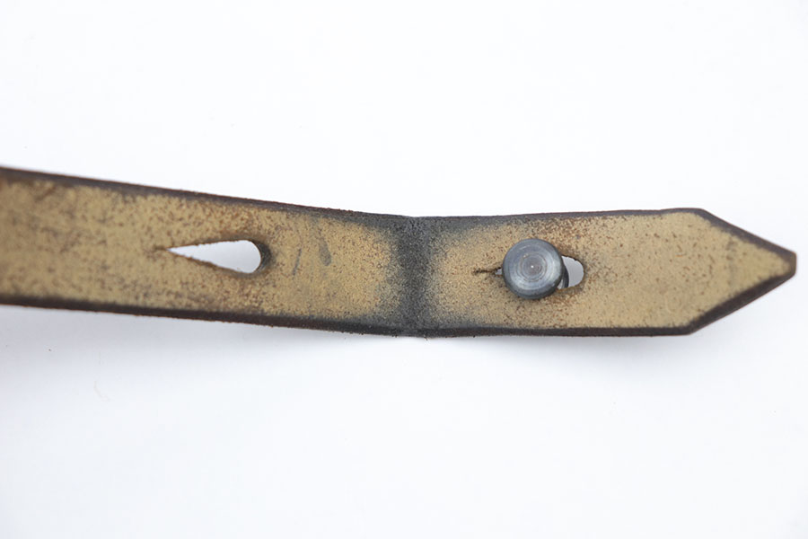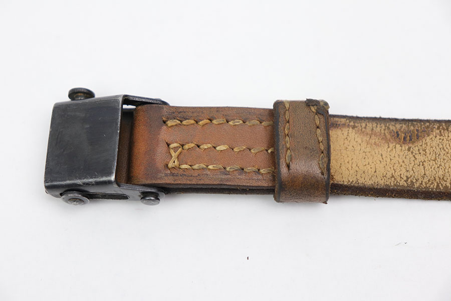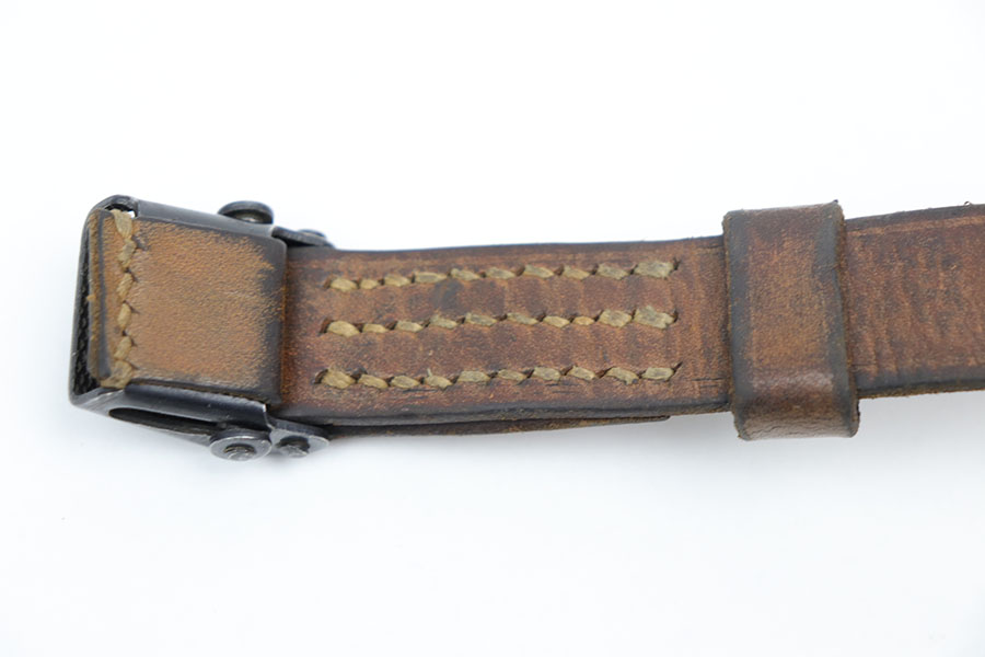 12/7/20 – This is an unmarked WW2 era production K98 rifle sling. The sling is light brown leather and very clean with normal signs of aging but no weak areas or major flaws. No markings, which potentially means this isn’t German production, but instead Norwegian. We’re not 100% sure, and have priced accordingly. Definitely a period correct piece regardless.