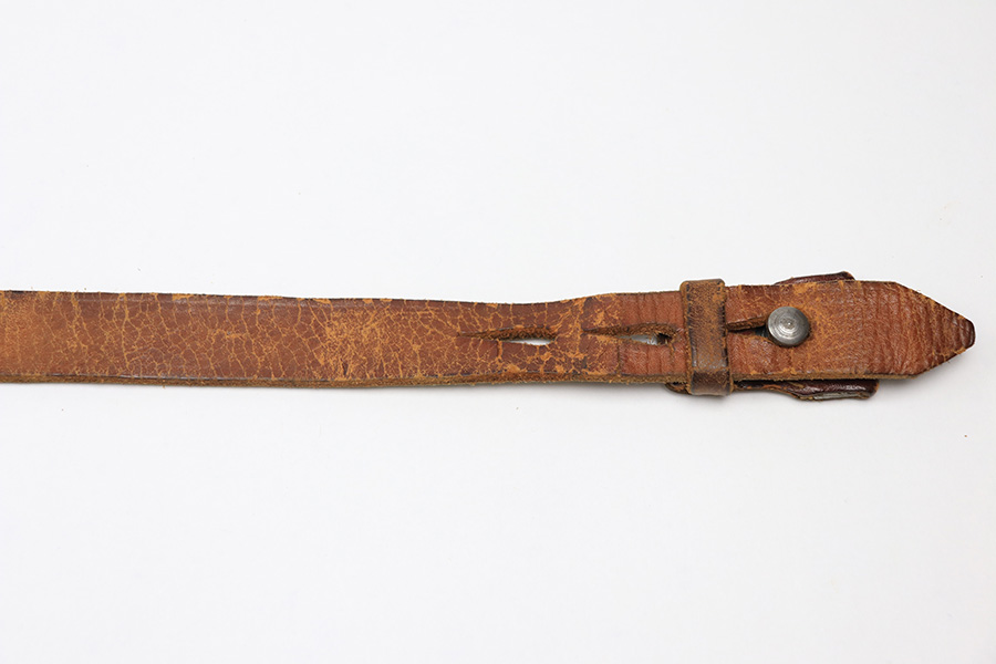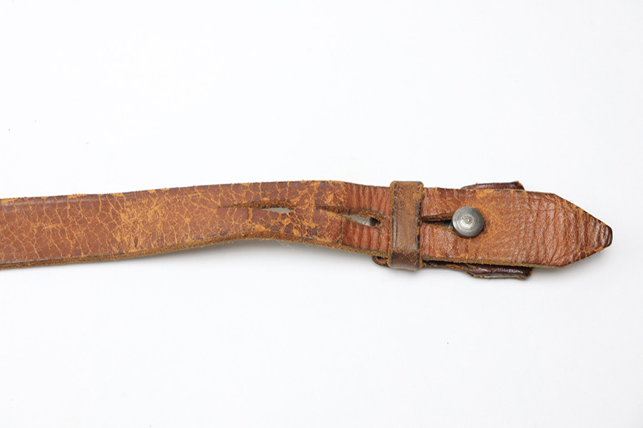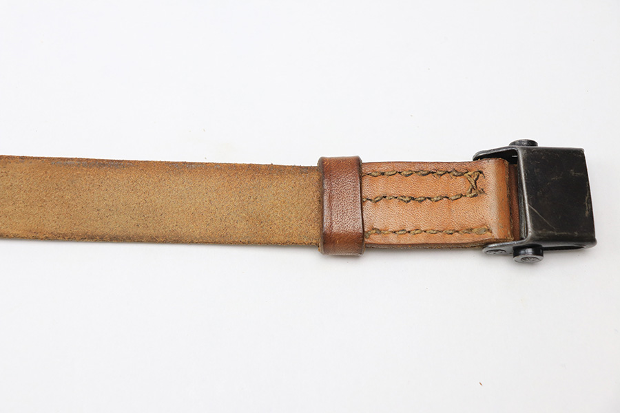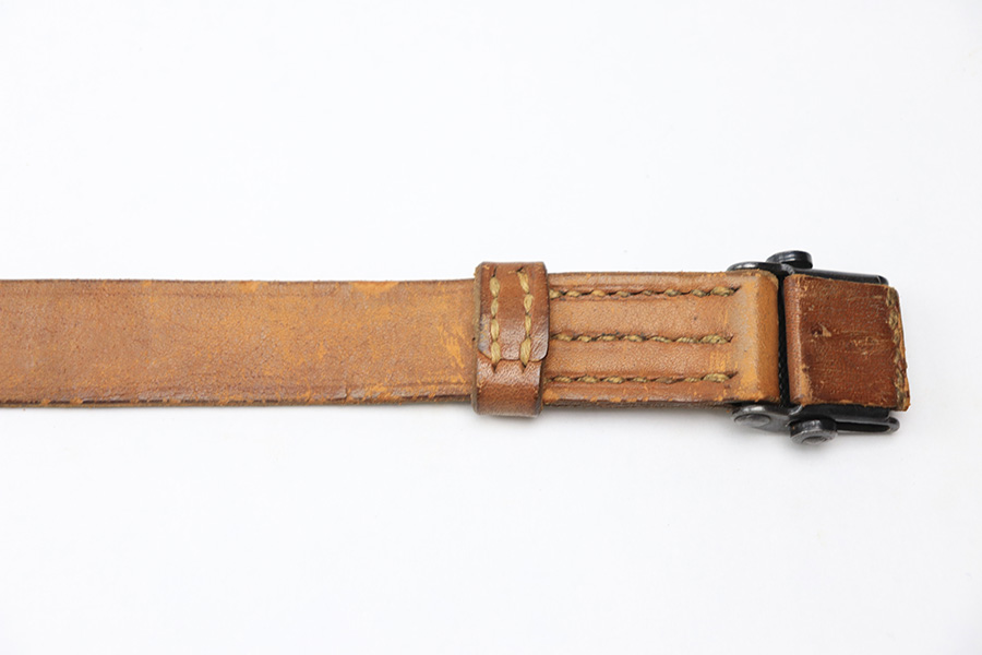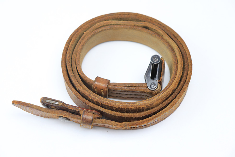 1/5/22 – This is an original leather K98 sling from WW2. The sling has nice light brown leather that is completely in tact. There is some surface wrinkling and mild cracking in various areas of the leather, but this doesn’t affect functionality and the sling overall is structurally sound. Nice stitching as well. Comes with a leather keep as shown. Measures about 49.5 inches overall.