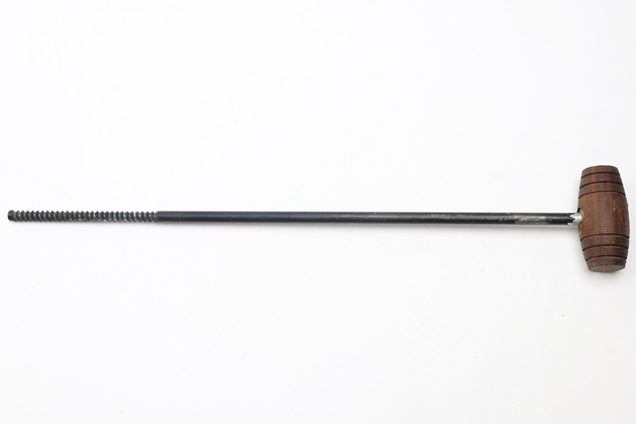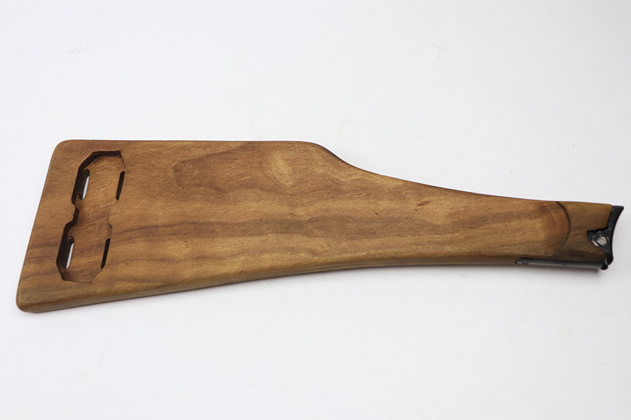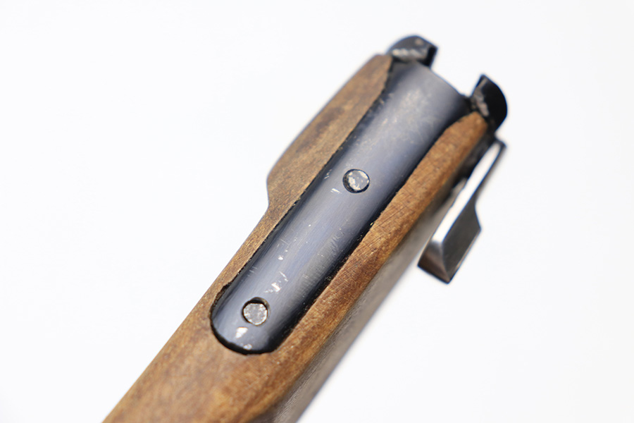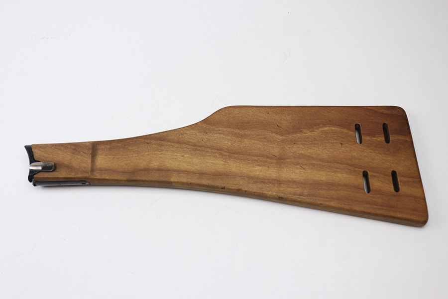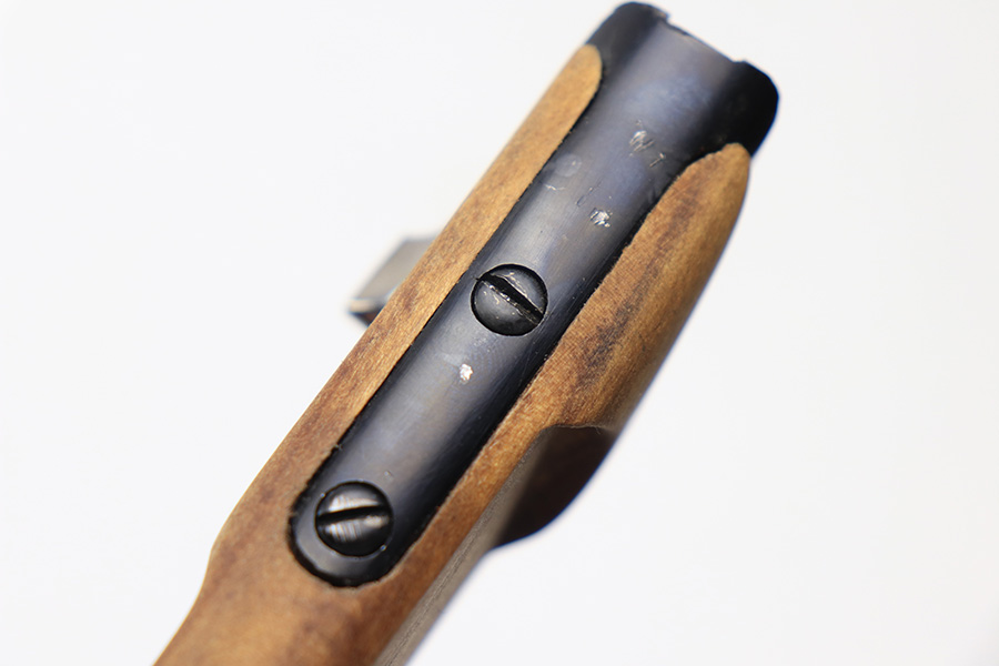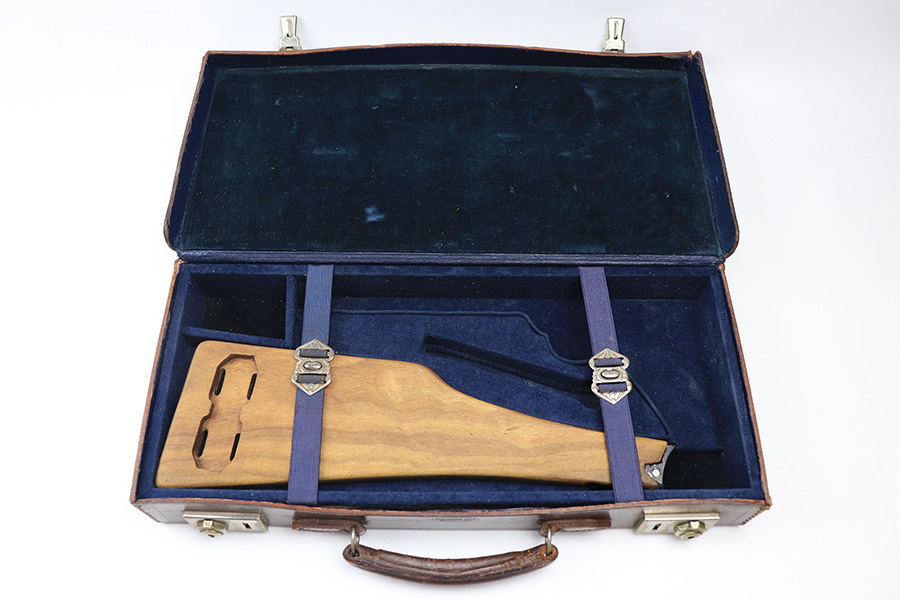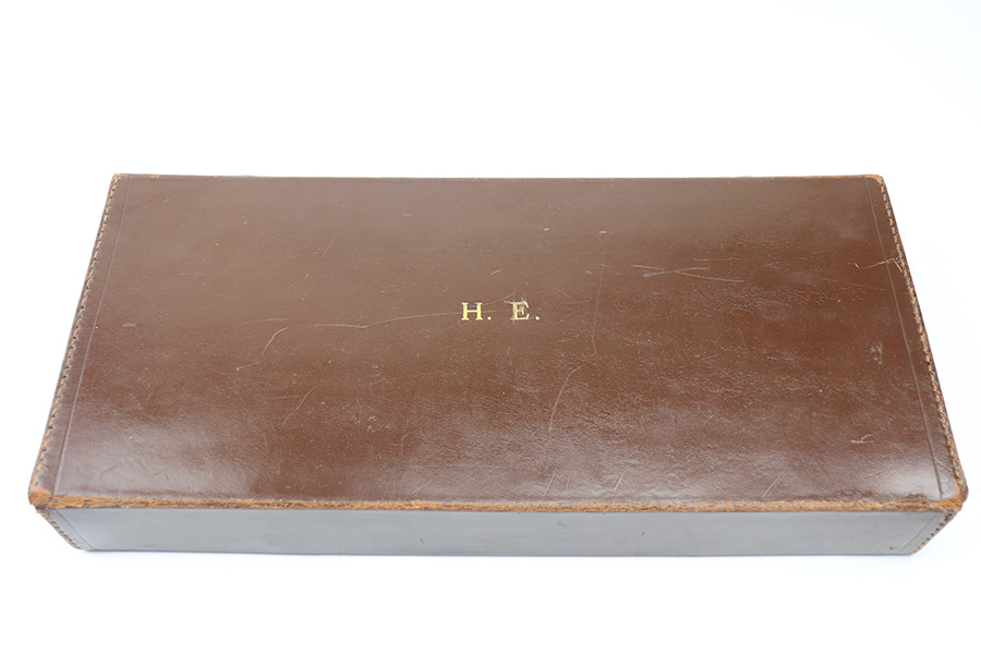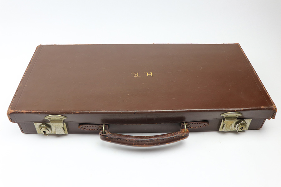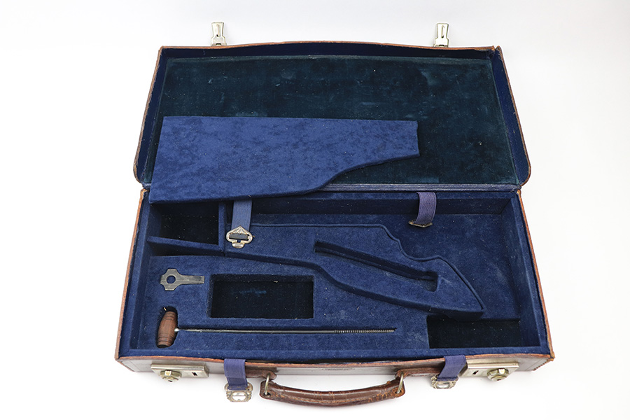 1/13/22 – This is a nice example of a custom Luger case from the 1920’s – 1930’s. The leather of the case is in overall good condition, showing light wear and age throughout. The stitching on the exterior has areas where threads have worn away, but is in okay condition overall. The top of the case is embossed with gold lettering, showing initials “H.E.”. The blue cloth interior is in good condition, showing minor signs of age and wear throughout. The case comes with a stock, tool, and cleaning rod, but all three items are reproduction examples with unknown manufacture date. The case is intended for an artillery luger based on the length of the compartment.